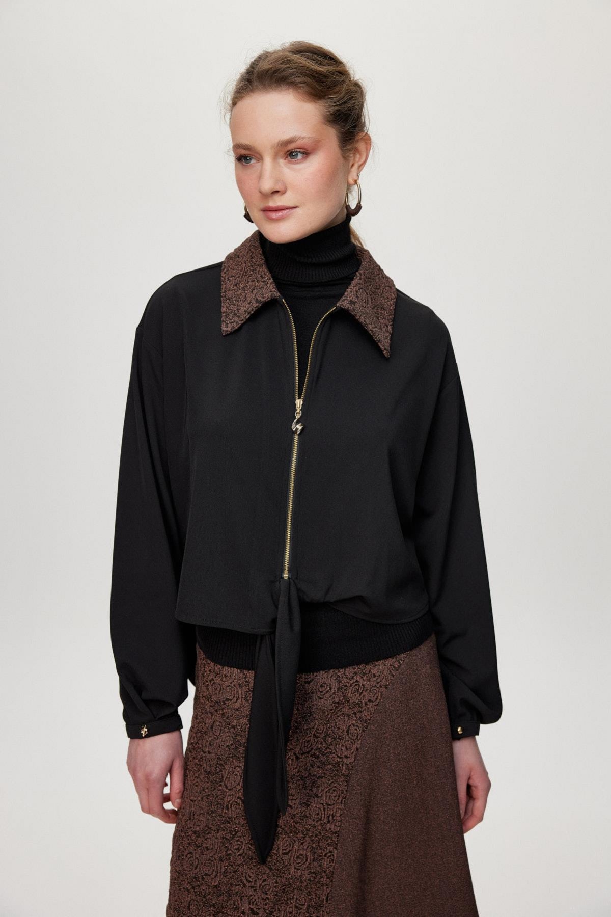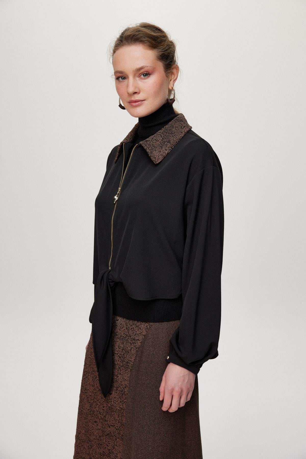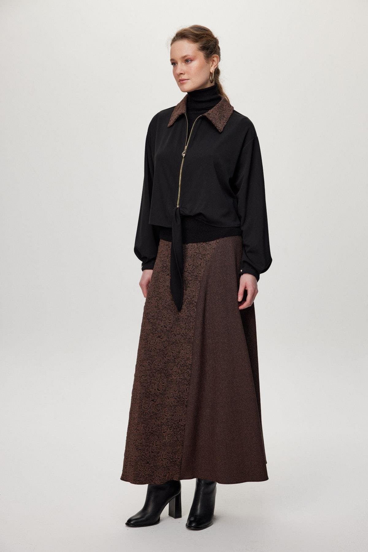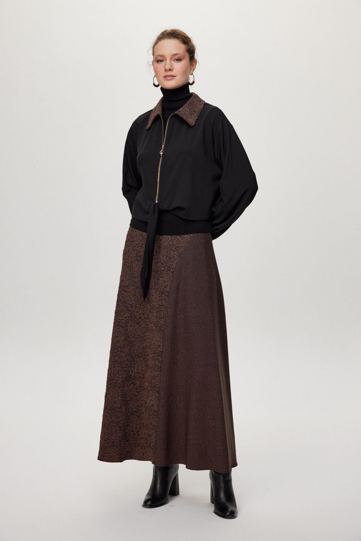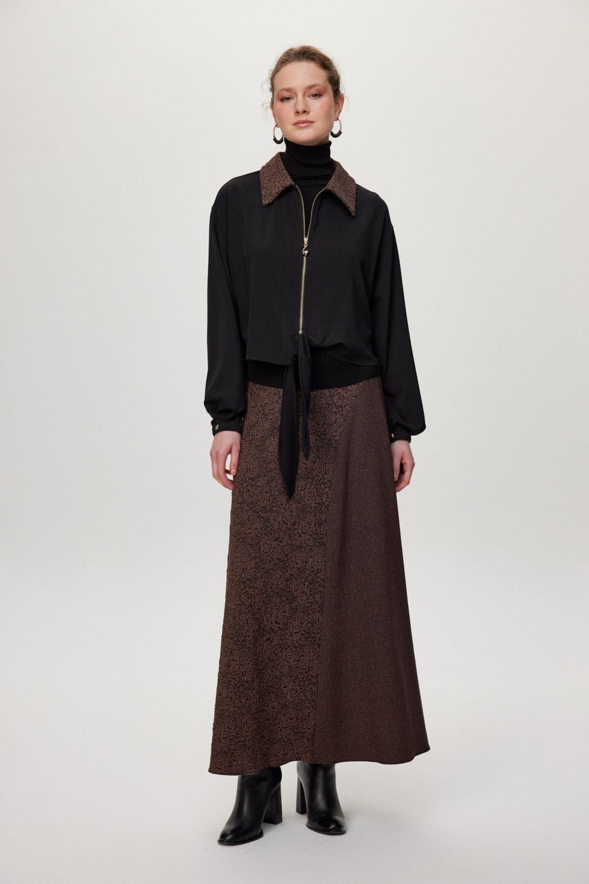 Ürün Detayları: Desenli yaka, Fermuar detaylı, Bağlamalı ön kısım, Kontrast desenli etek, Uzun kesim