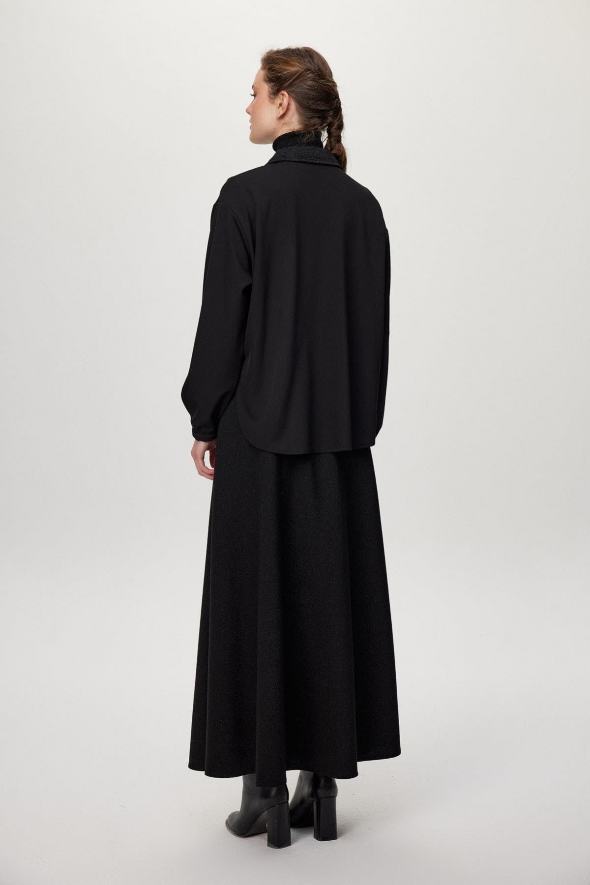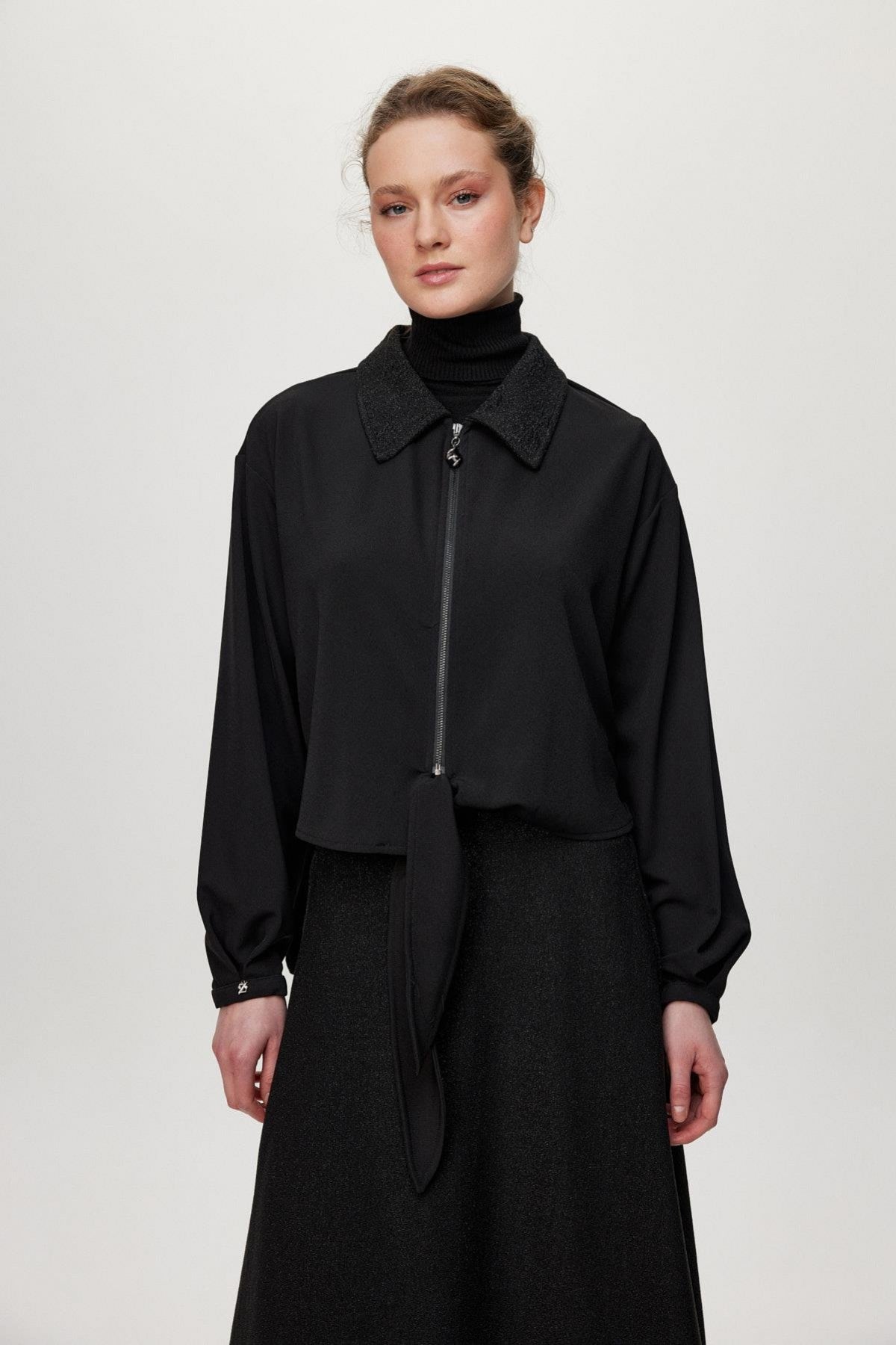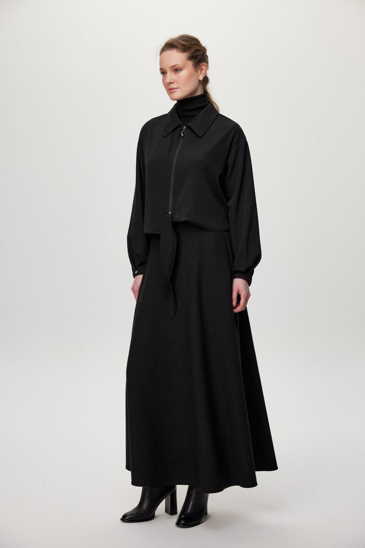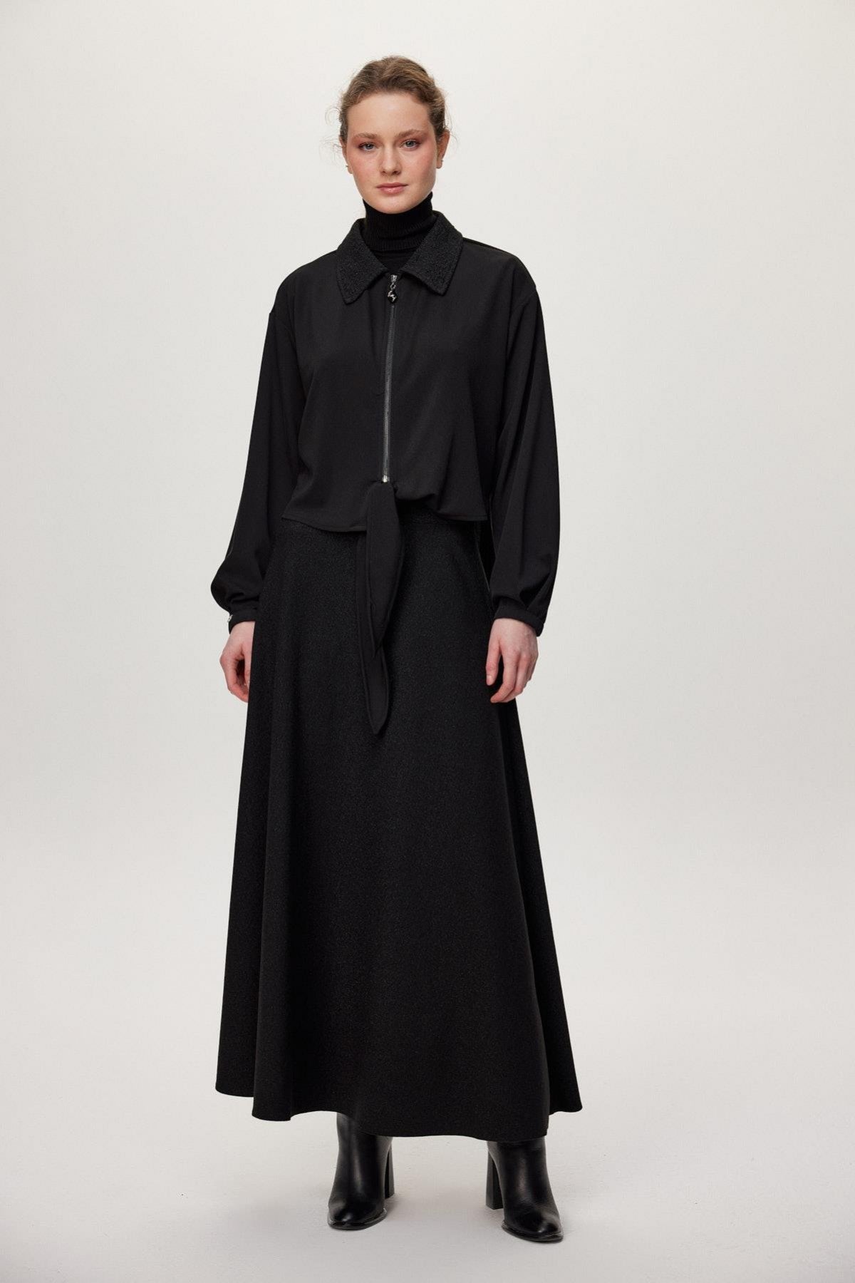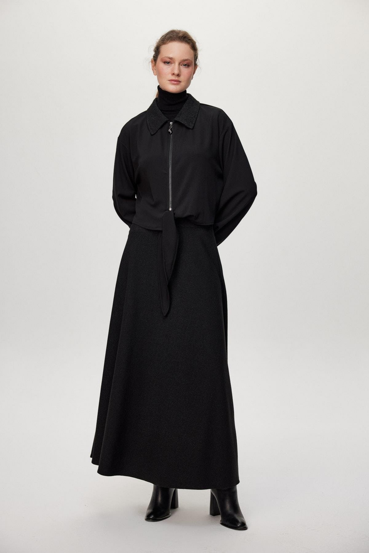 Ürün Detayları: Desenli yaka, Fermuar detaylı, Bağlamalı ön kısım, Kontrast desenli etek, Uzun kesim