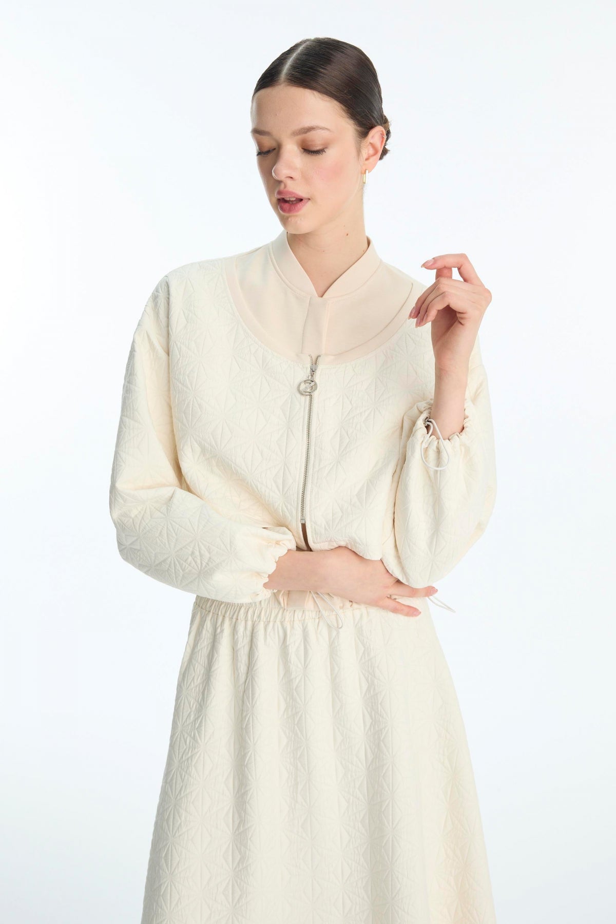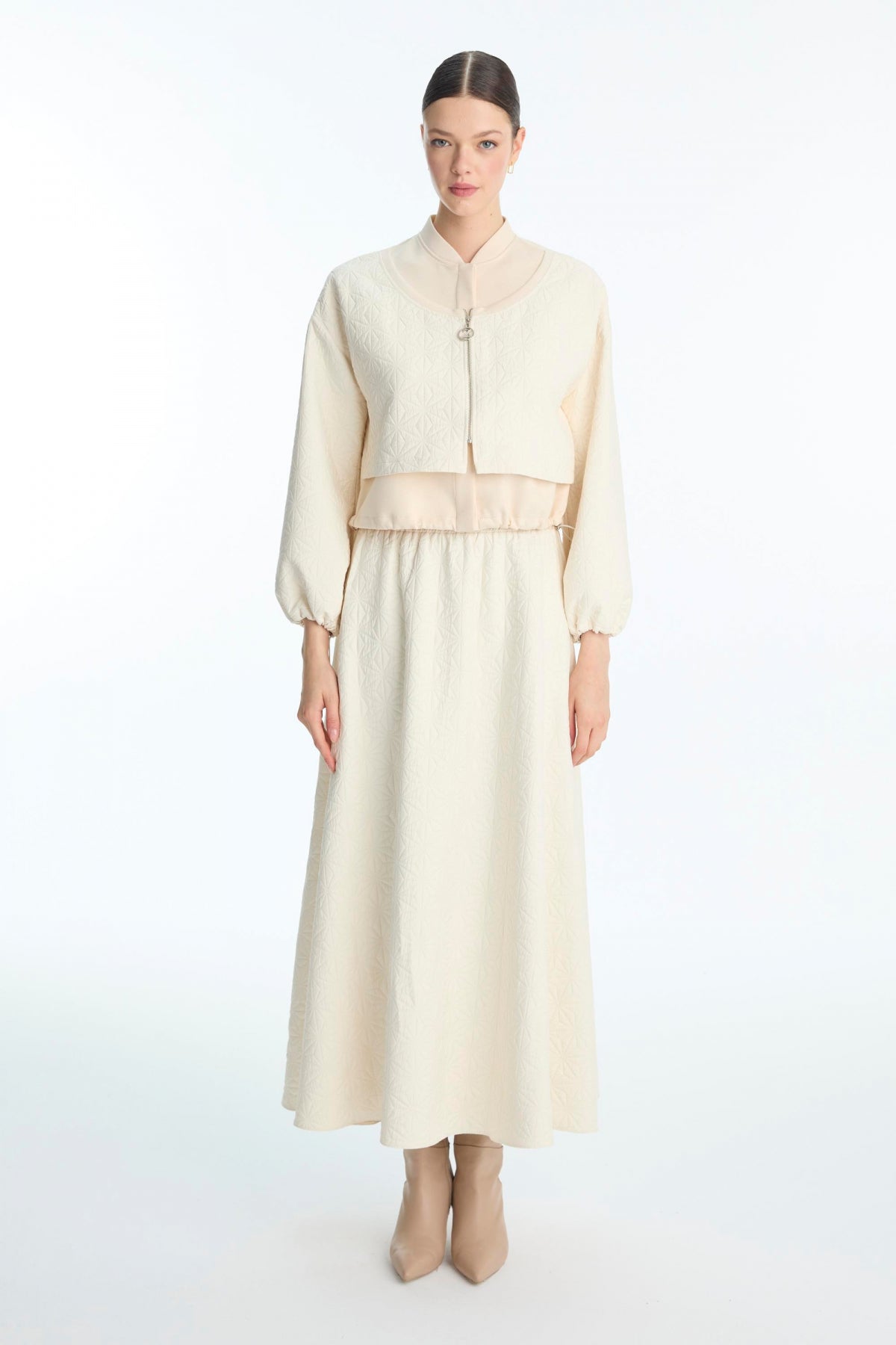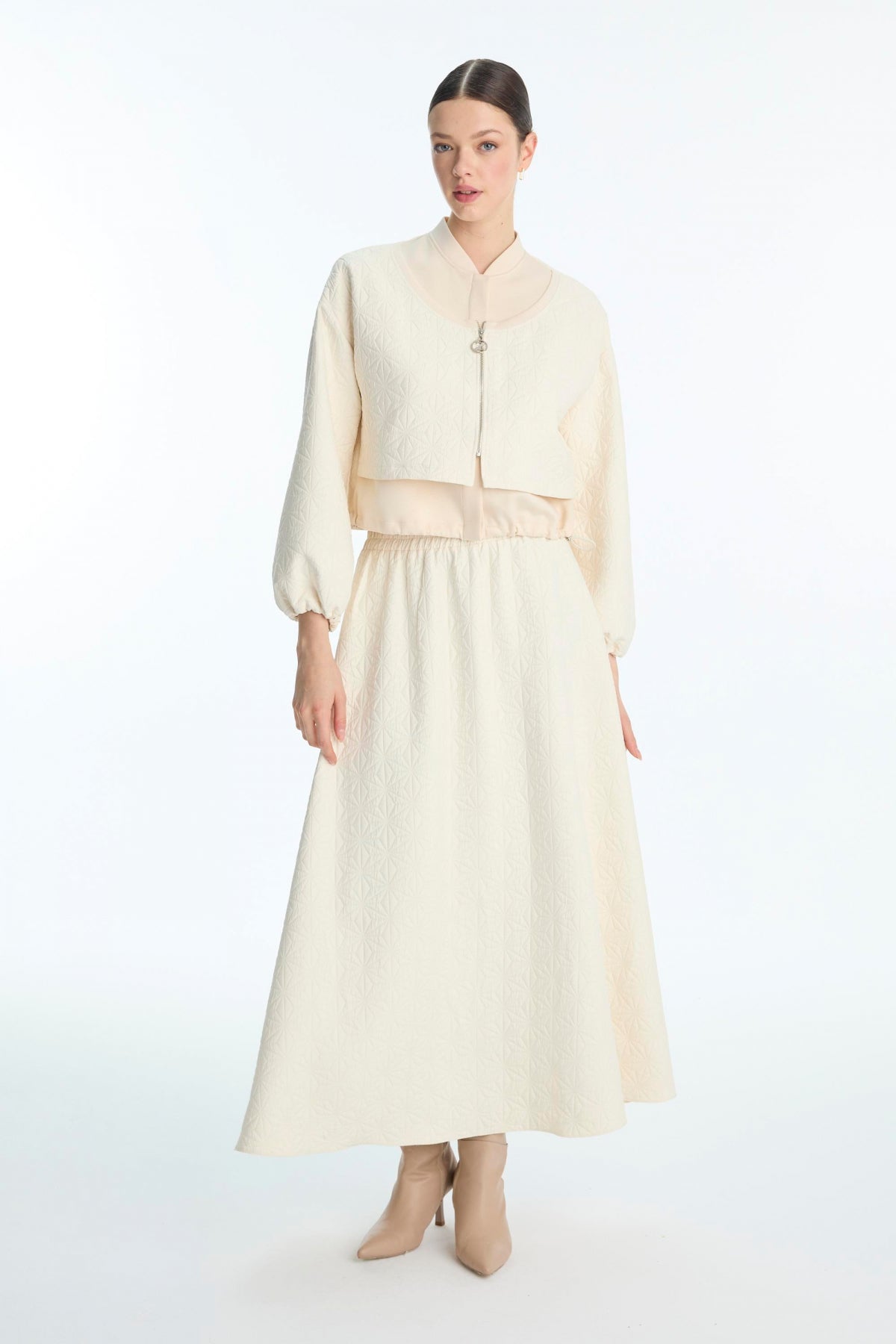 Jakar Desenli Belden Lastikli Ceket Etek Ikili Krem Takım 1688