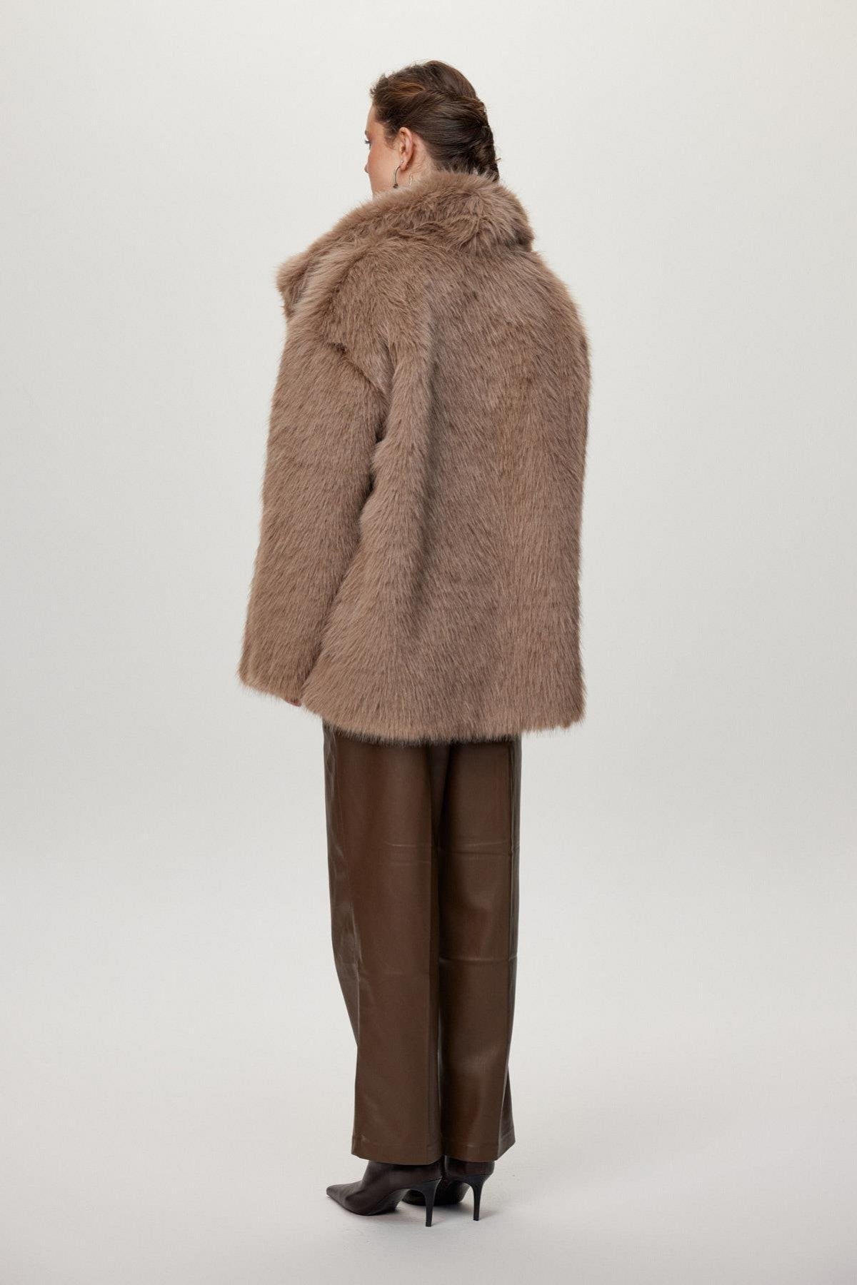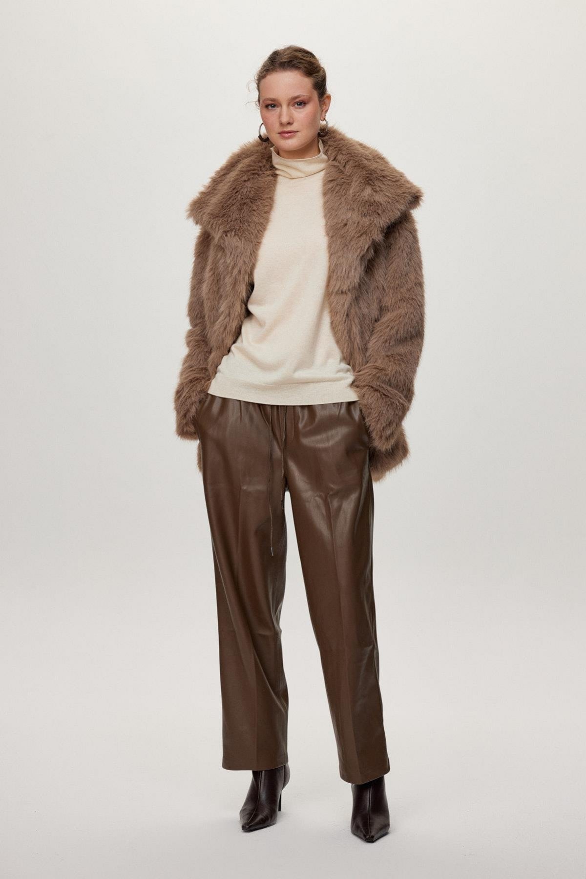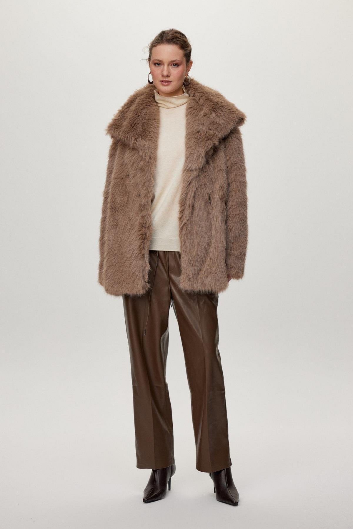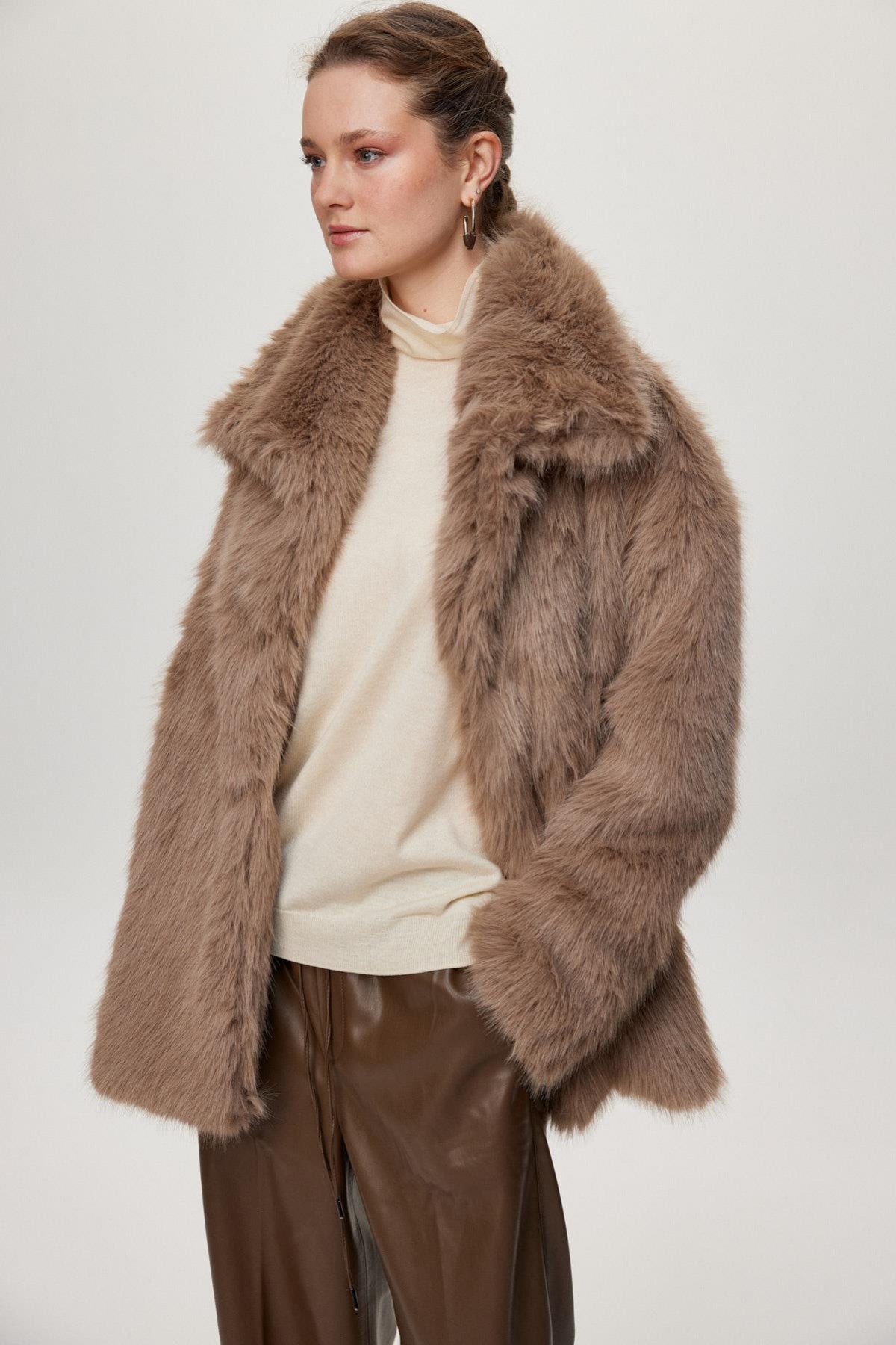 Ürün Detayları: Suni kürk, Geniş yaka, Peluş dokulu, Yan cepli, Astarlı, Kısa kesim