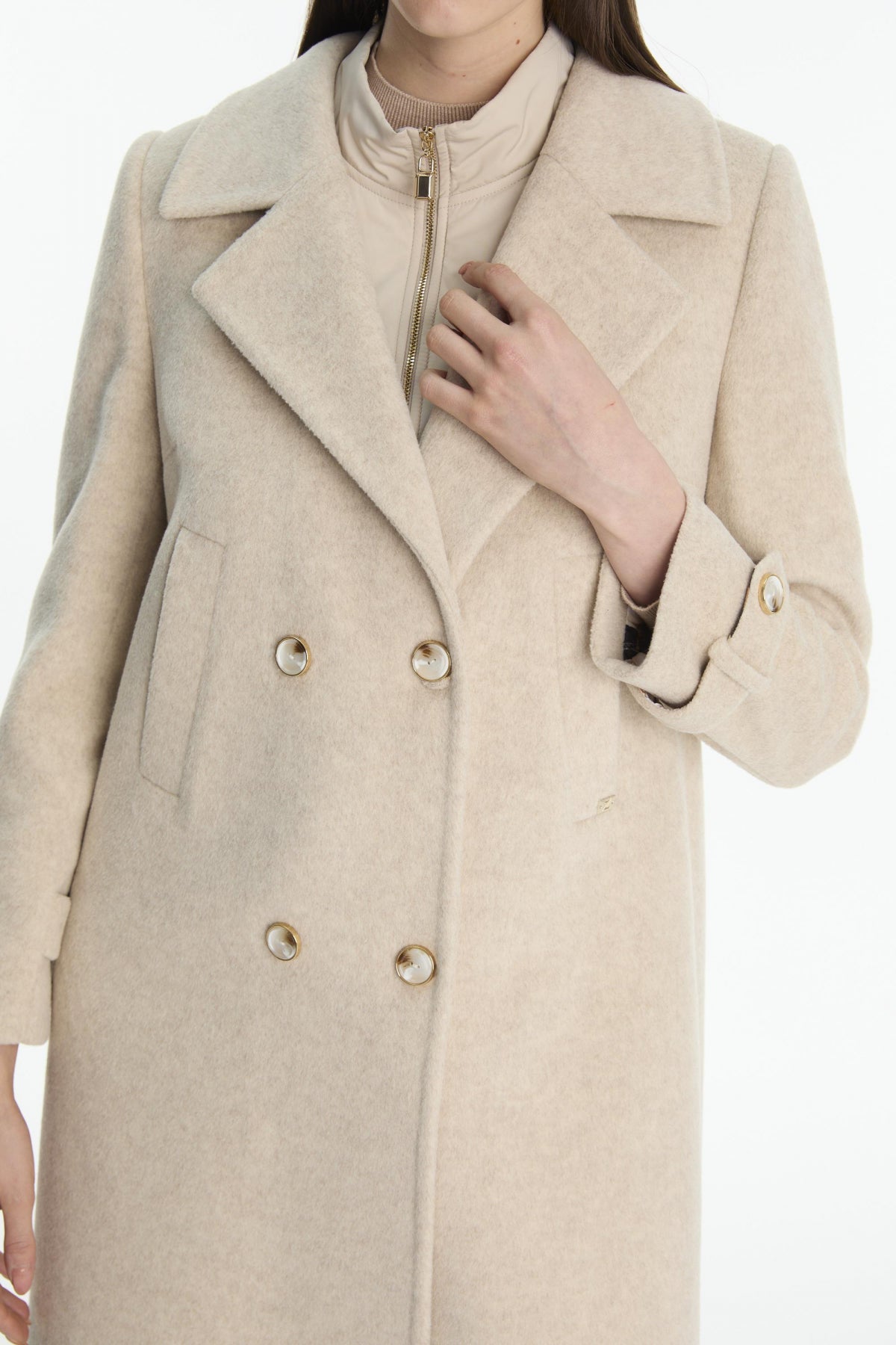Kruvaze yaka – Kapitone iç detay – Çift sıra düğmeli – Cepli – Uzun boy – Tokalı kol manşeti – Düz kesim