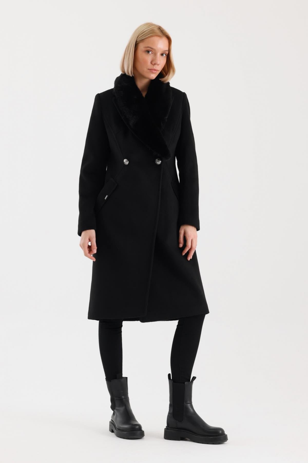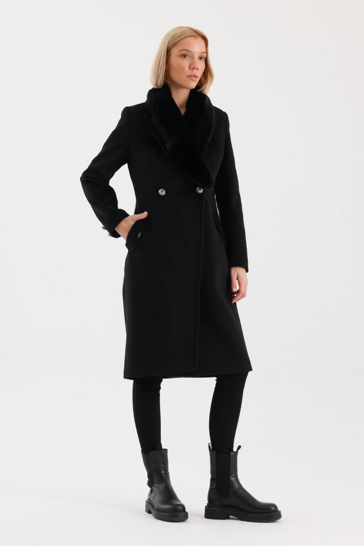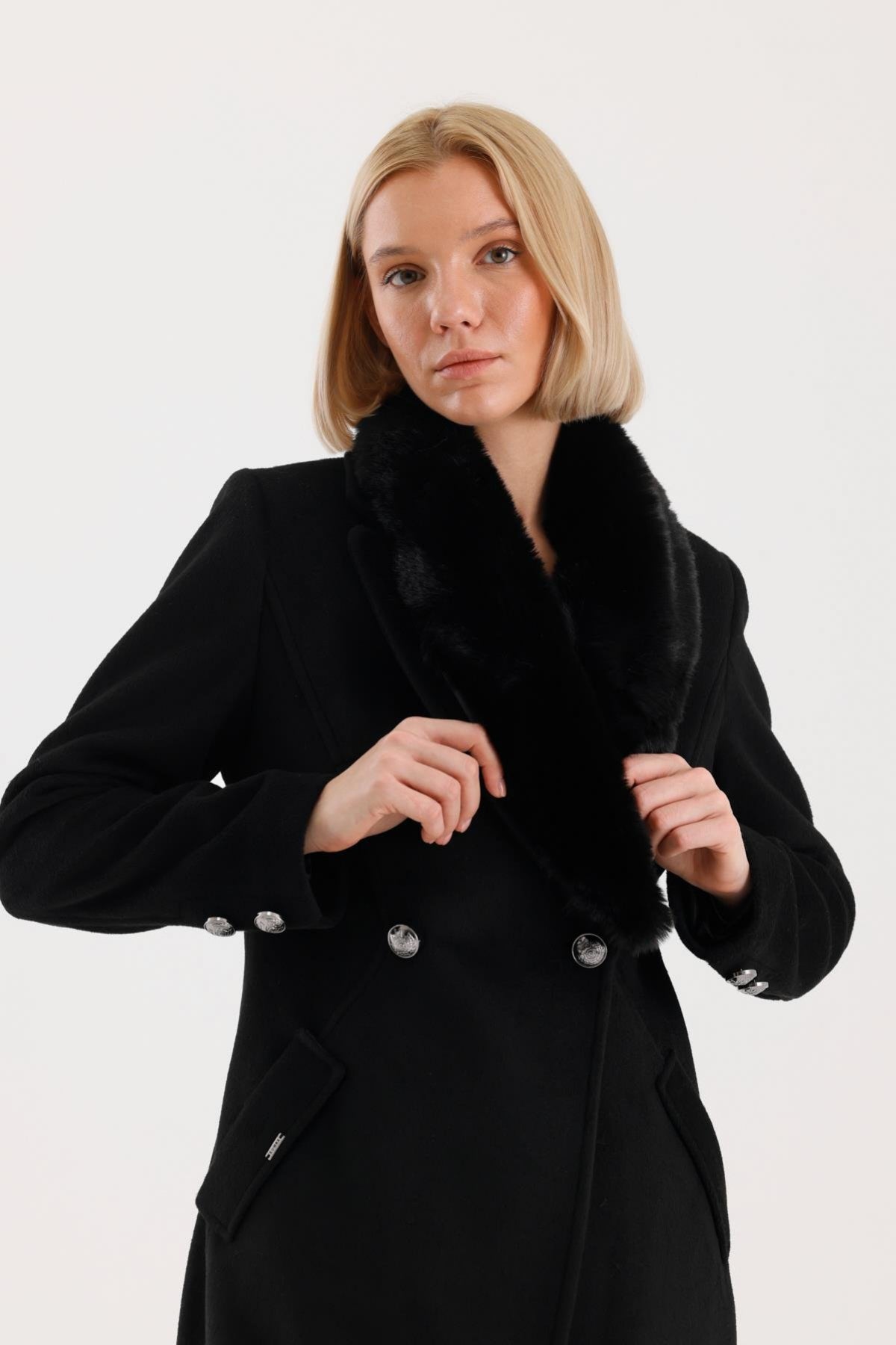 Kürk Yaka Cep Detaylı Kaşe Kaban Siyah Kaban 13092