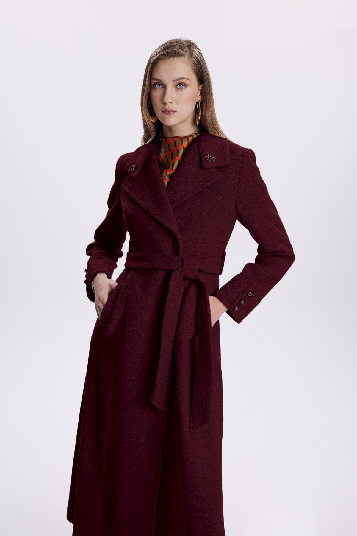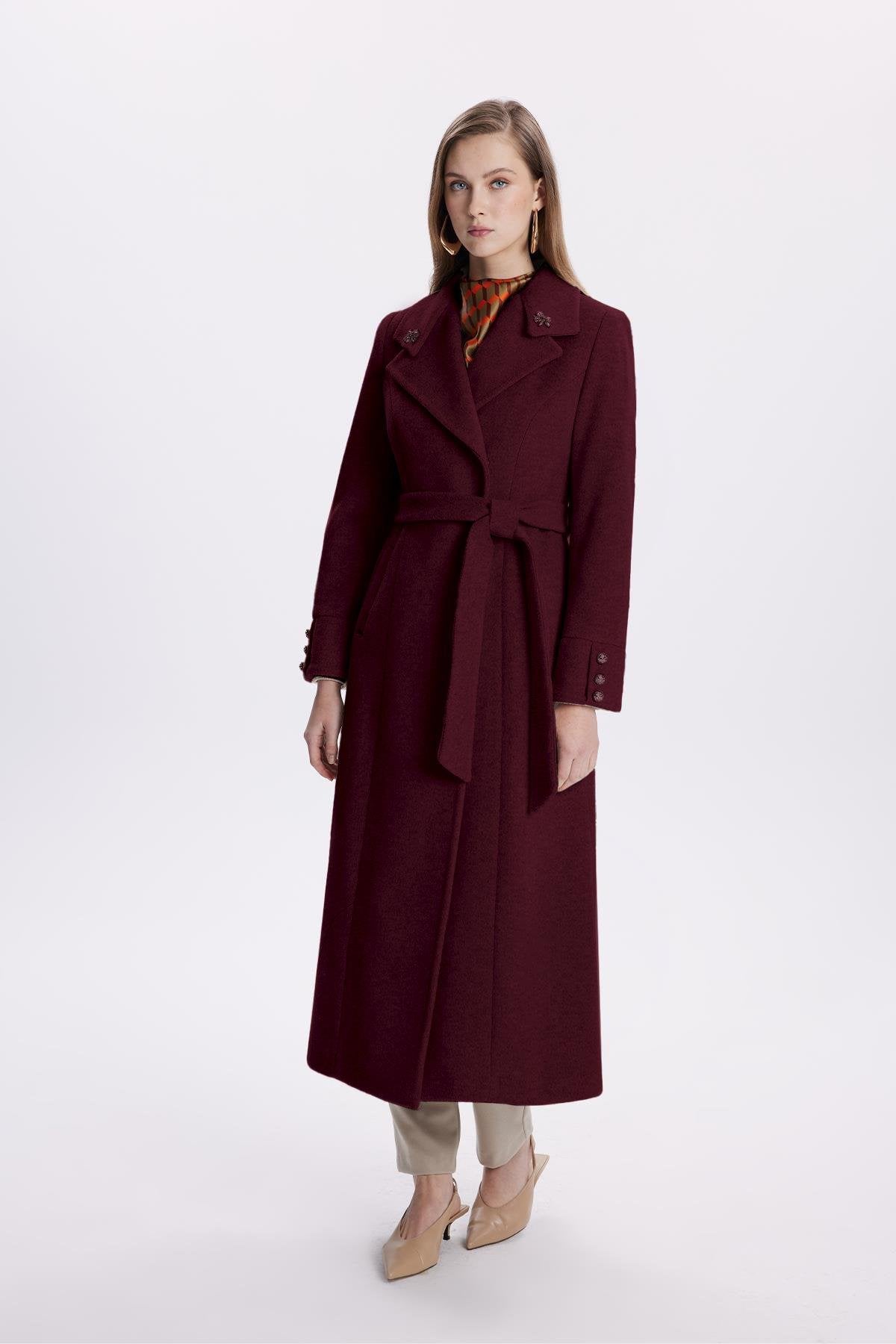 Taş Işlemeli Yaka Detaylı Kuşaklı Mürdüm Kaban 13655