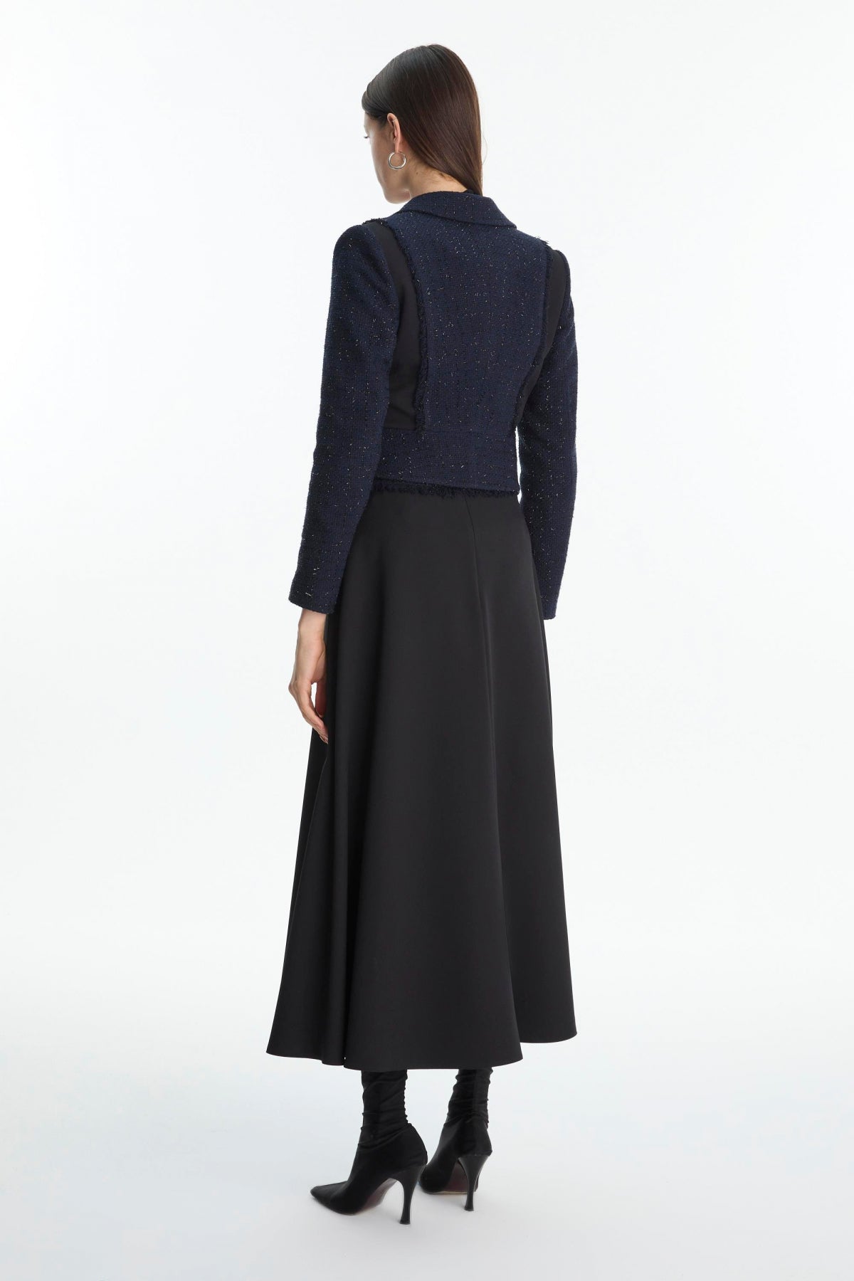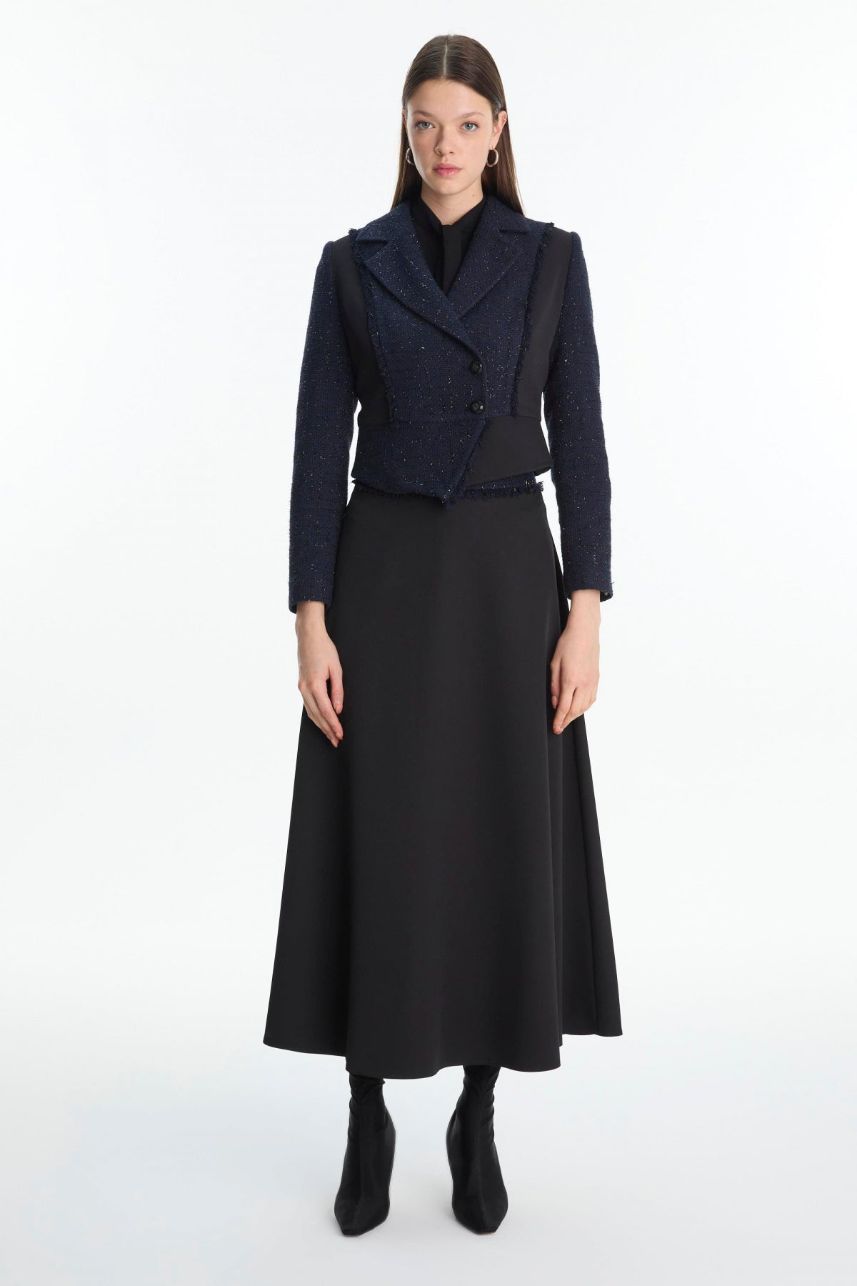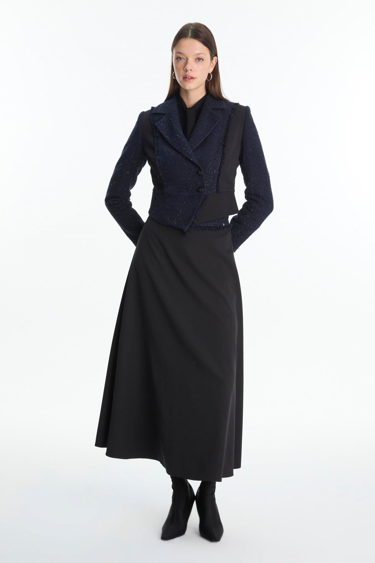 Tweed desenli ceket – Kruvaze yaka – Uzun kollu – Uzun etek – Düz kesim – Rahat kalıp