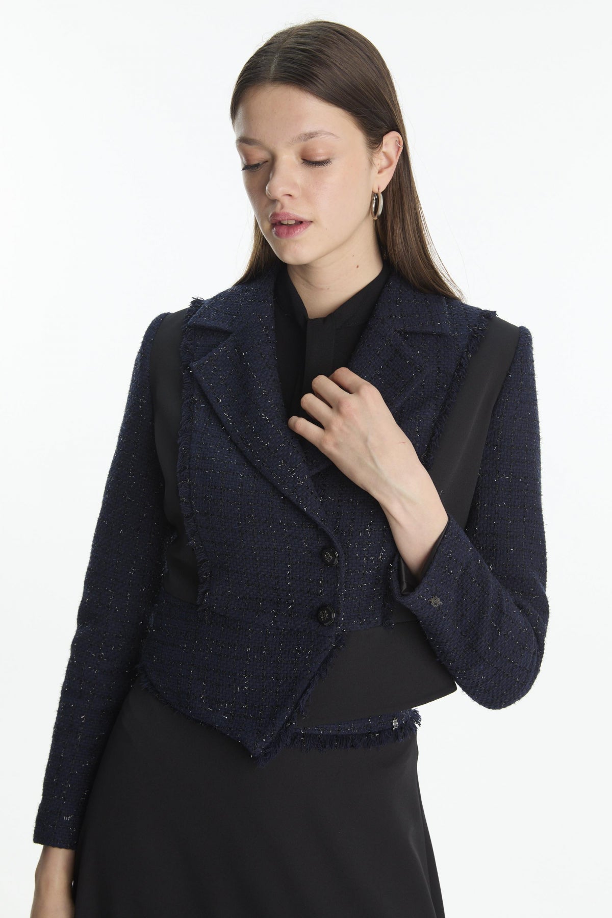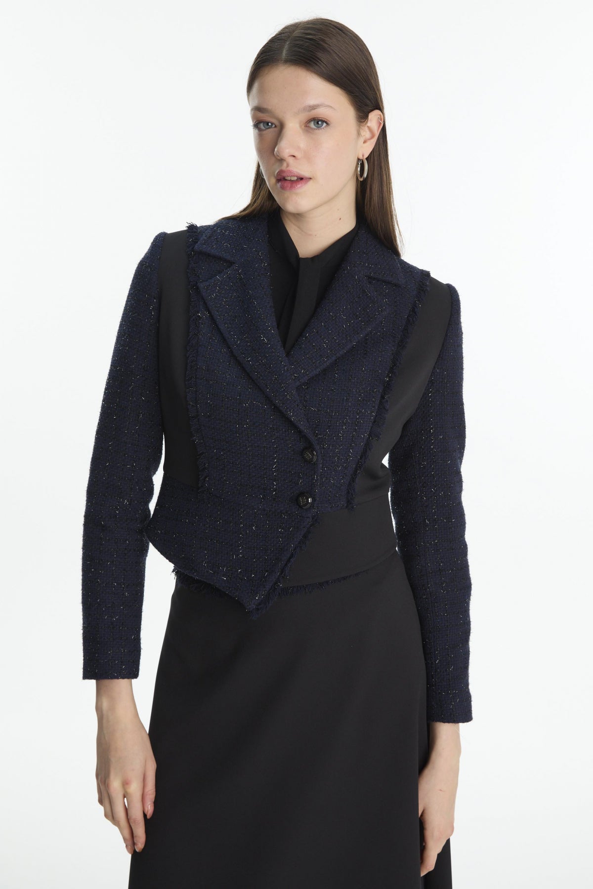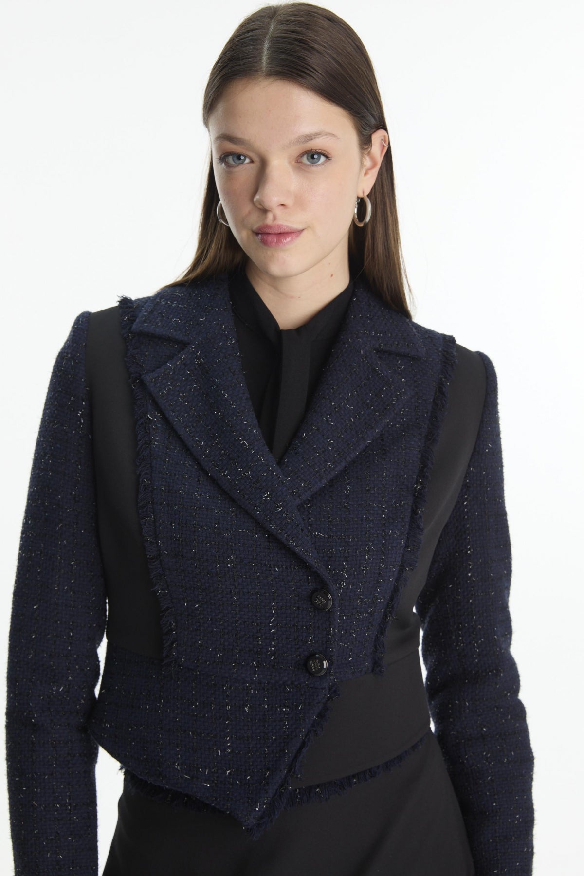 Tweed desenli ceket – Kruvaze yaka – Uzun kollu – Uzun etek – Düz kesim – Rahat kalıp