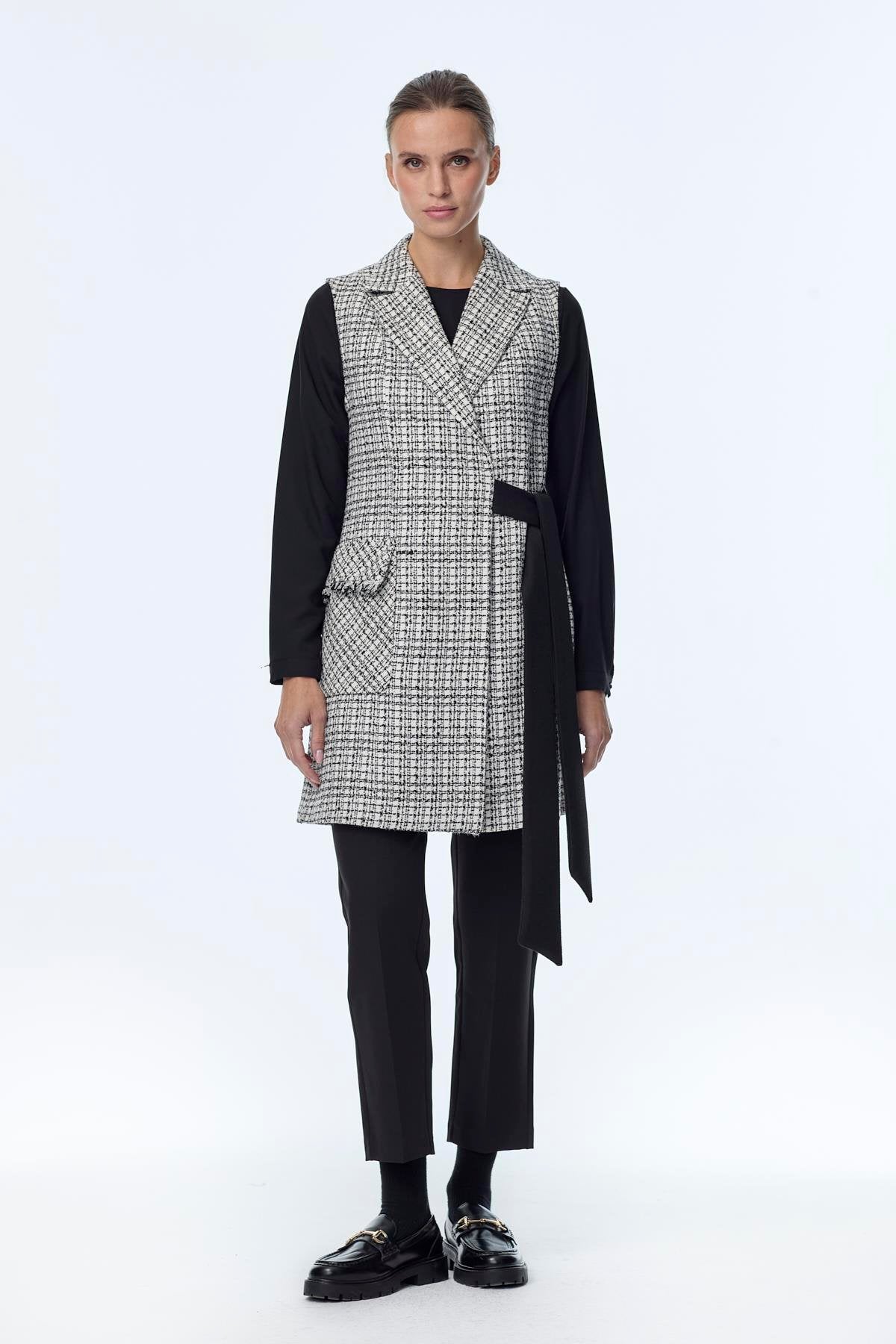 Tweed desenli, Kuşak detaylı, Astarsız, Rahat kalıp, İkili takım (yelek + bluz)