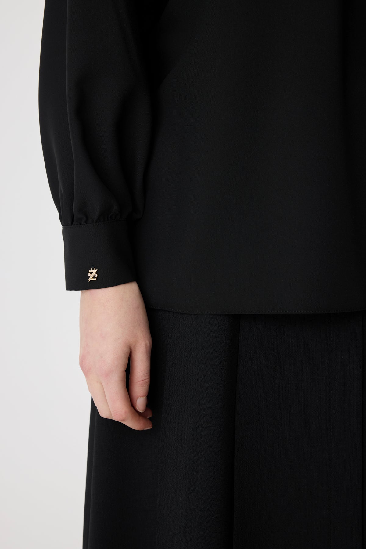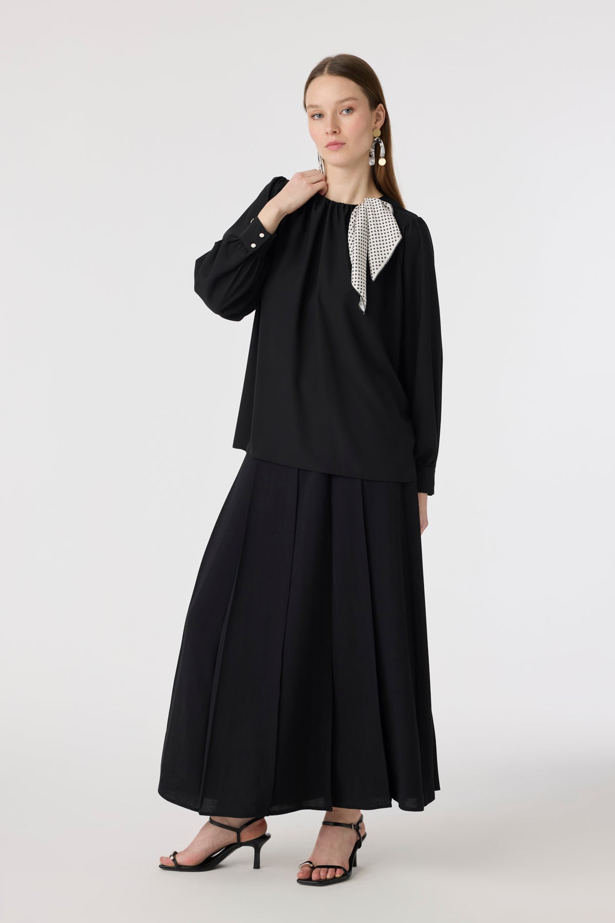 Puantiye Fularlı Pilise Detaylı Siyah Bluz 0142