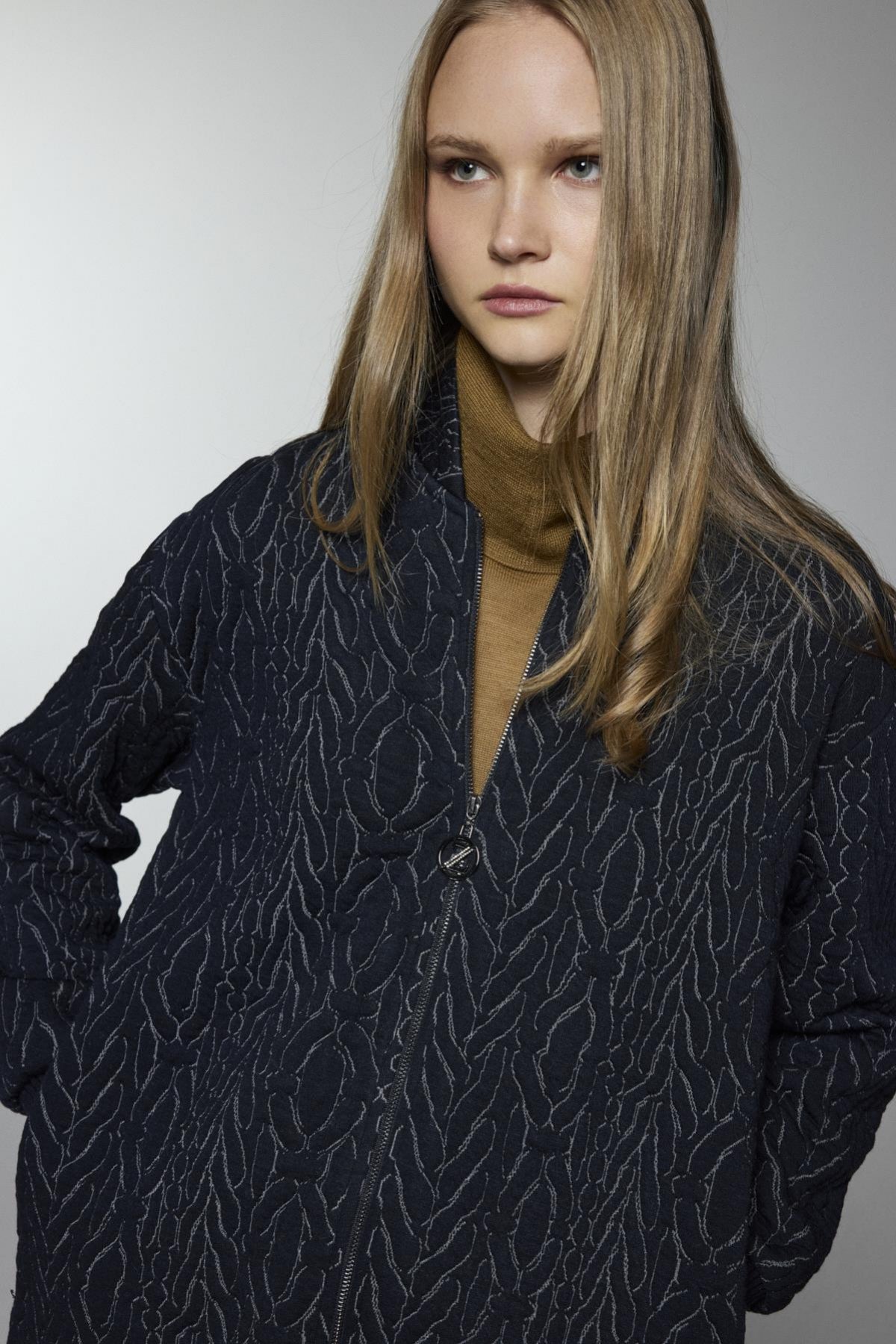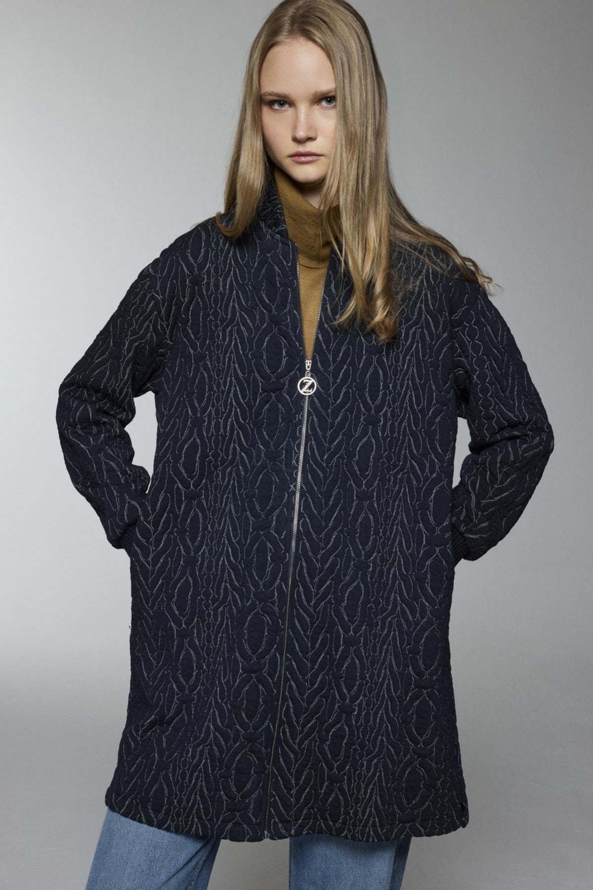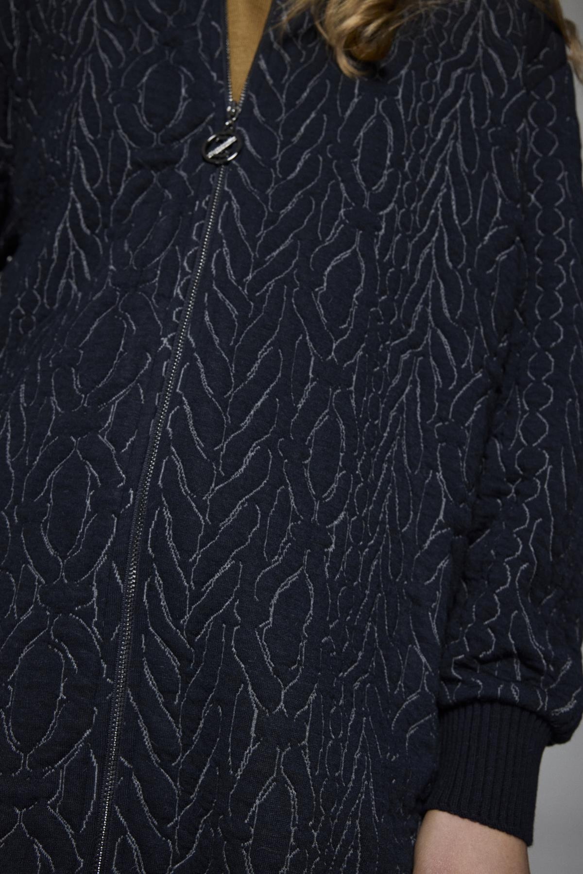 Şık ve modern tasarımıyla dikkat çeken ceket, fermuar detaylı kapaması ve cep tasarımıyla hem fonksiyonel hem de şık bir kullanım sunar. Dikişli deseni ve rahat kesimi ile soğuk havalarda konfor sağlar.