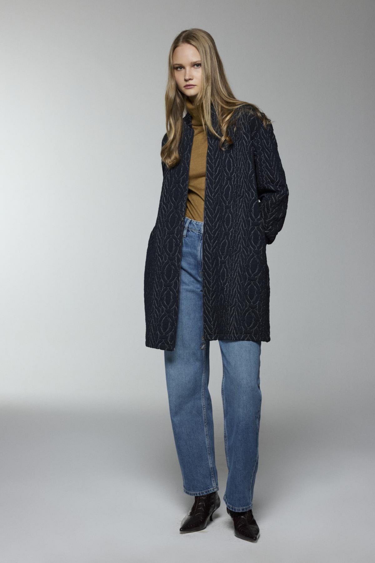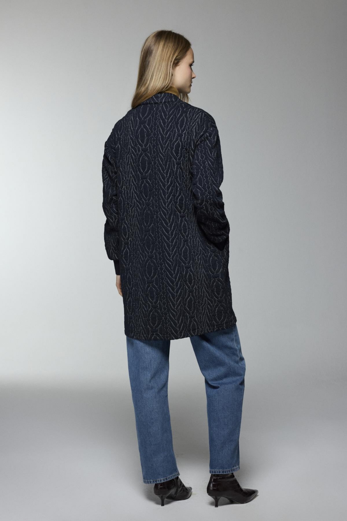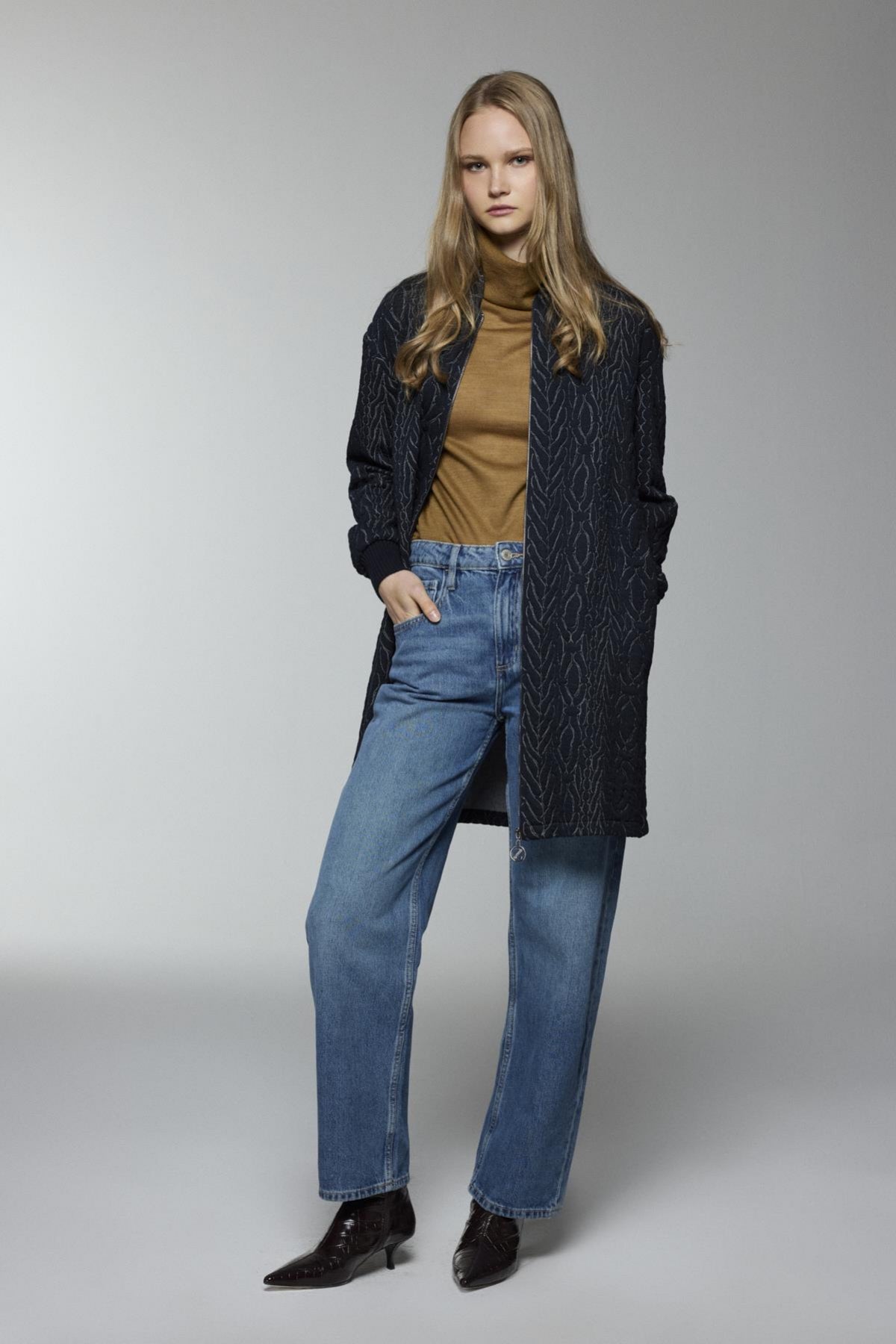 Şık ve modern tasarımıyla dikkat çeken ceket, fermuar detaylı kapaması ve cep tasarımıyla hem fonksiyonel hem de şık bir kullanım sunar. Dikişli deseni ve rahat kesimi ile soğuk havalarda konfor sağlar.