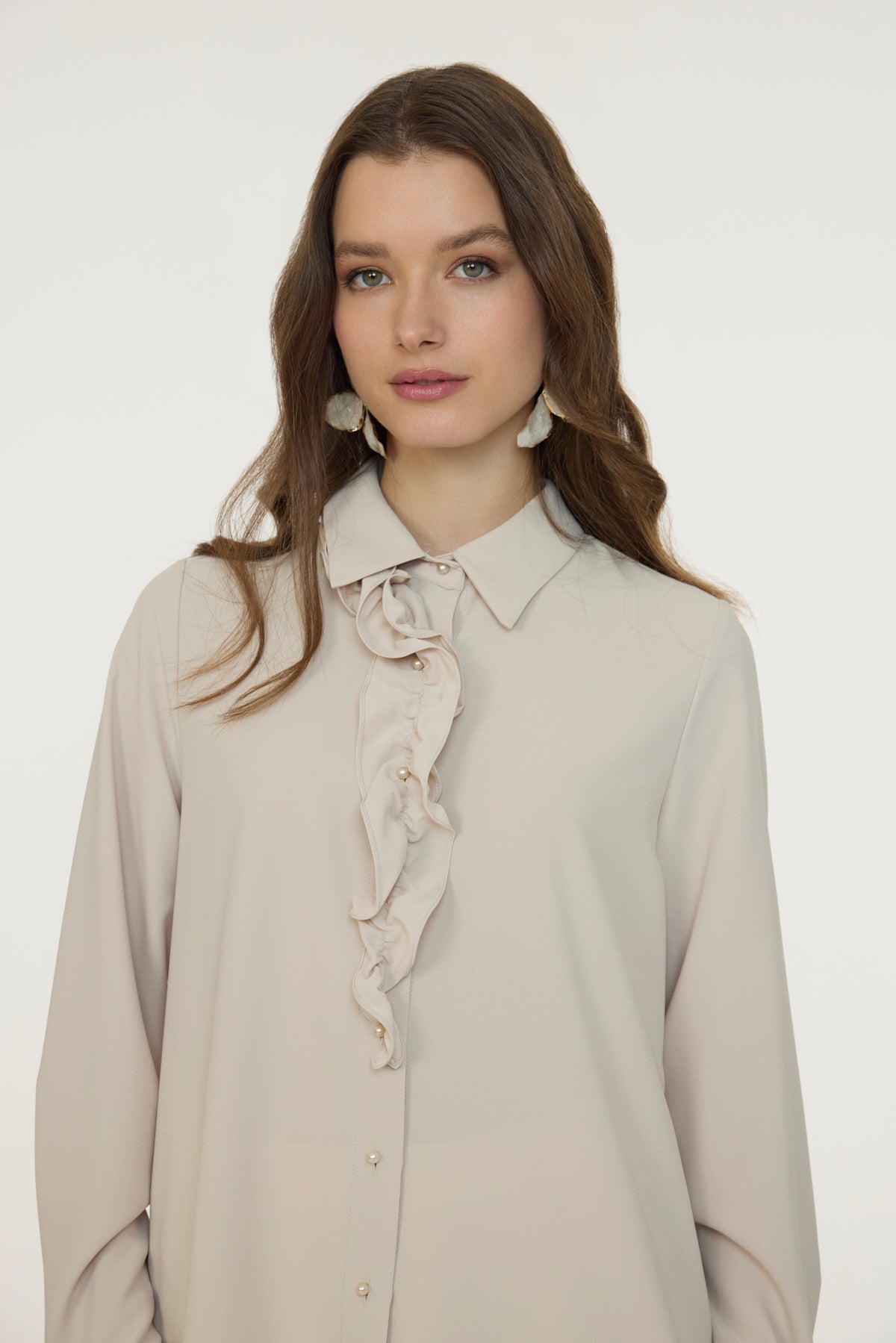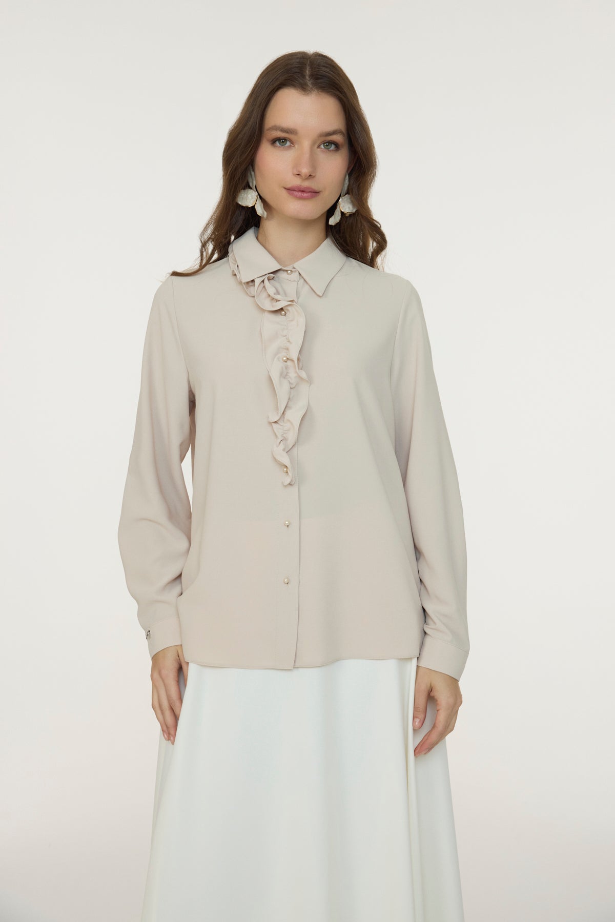 Fırfırlı Çiçek Detaylı Zarif Bej Gömlek 0139