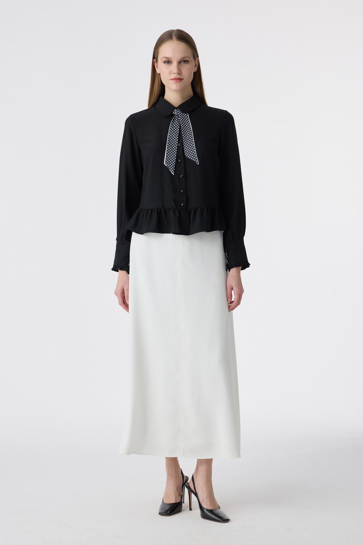 Fularlı Düğmeli Volanlı Siyah Gömlek 0122