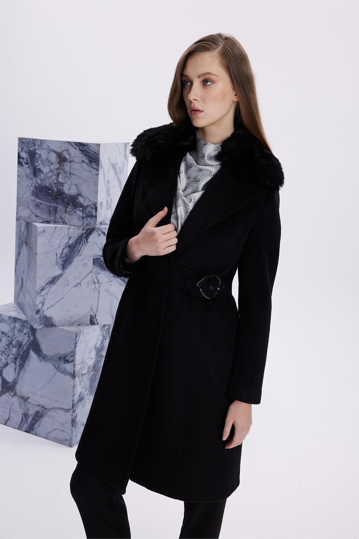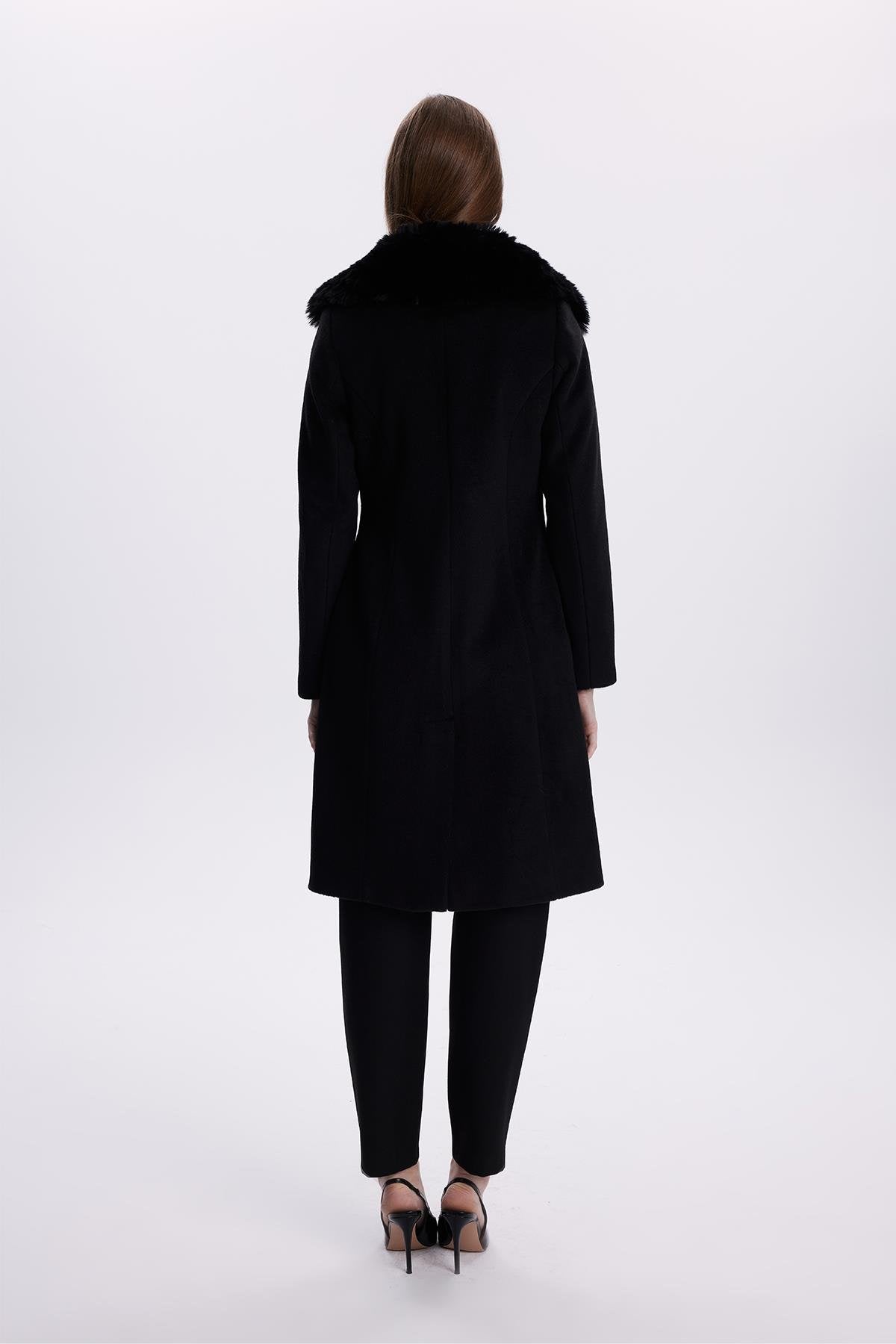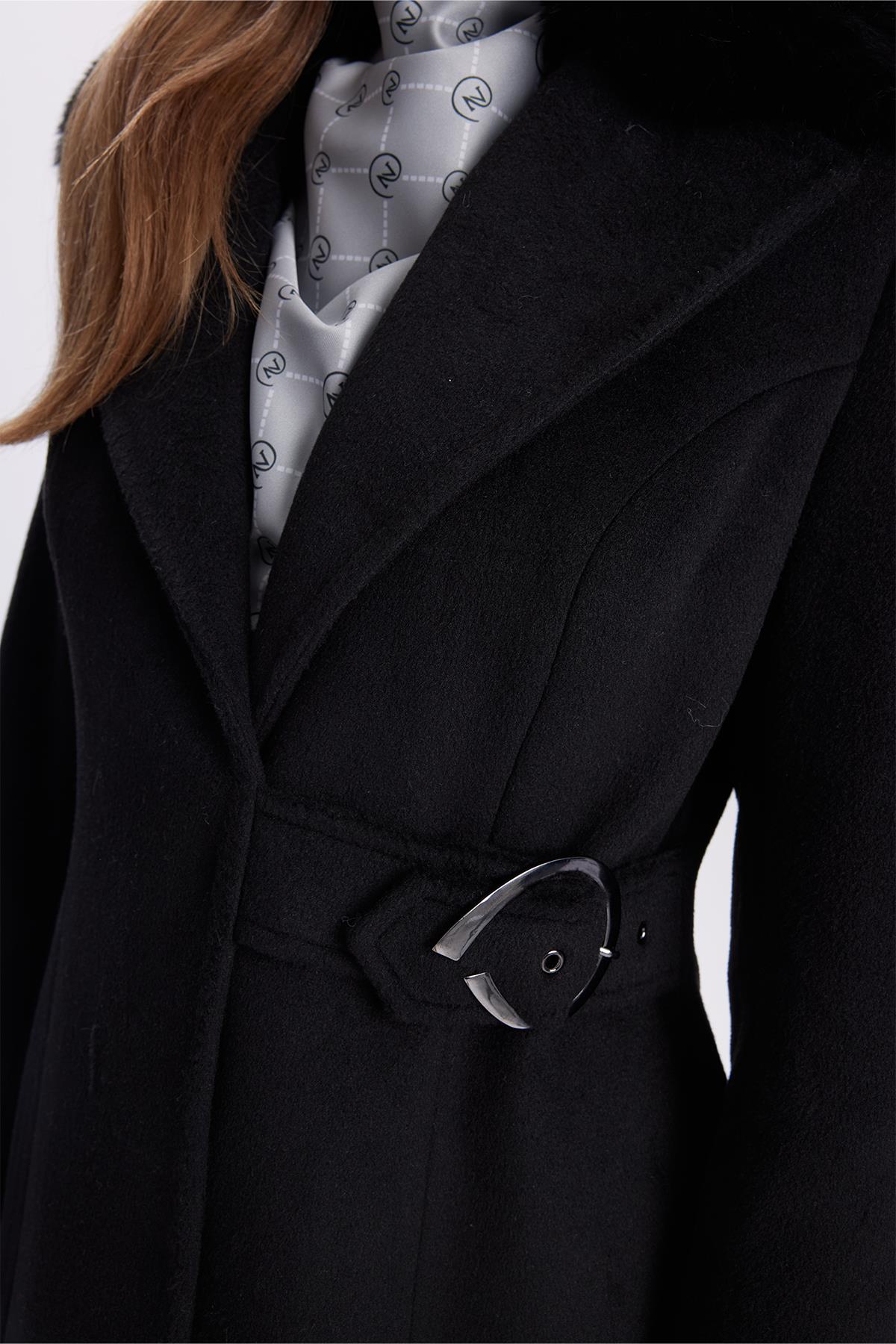 Kruvaze Yaka Kemer Detaylı Kaşe Siyah Kaban 13404