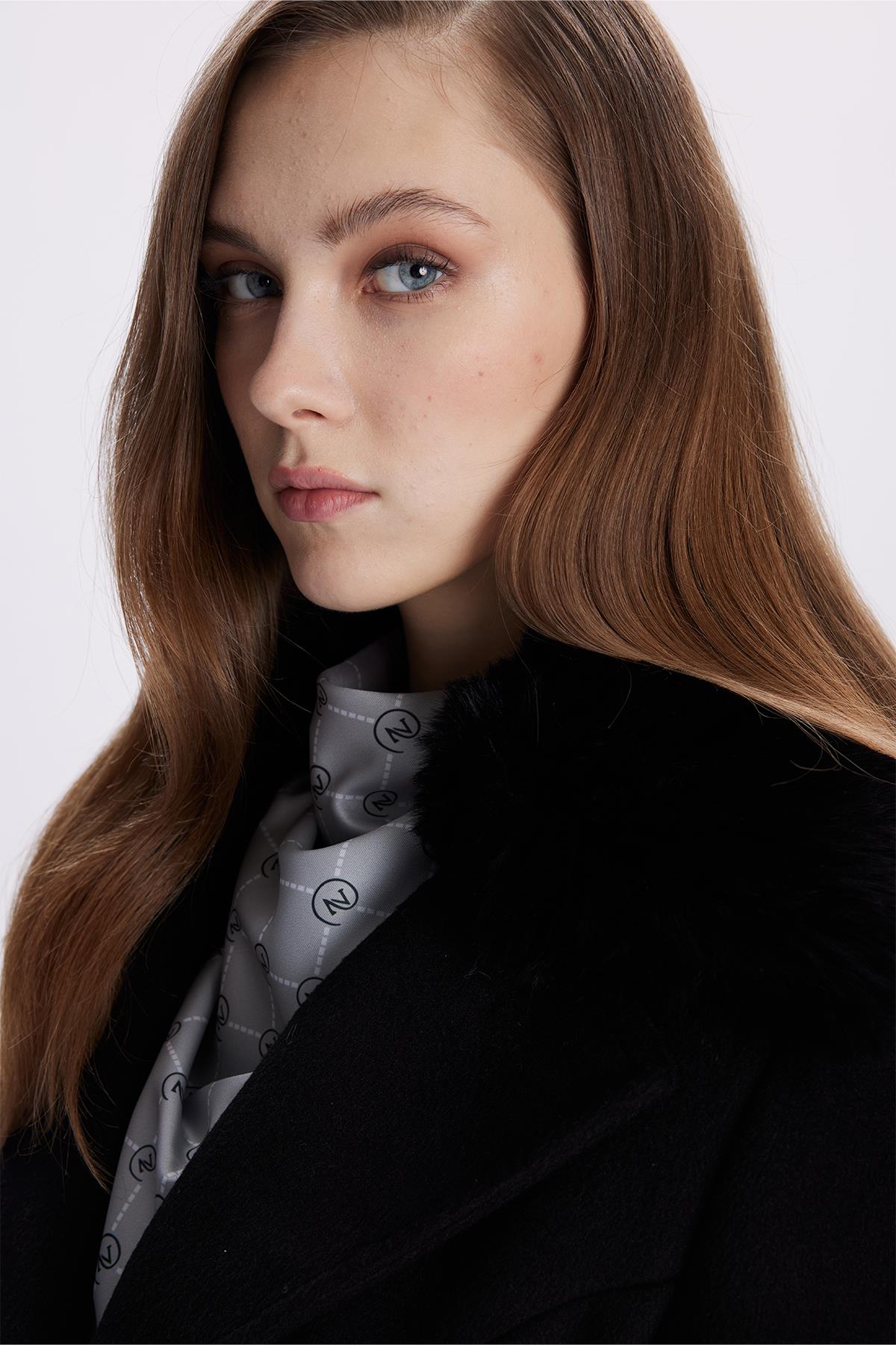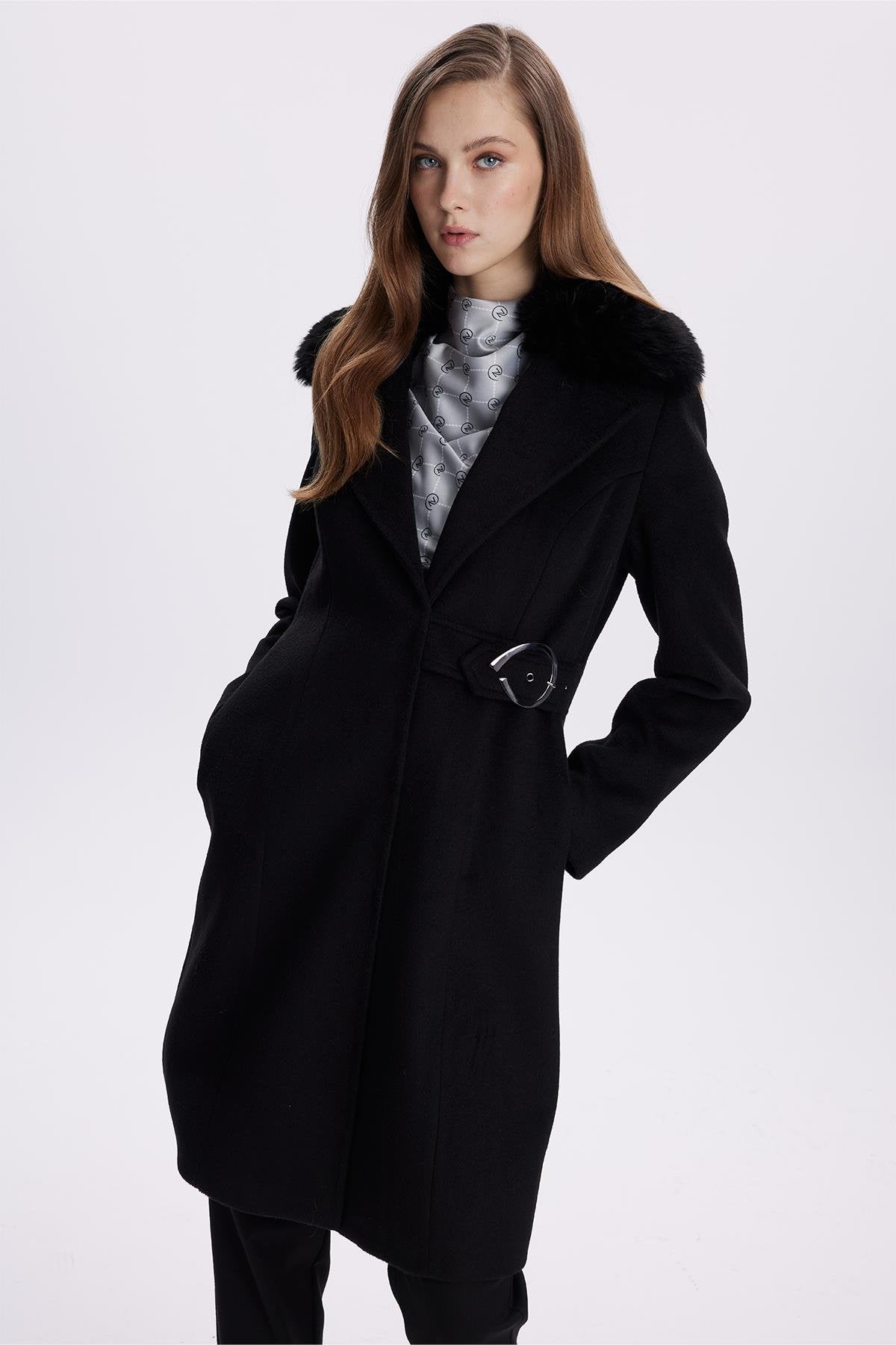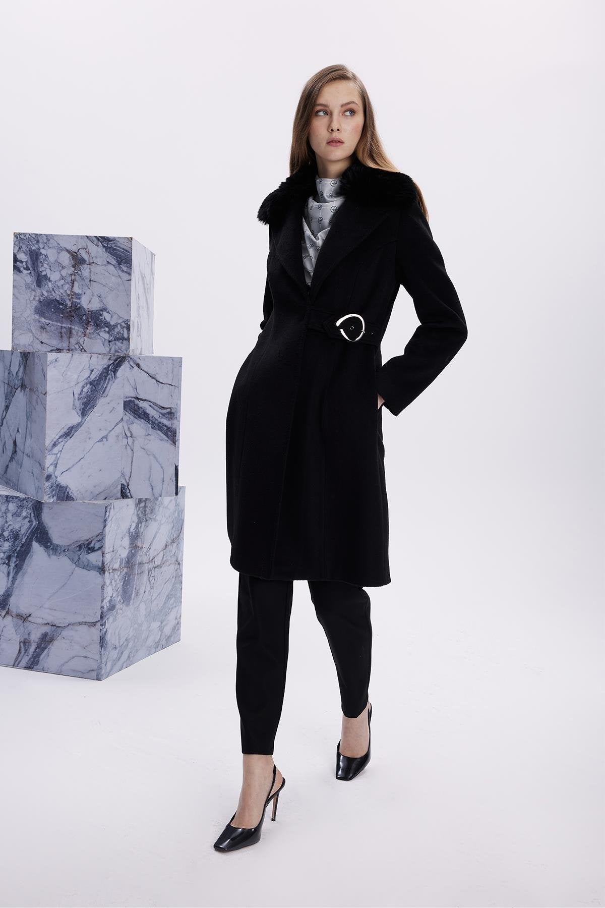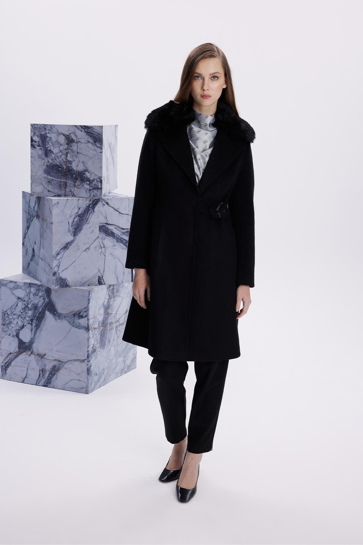 Kruvaze Yaka Kemer Detaylı Kaşe Siyah Kaban 13404