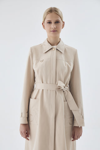 Kruvaze Yaka Kuşaklı Bej Pardesü 13444