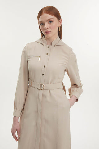 Kapüşonlu Fermuar Detaylı Kuşaklı Bej Pardesü 13785