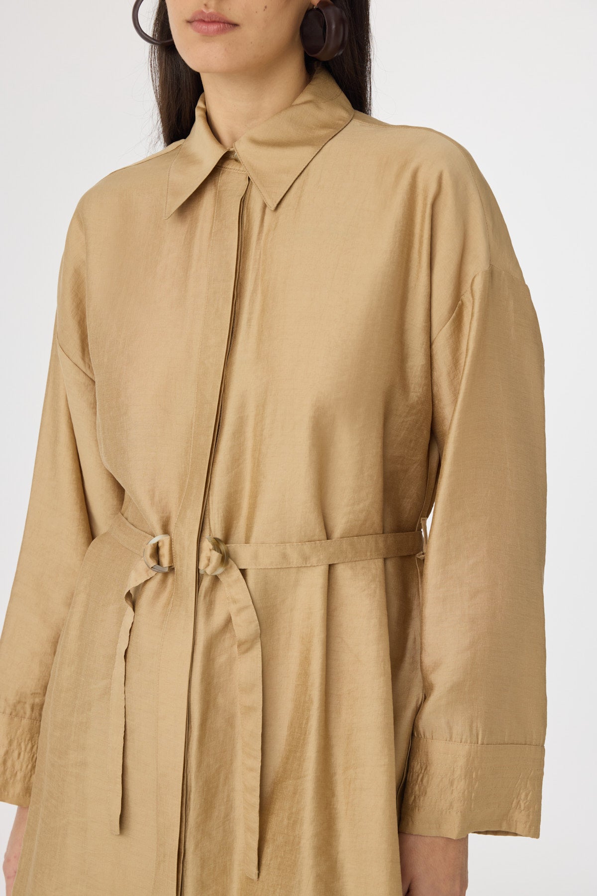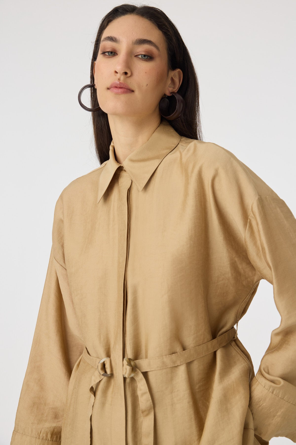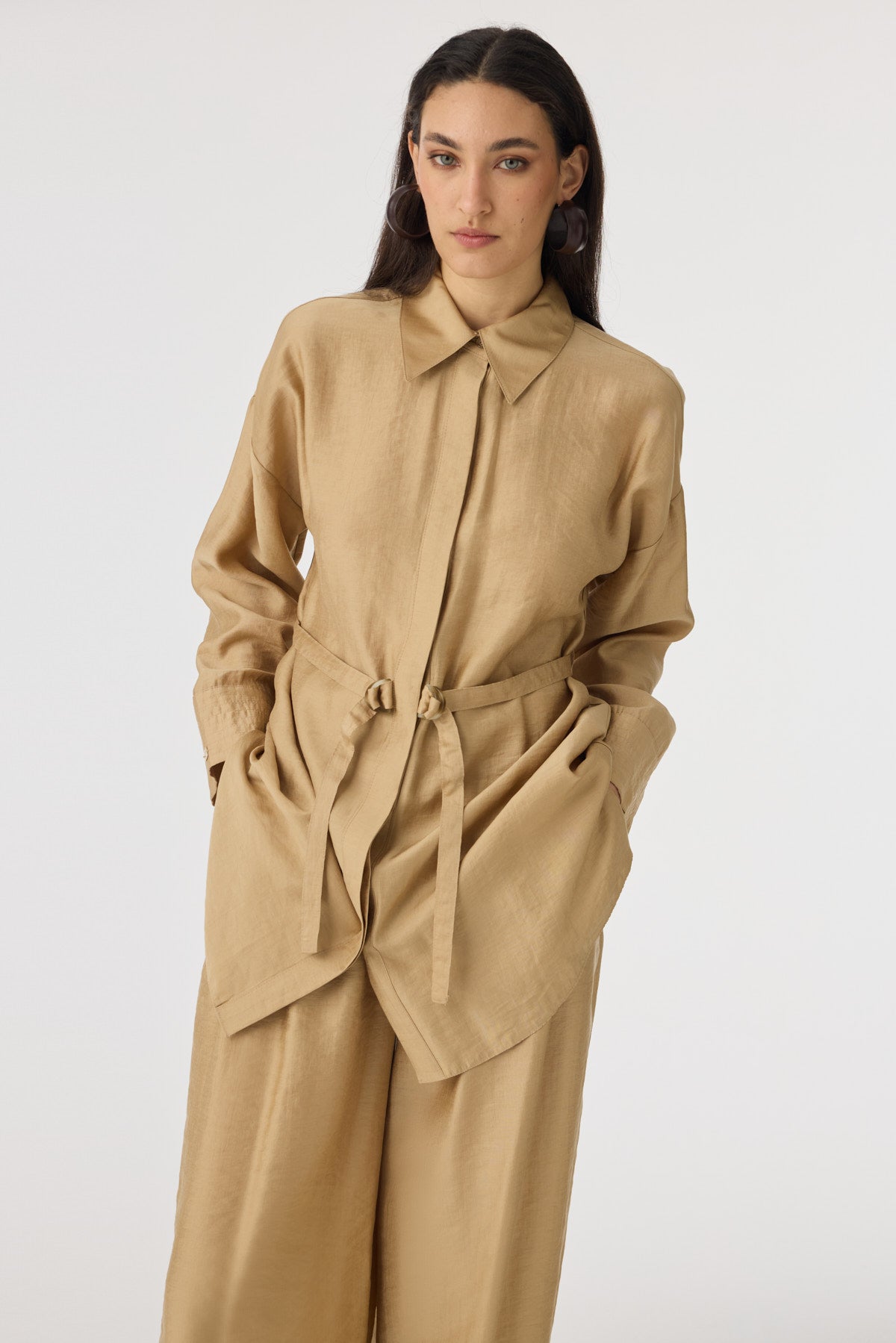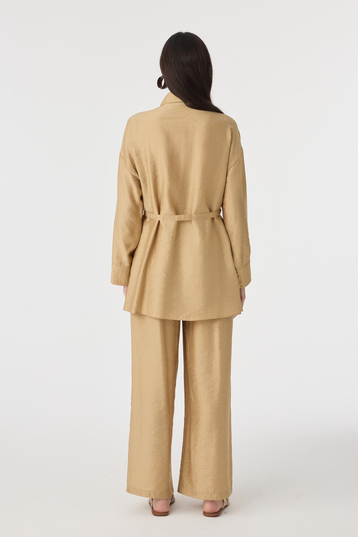 Kuşaklı Gömlek Yaka Rahat Kesim Camel Takım 1829