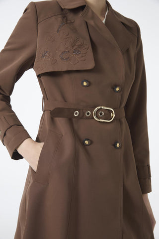 Işleme Detaylı Kemerli Kahve Trençkot 13812