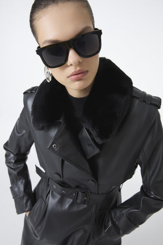 Kruvaze Yaka Kol Detaylı Deri Siyah Trençkot 13014
