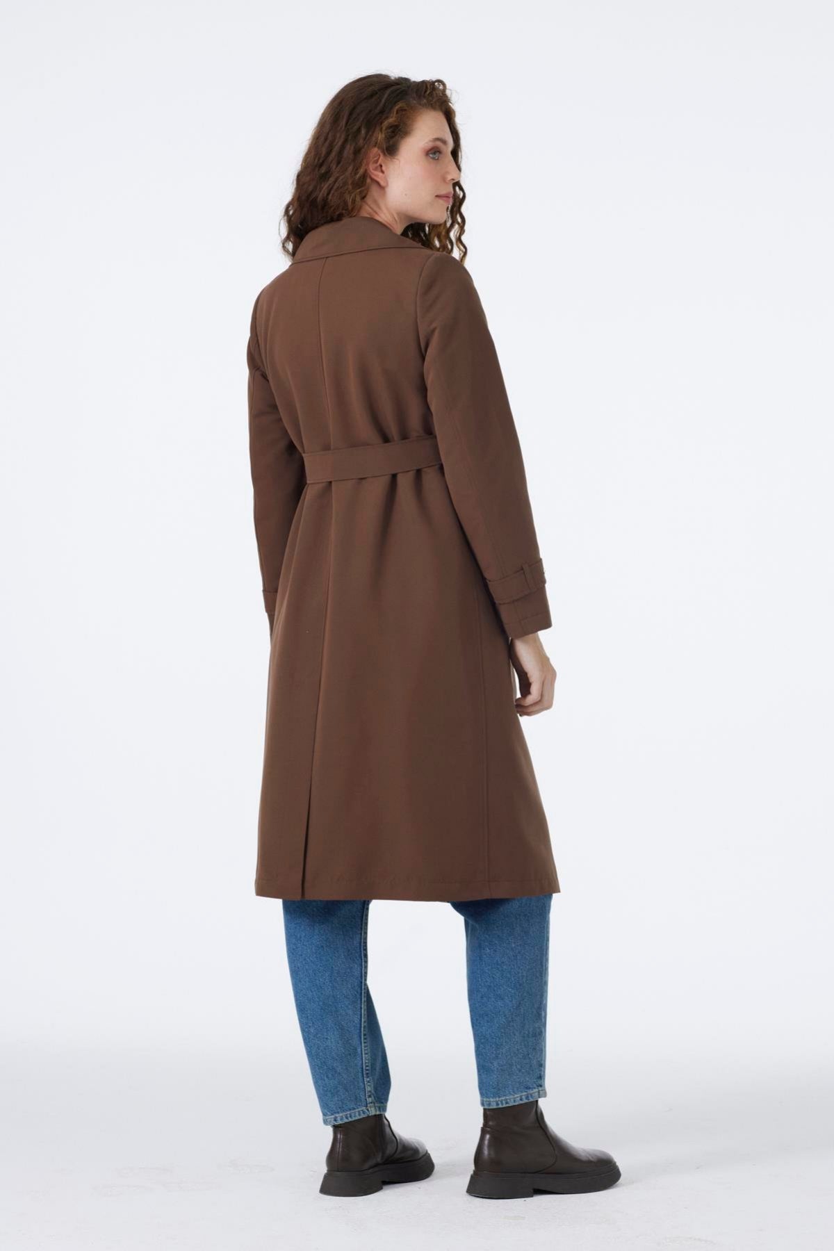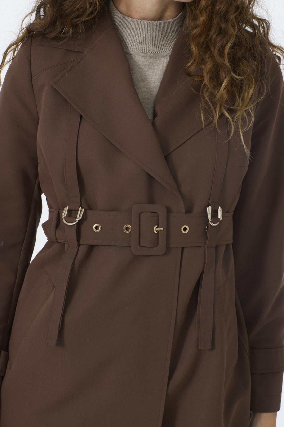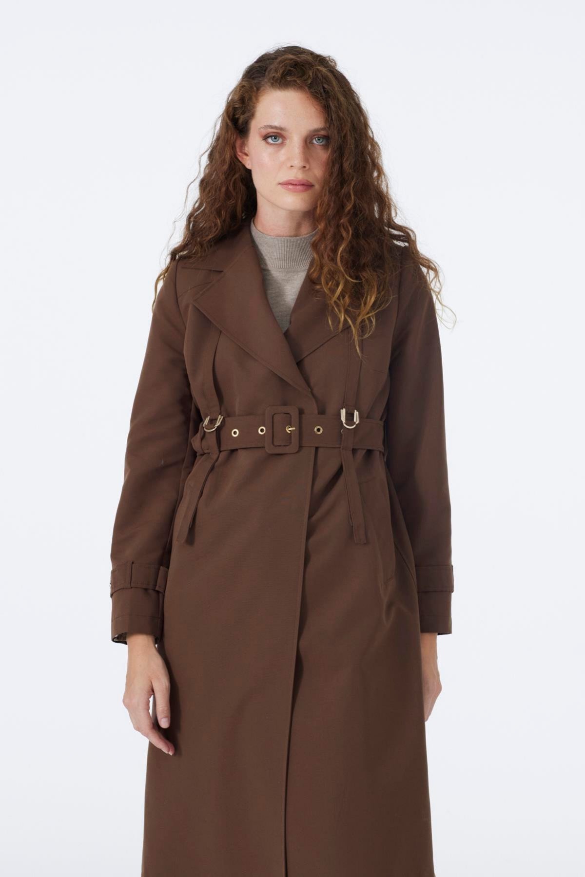 Kruvaze Yaka Apolet Detaylı Kemerli Kahve Trençkot 13758