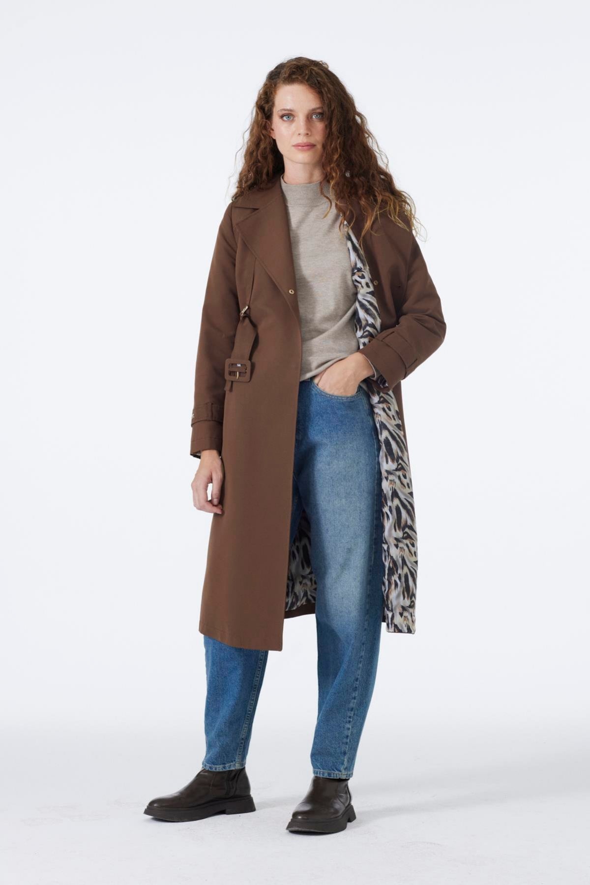 Zamansız şıklığı ve işlevsel tasarımıyla öne çıkan bu kahve trençkot, kruvaze yaka kesimi ve apolet detaylarıyla klasik bir duruş sunar. Beldeki ayarlanabilir kemer, vücut hatlarını zarif bir şekilde vurgularken rahat kalıbı gün boyu konfor sağlar. Günlük ve iş kombinlerinizde tarzınızı tamamlayacak ideal bir parçadır.