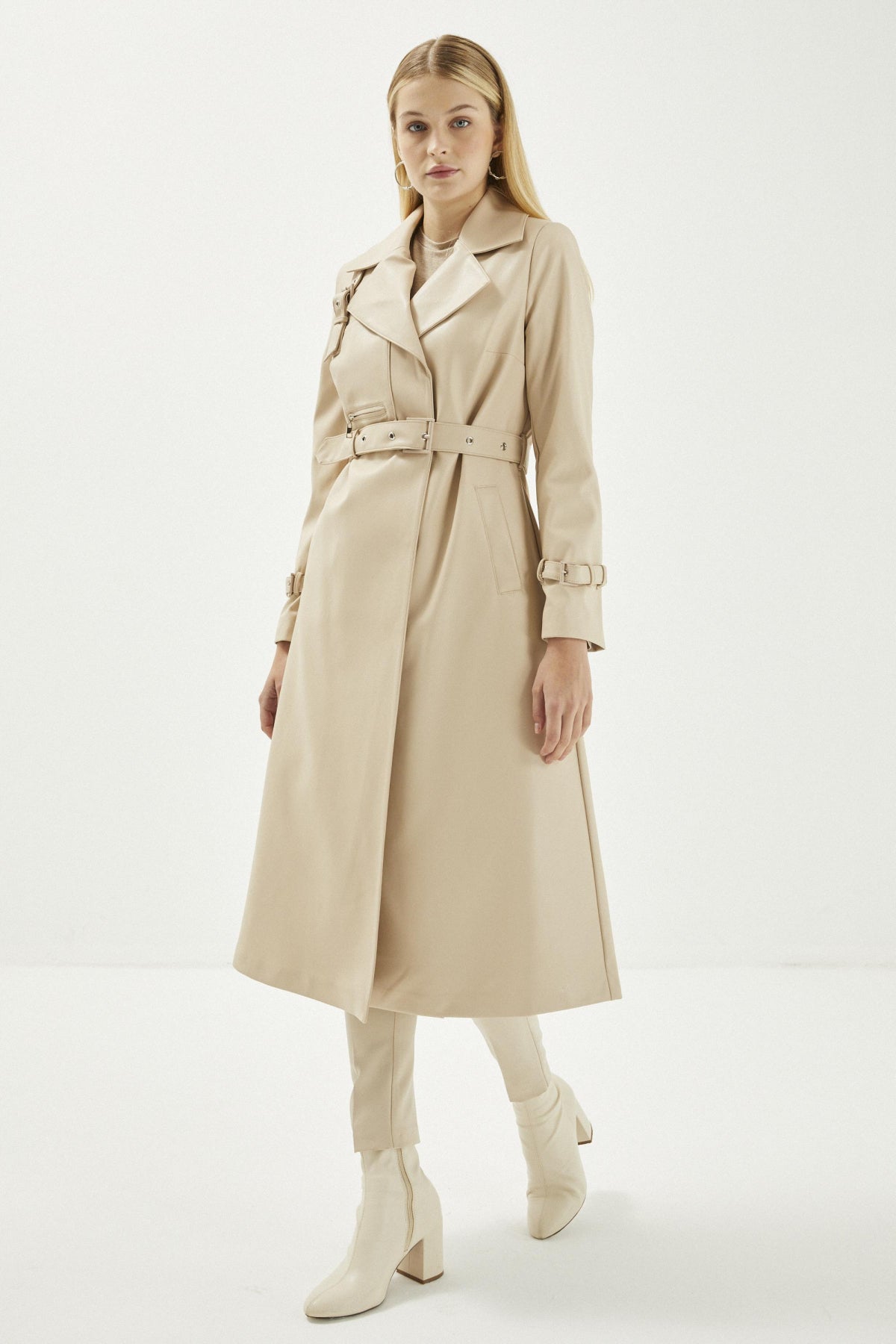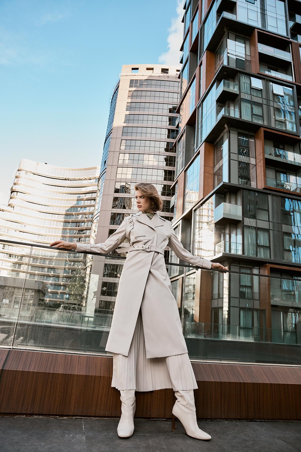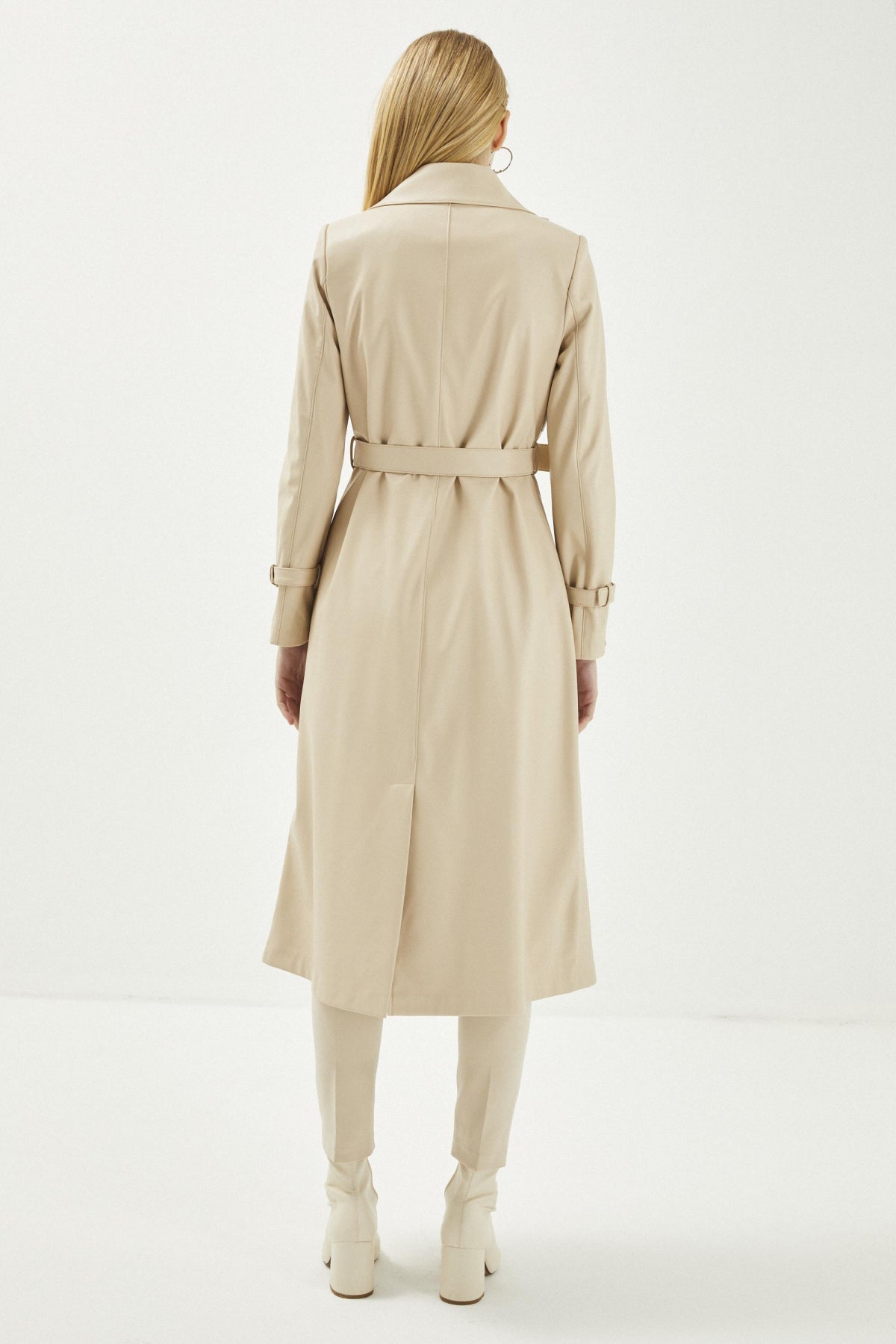 Kruvaze Yaka Kol Detaylı Deri Taş Trençkot 13014