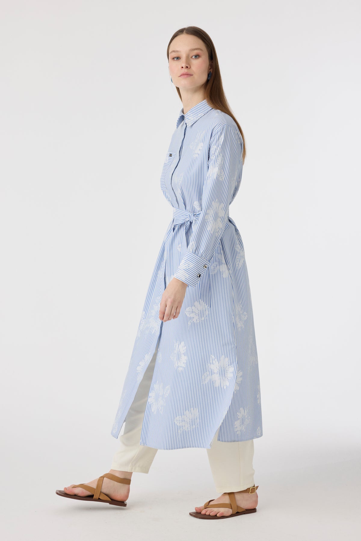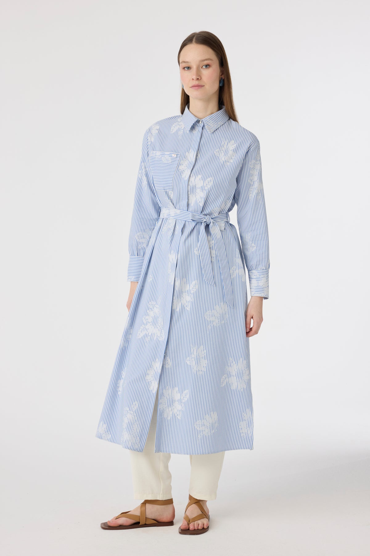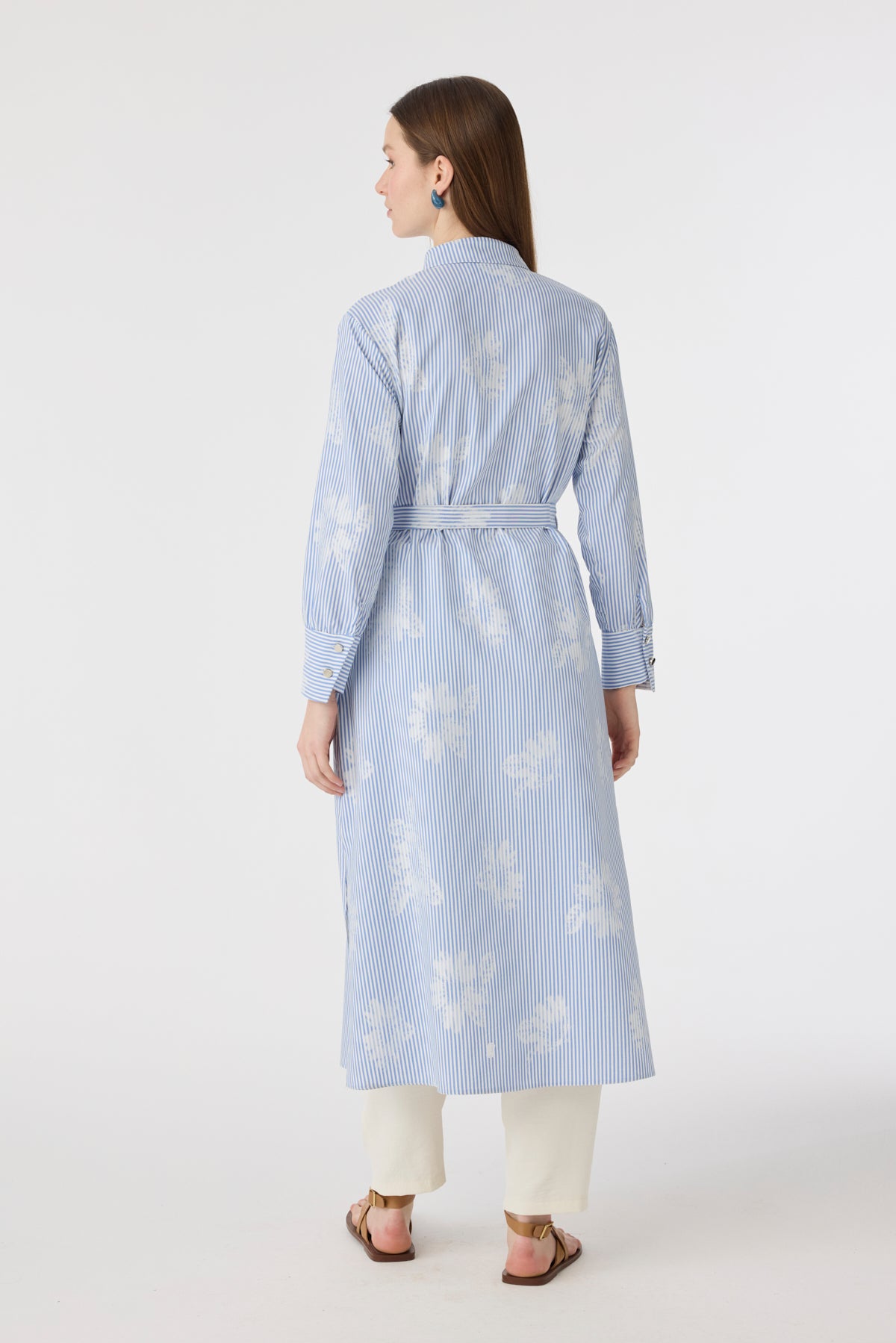 Çizgi Desenli Kemerli Gömlek Elbise Mavi Tunik 1616
