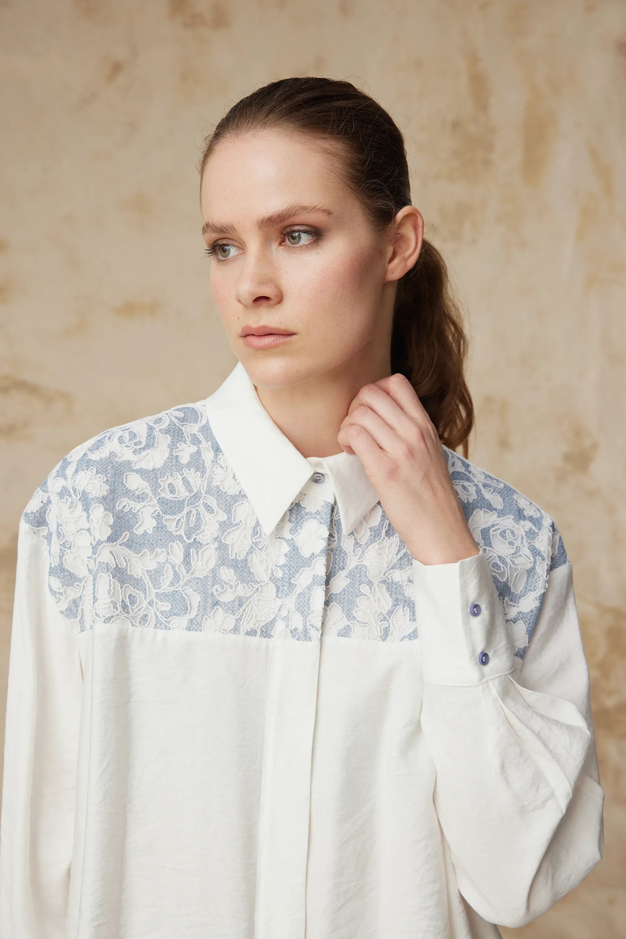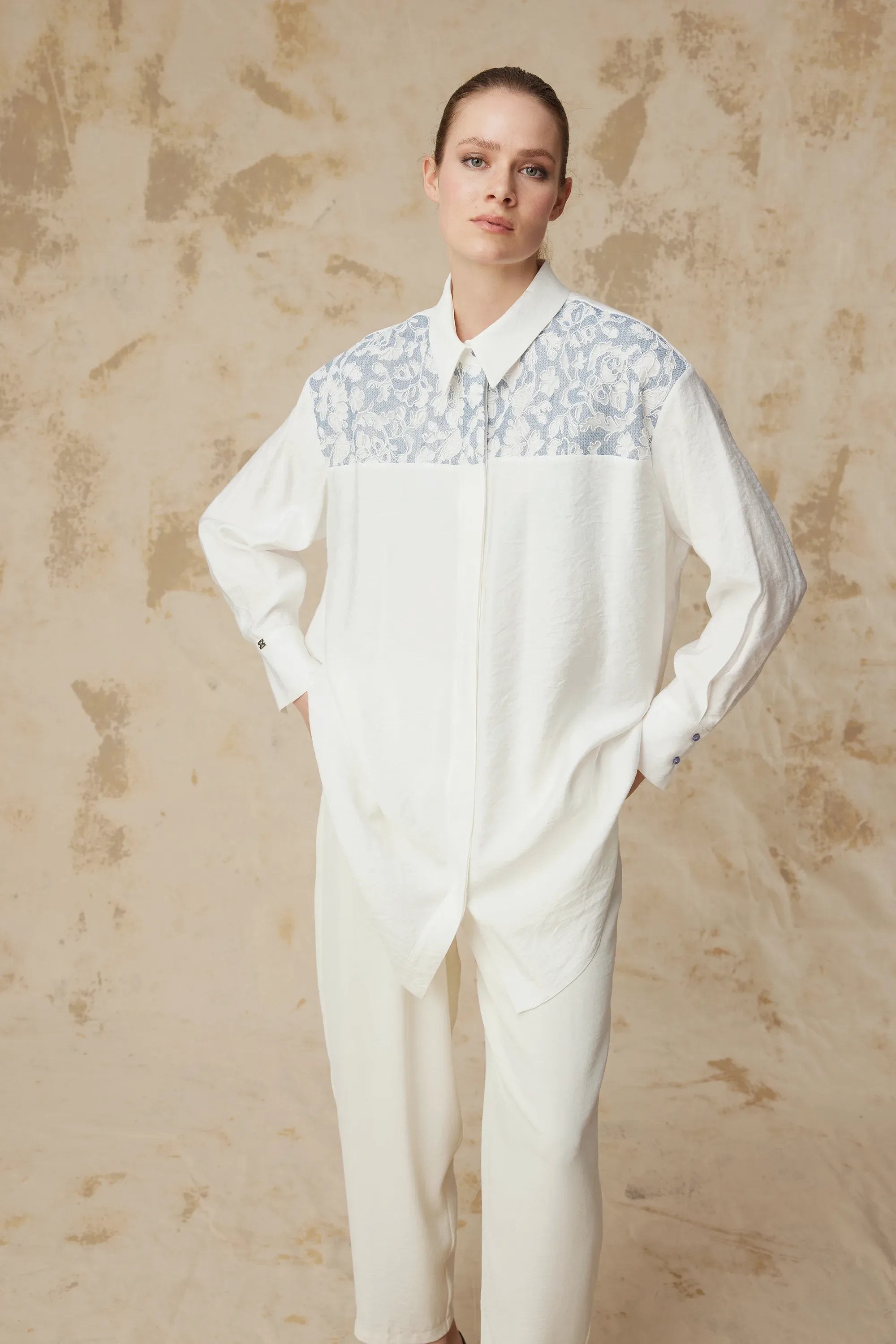 Dantel Garnili Klasik Yaka Detaylı Ekru Tunik 1637