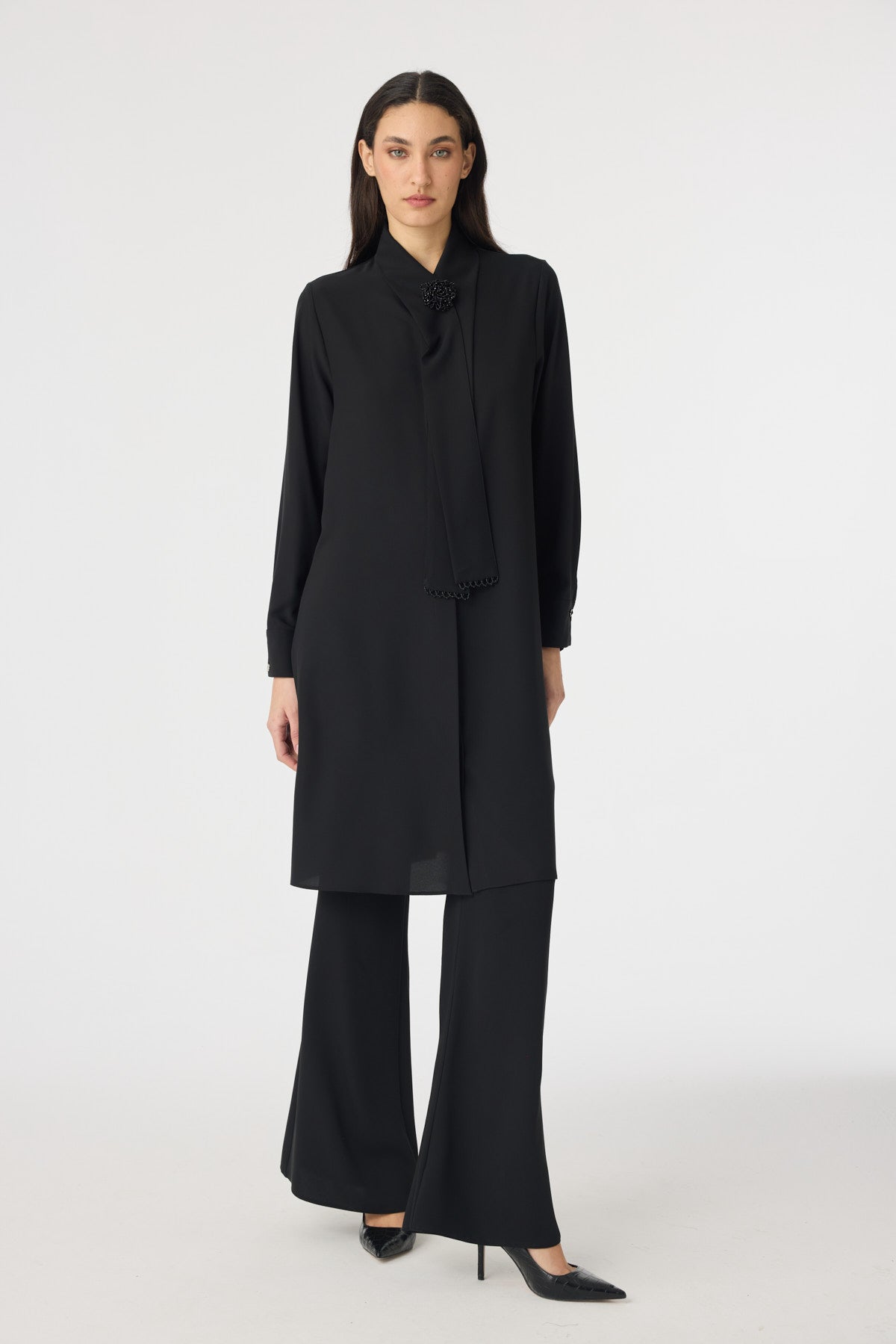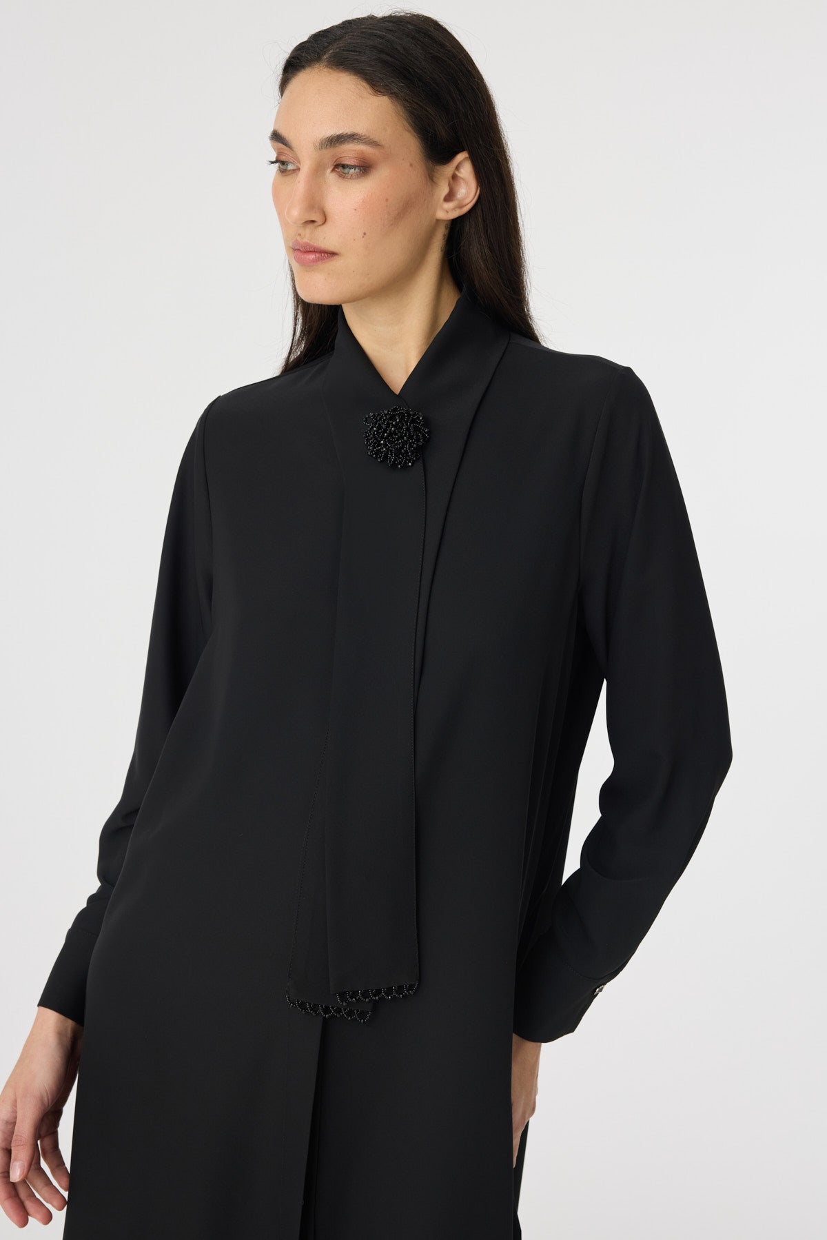 İnci Detaylı Şal Yaka Ekru Tunik Siyah Tunik 1672