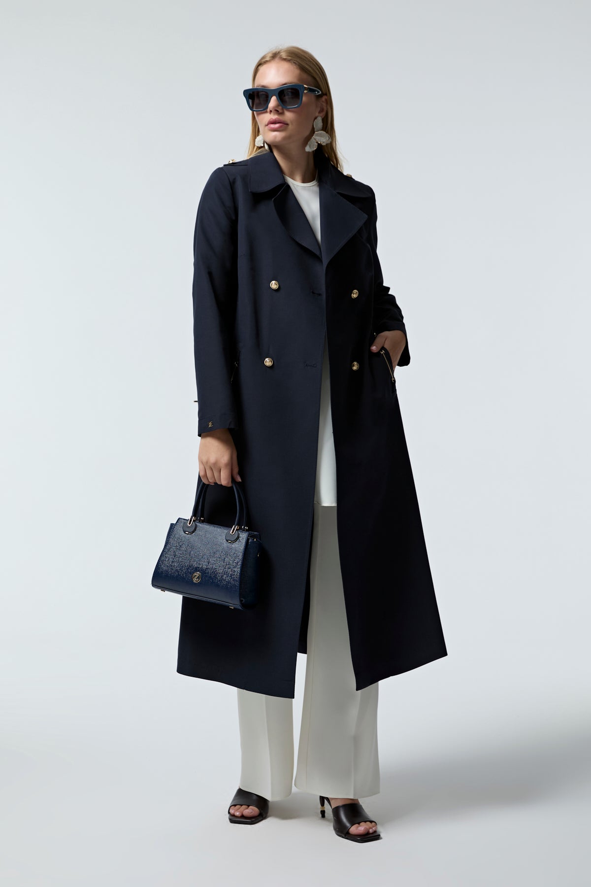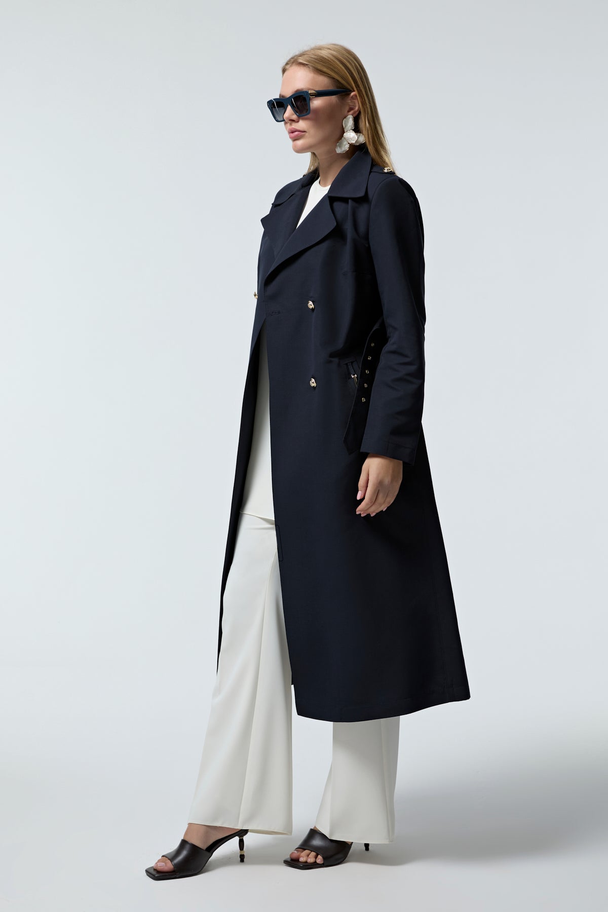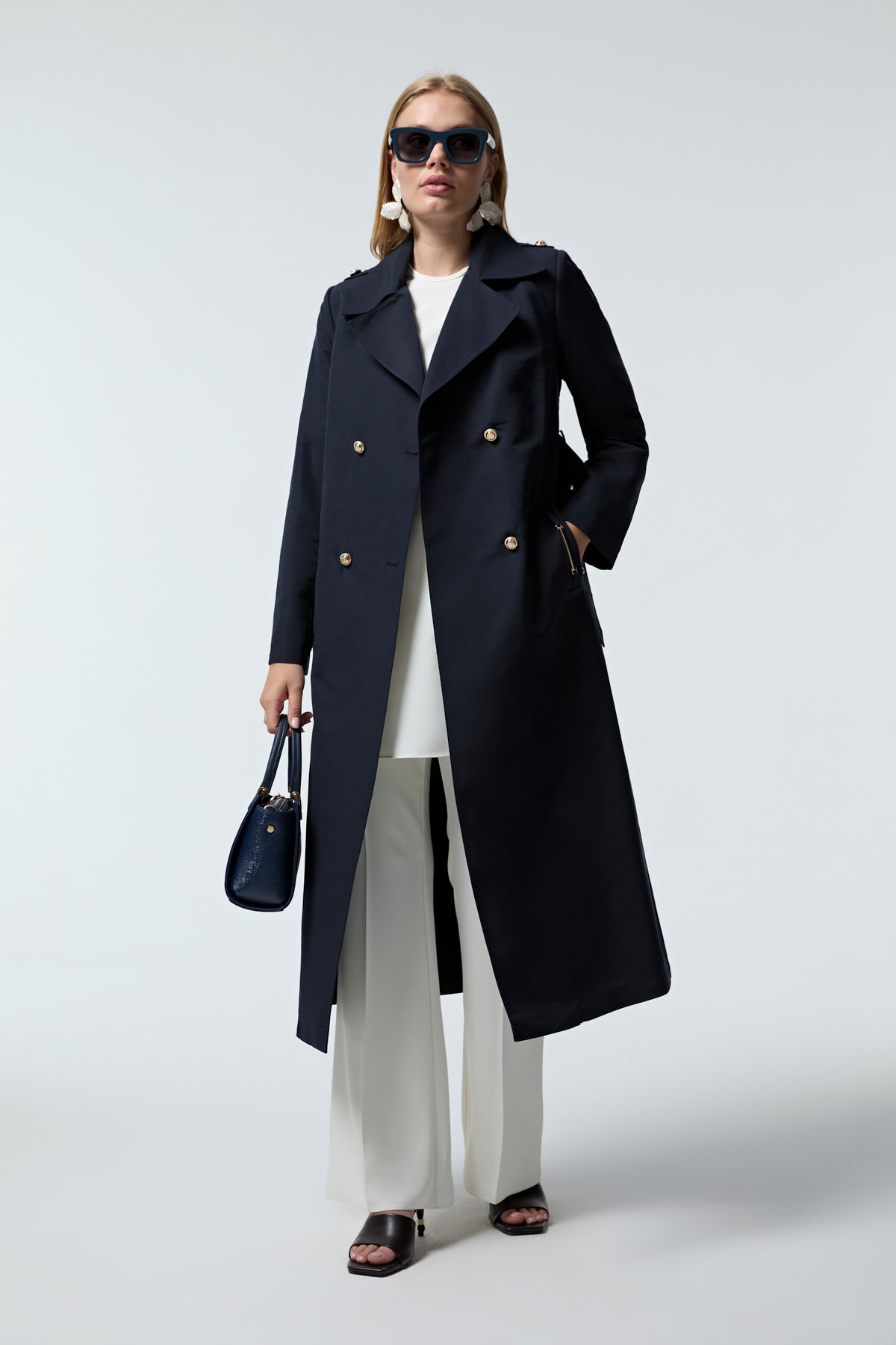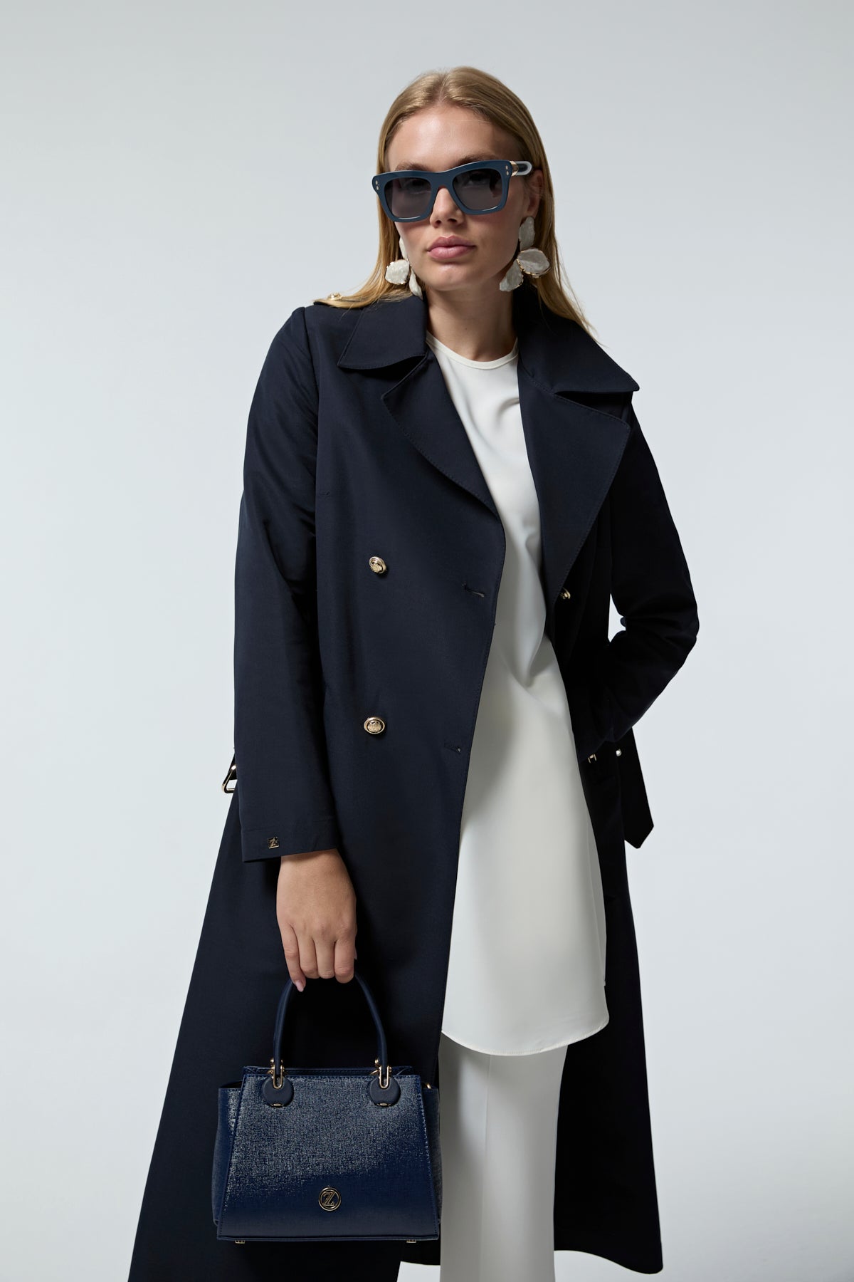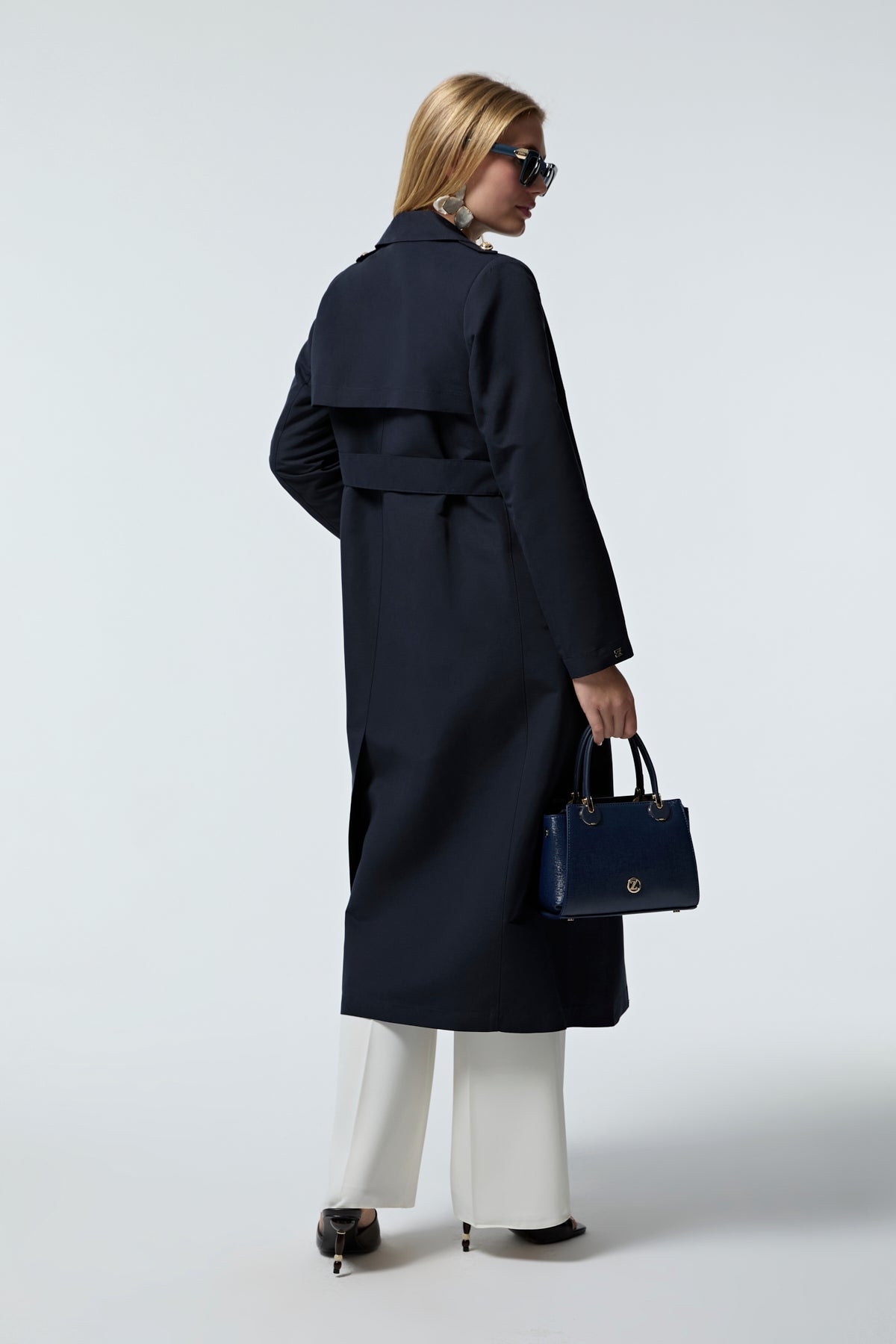 Kruvaze Yaka Kemerli Lacivert Trençkot 14049