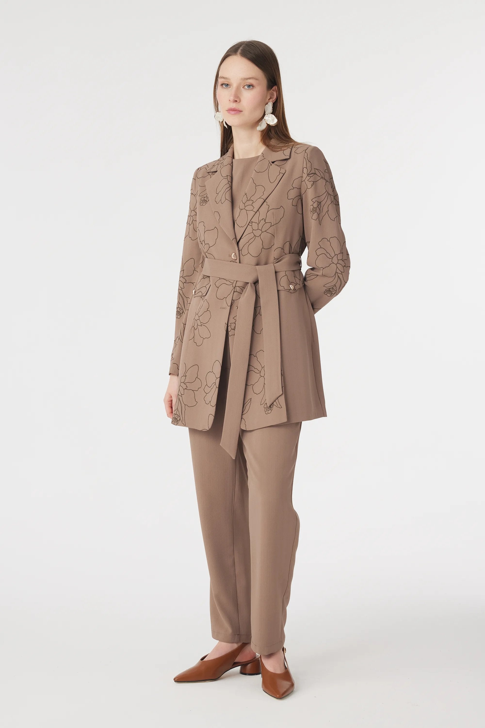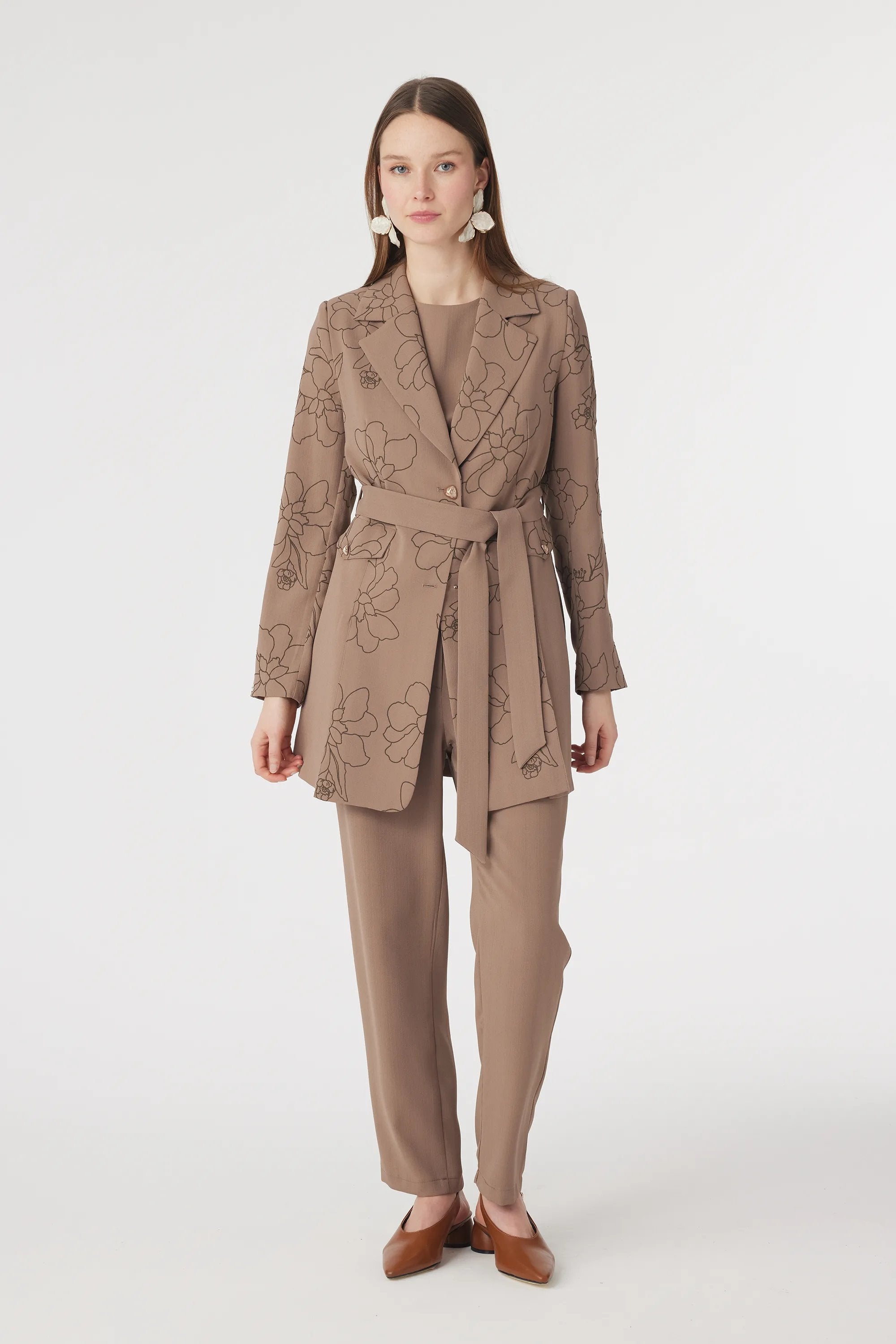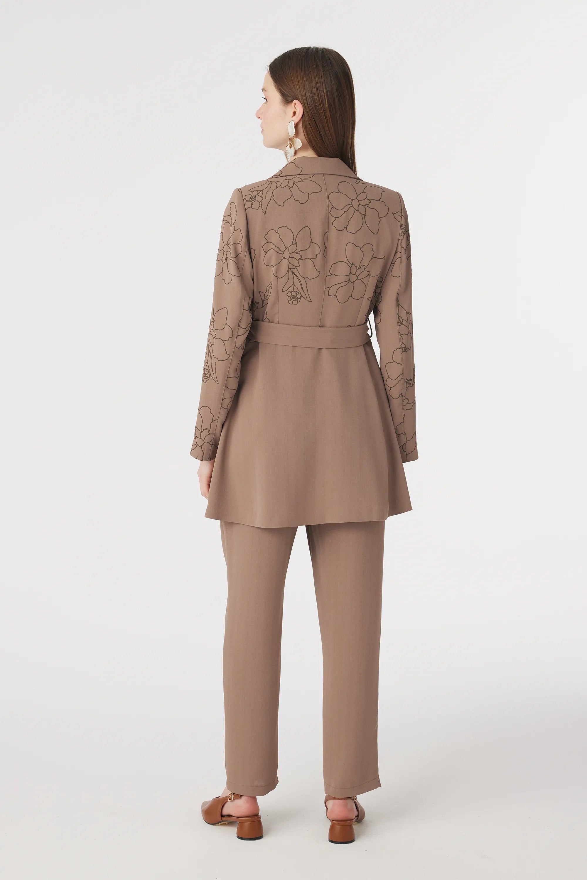 Kruvaze Yaka Kuşaklı Nakışlı Mocha Takım 1740