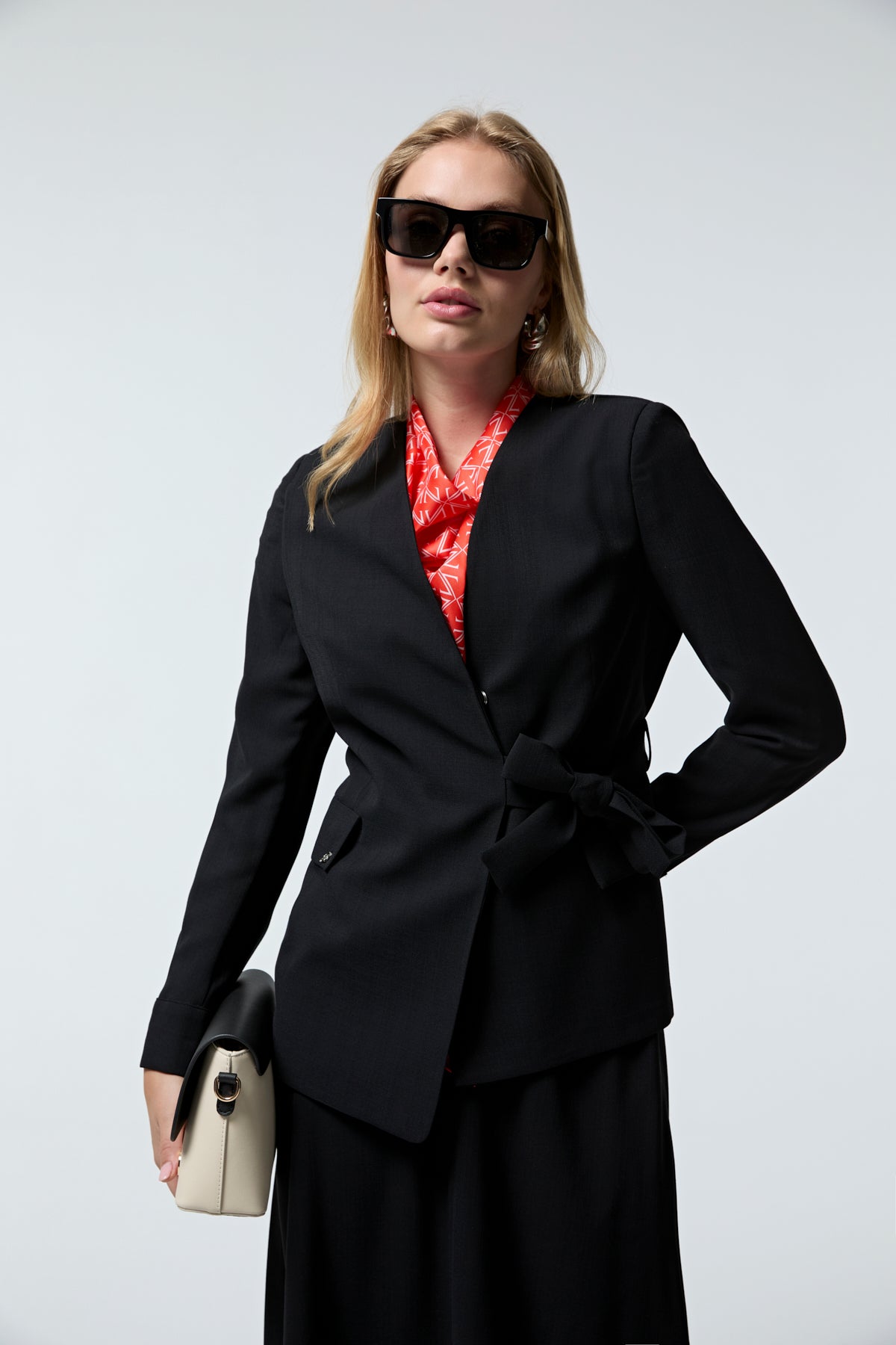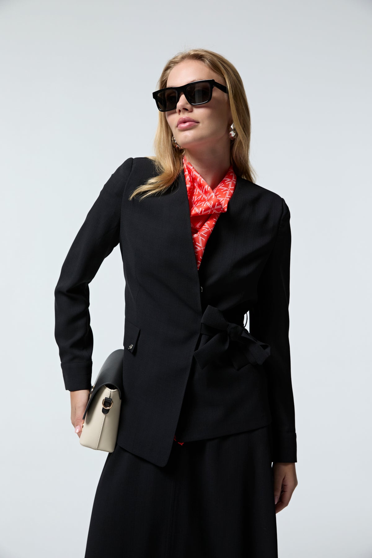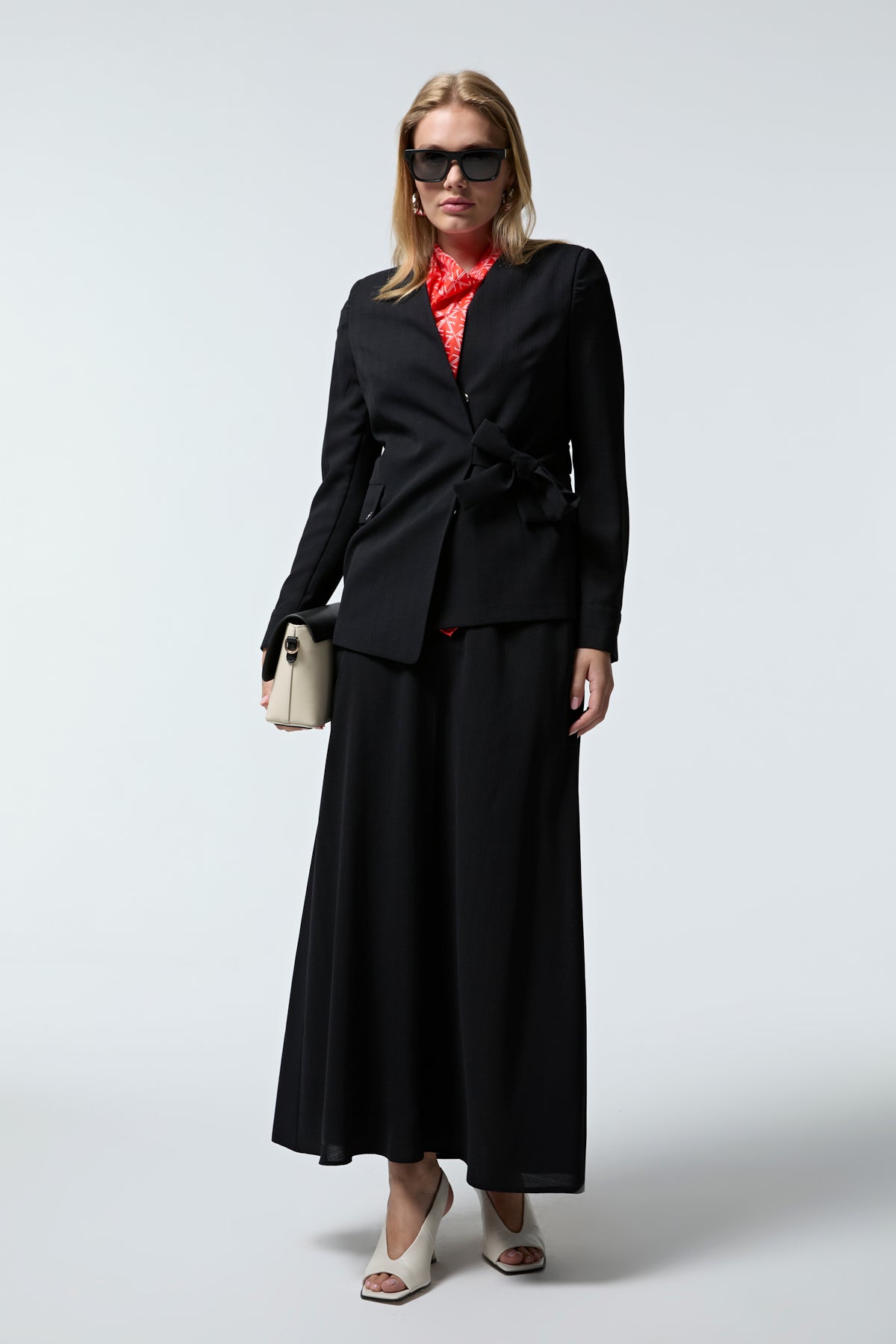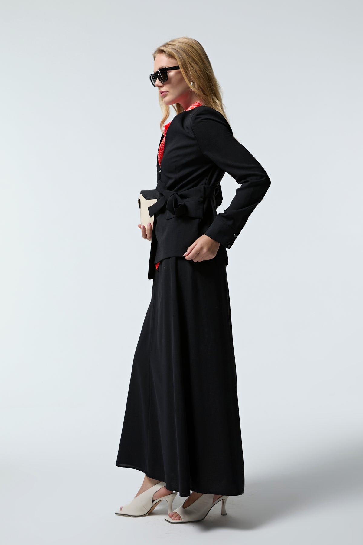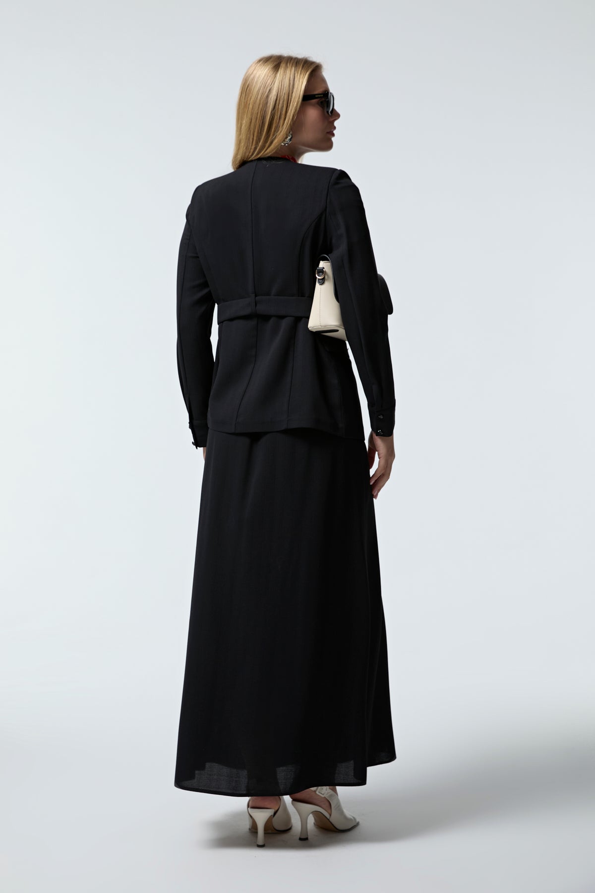 Kruvaze Yaka Kuşaklı Nakışlı Siyah Takım 1538