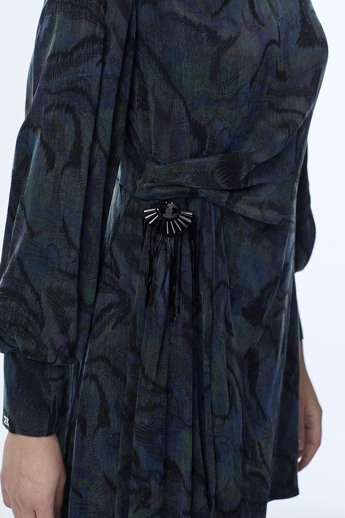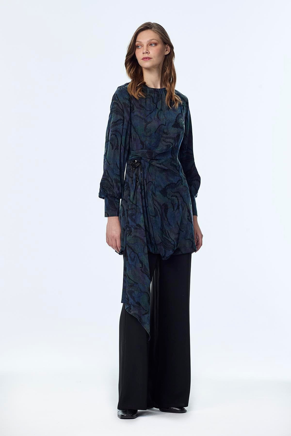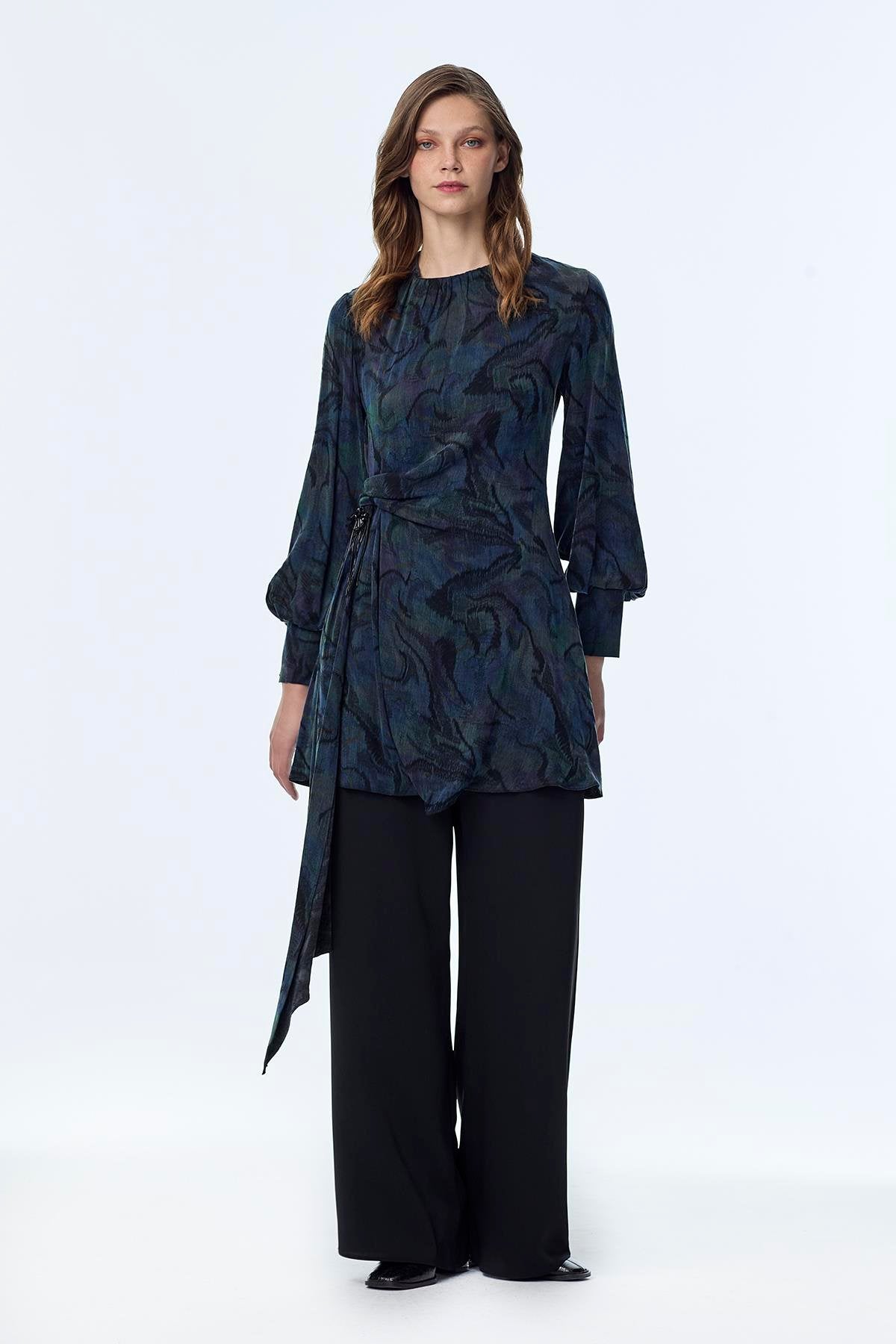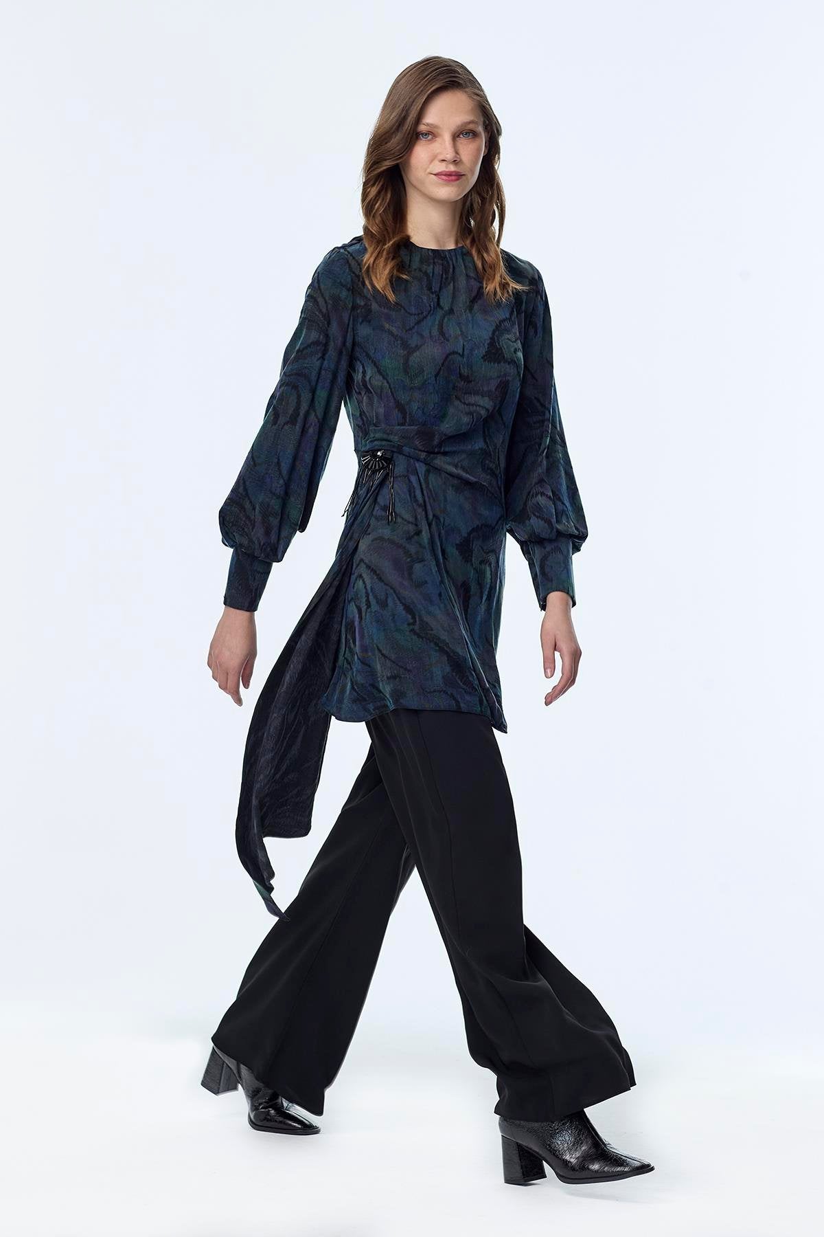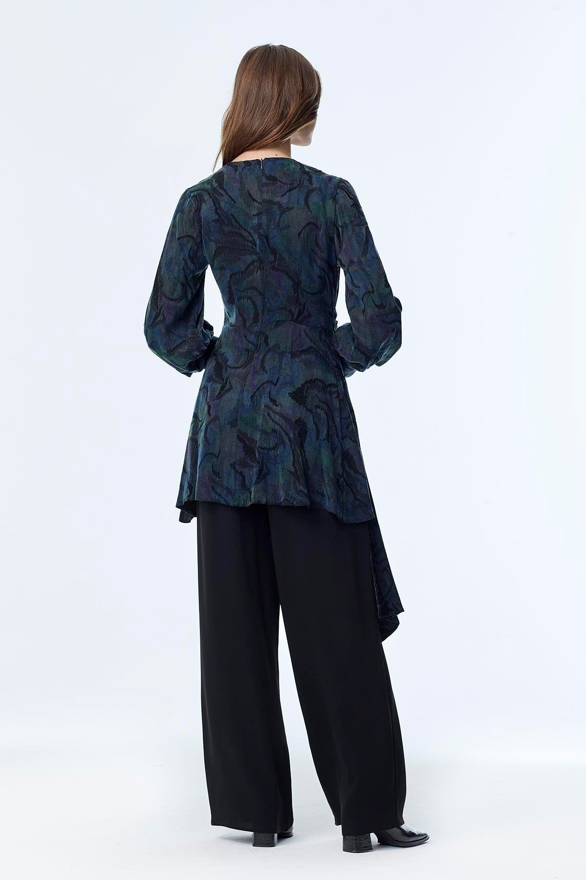 Reflecting the captivating colors of nature, this peacock-patterned two-piece set offers a sophisticated look with its modern lines and elegant accessory details. Its flowing texture ensures comfortable wear, while its chicness elevates your style for both everyday wear and special occasions.