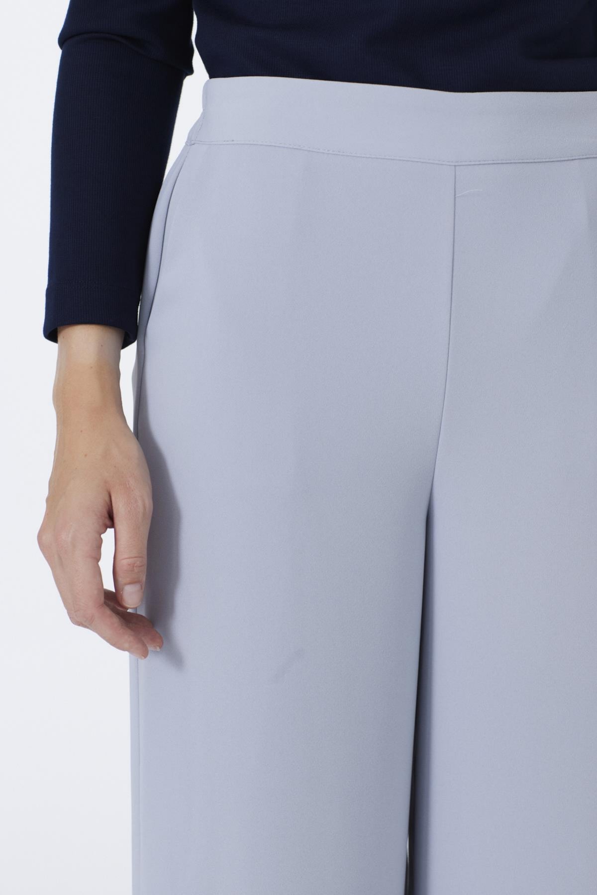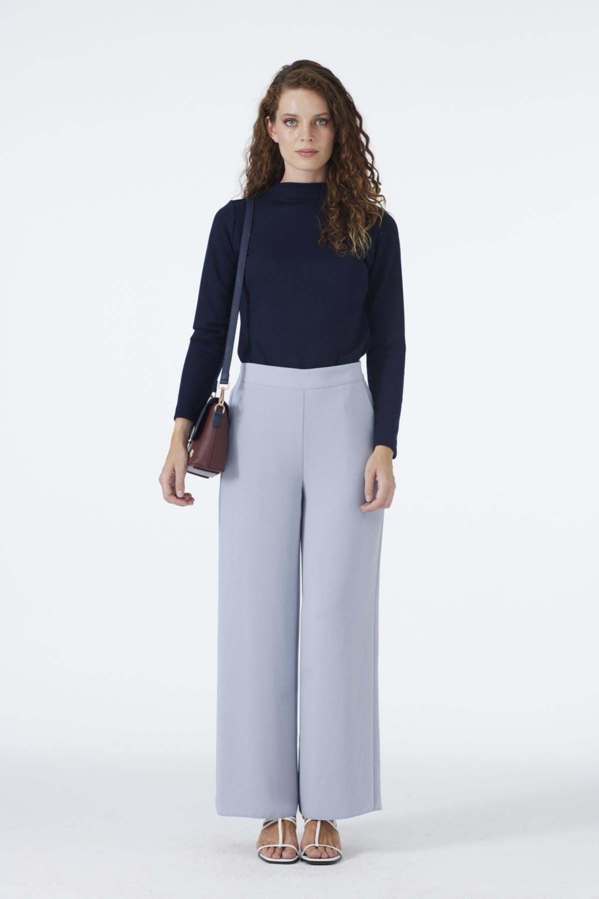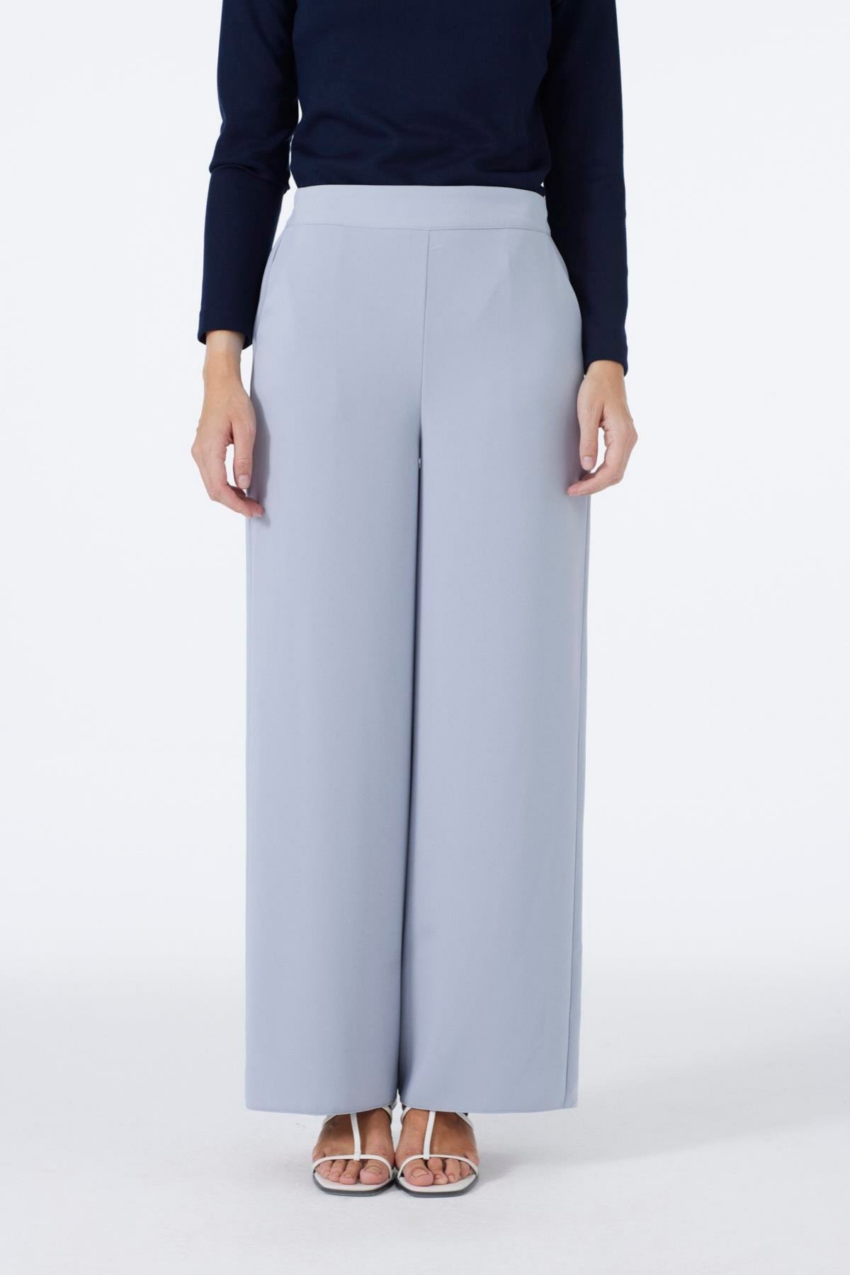 Distinguished by its elegant look and comfortable fit, these wide-leg light blue trousers offer a wide range of uses, from everyday outfits to chic styles, thanks to their soft texture and flowing structure. The high-waist cut and simple form ensure a flattering fit and provide comfortable freedom of movement.