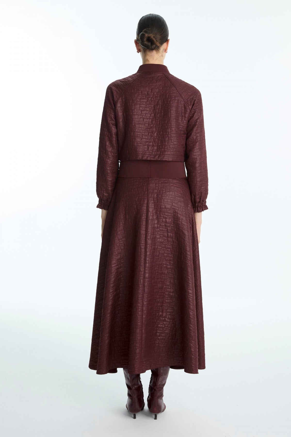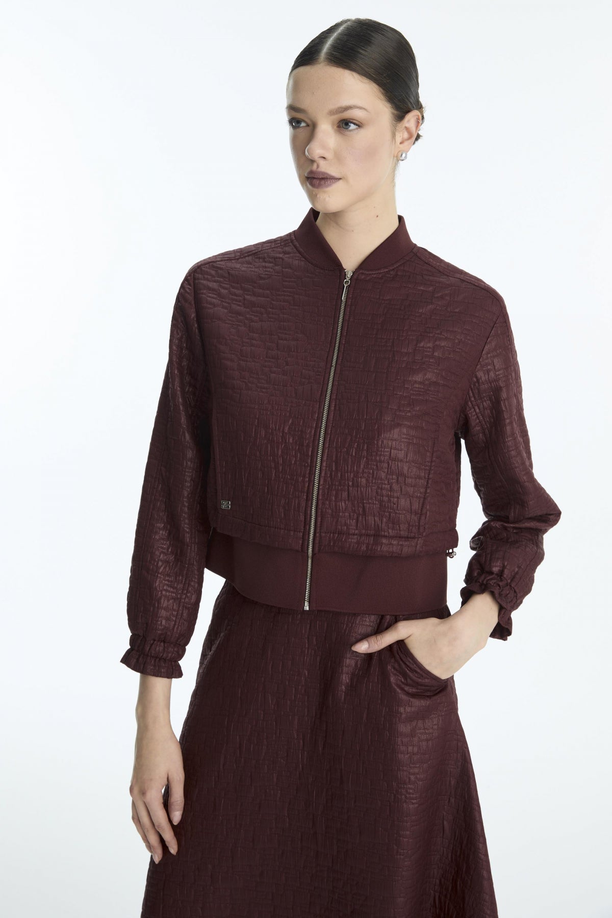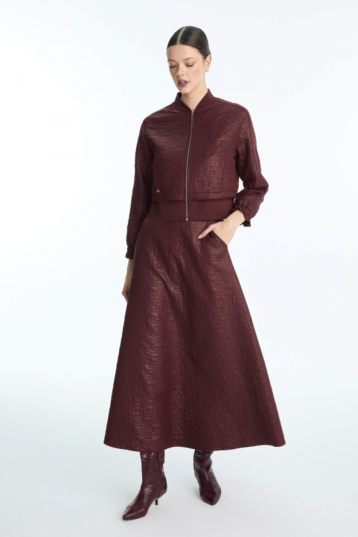 Distinguished by its modern texture and elegant burgundy color, this two-piece set offers a wide range of uses, from everyday wear to special occasions, thanks to its simple design and stylish look. The combination of a zippered jacket and a long skirt provides both comfort and understated elegance.