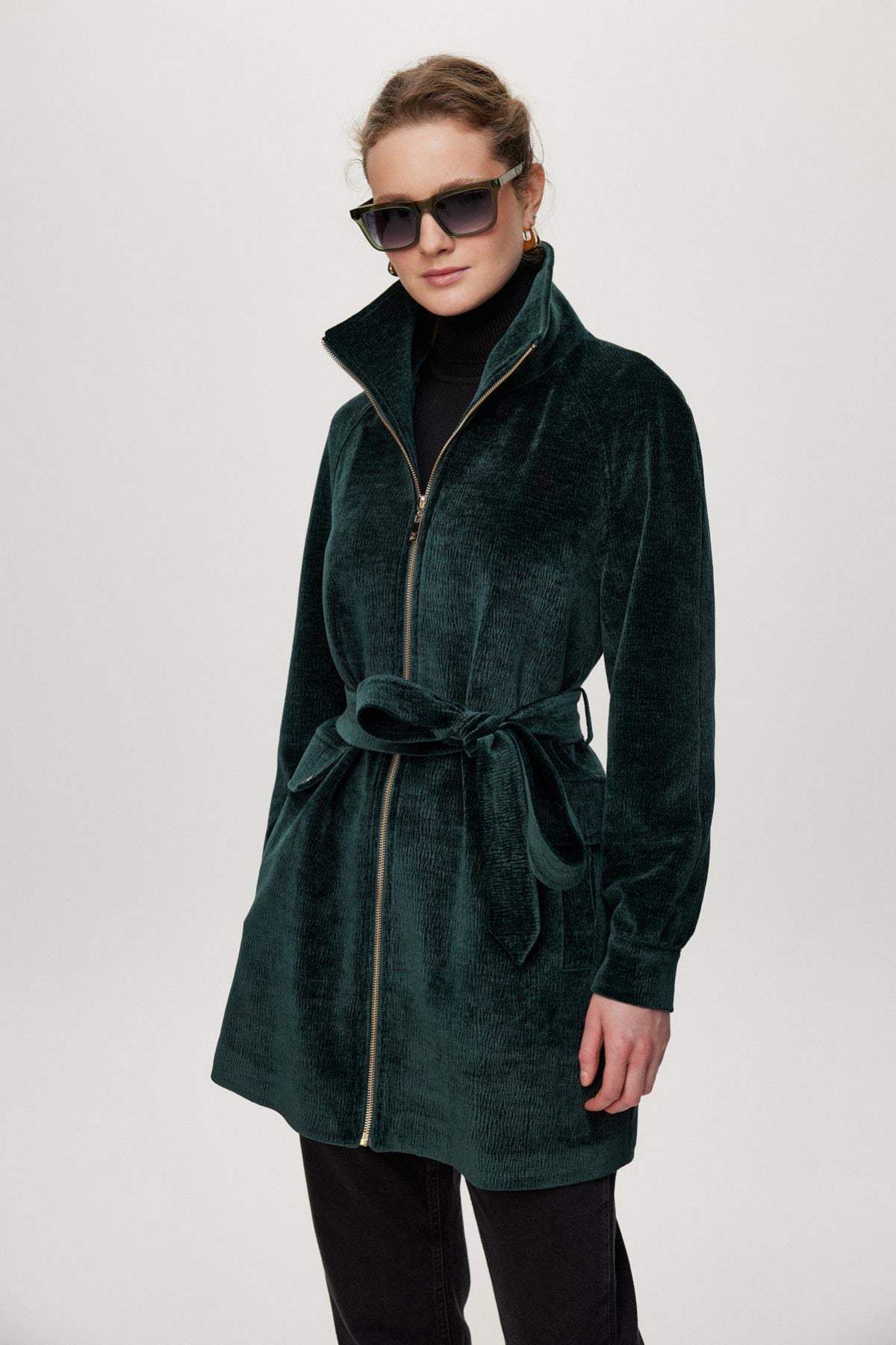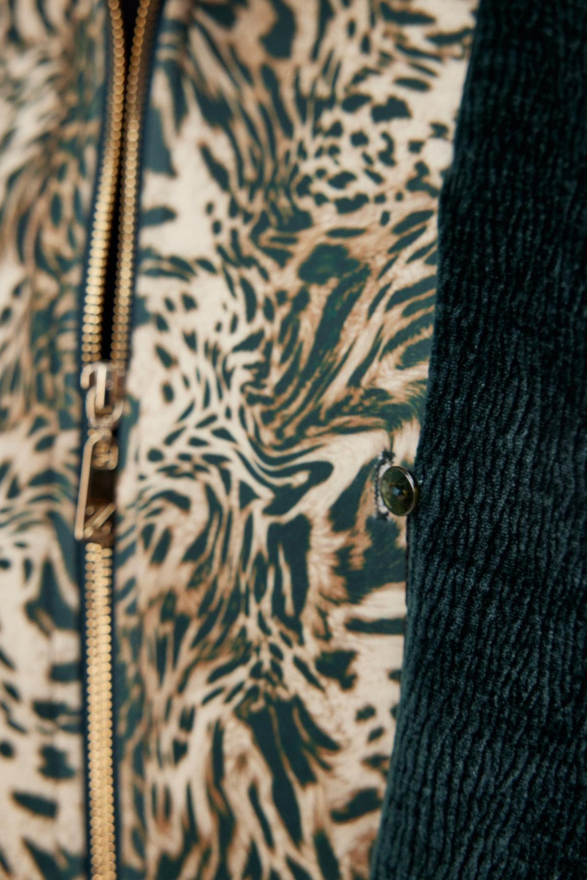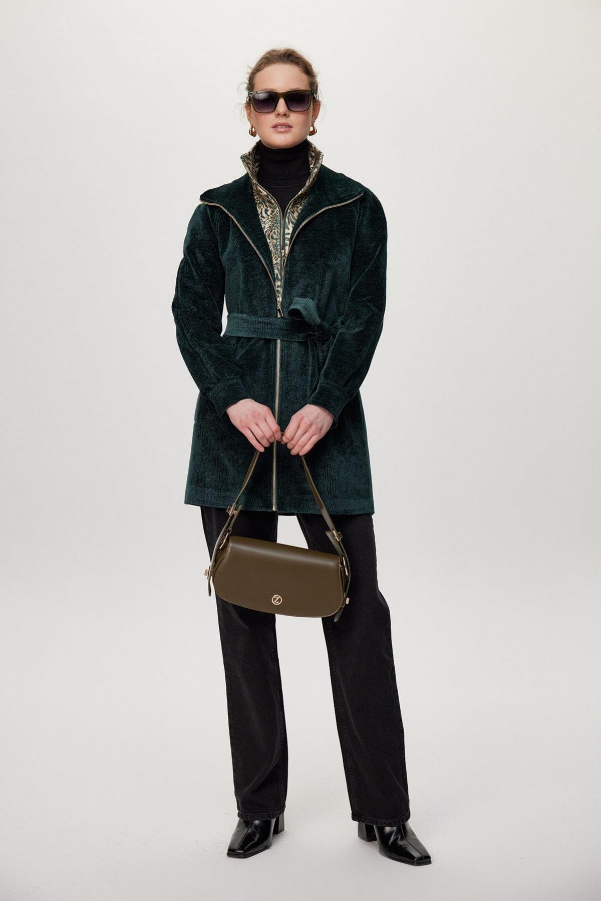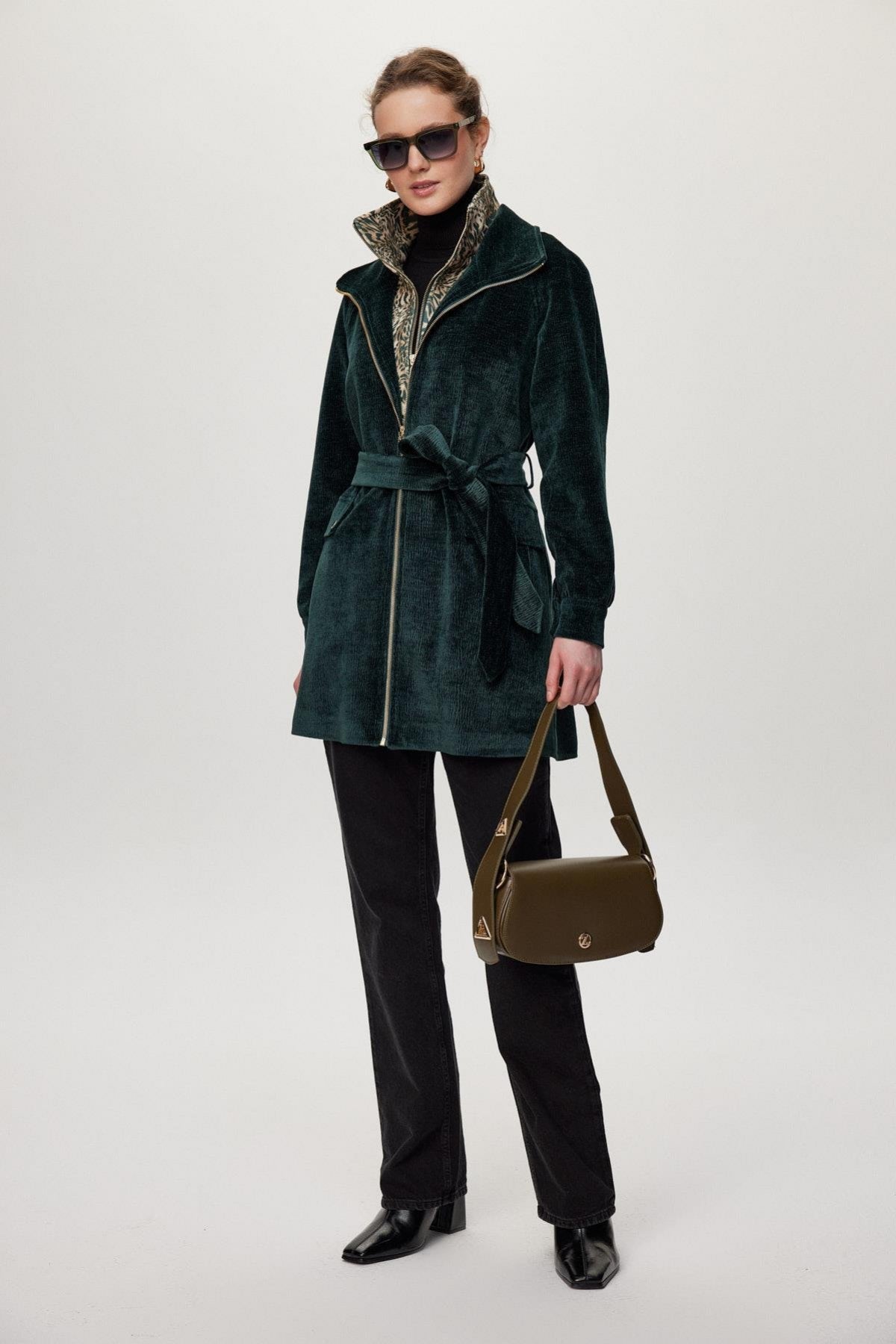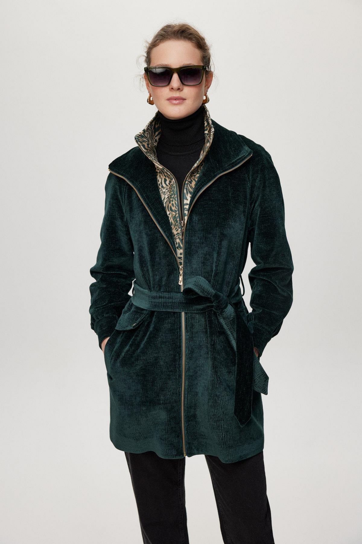 Featuring a modern design and leopard print detail on the inside, this jacket combines comfort with style thanks to its soft fabric and zipper. The belt tie at the waist elegantly accentuates your figure, making it a potential must-have piece for urban style.