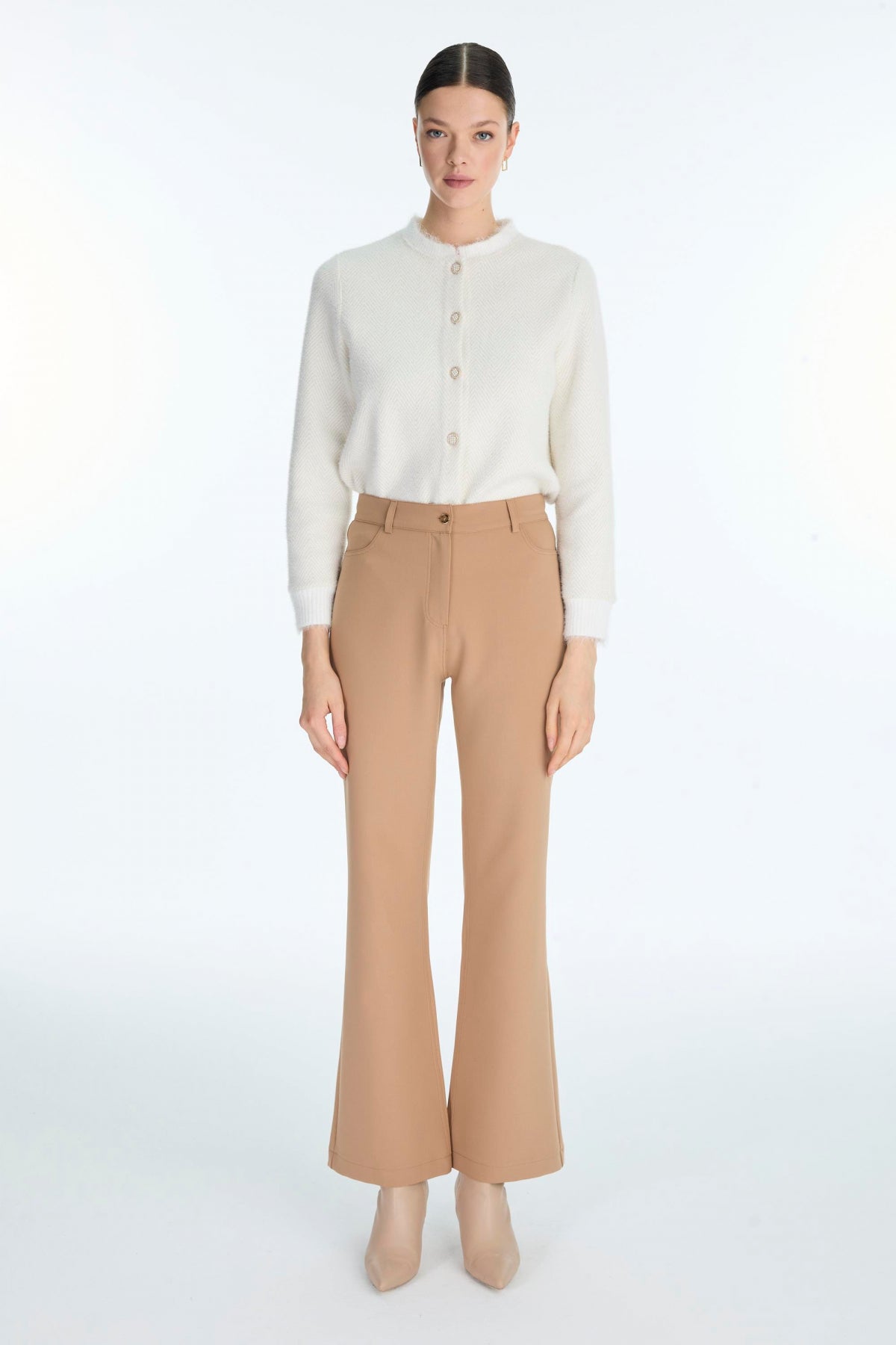 Featuring a modern and simple design, our high-waisted straight-leg trousers in a camel tone offer style and elegance. Suitable for both everyday and office outfits, these trousers create a comfortable yet elegant silhouette thanks to their high waist and straight cut.