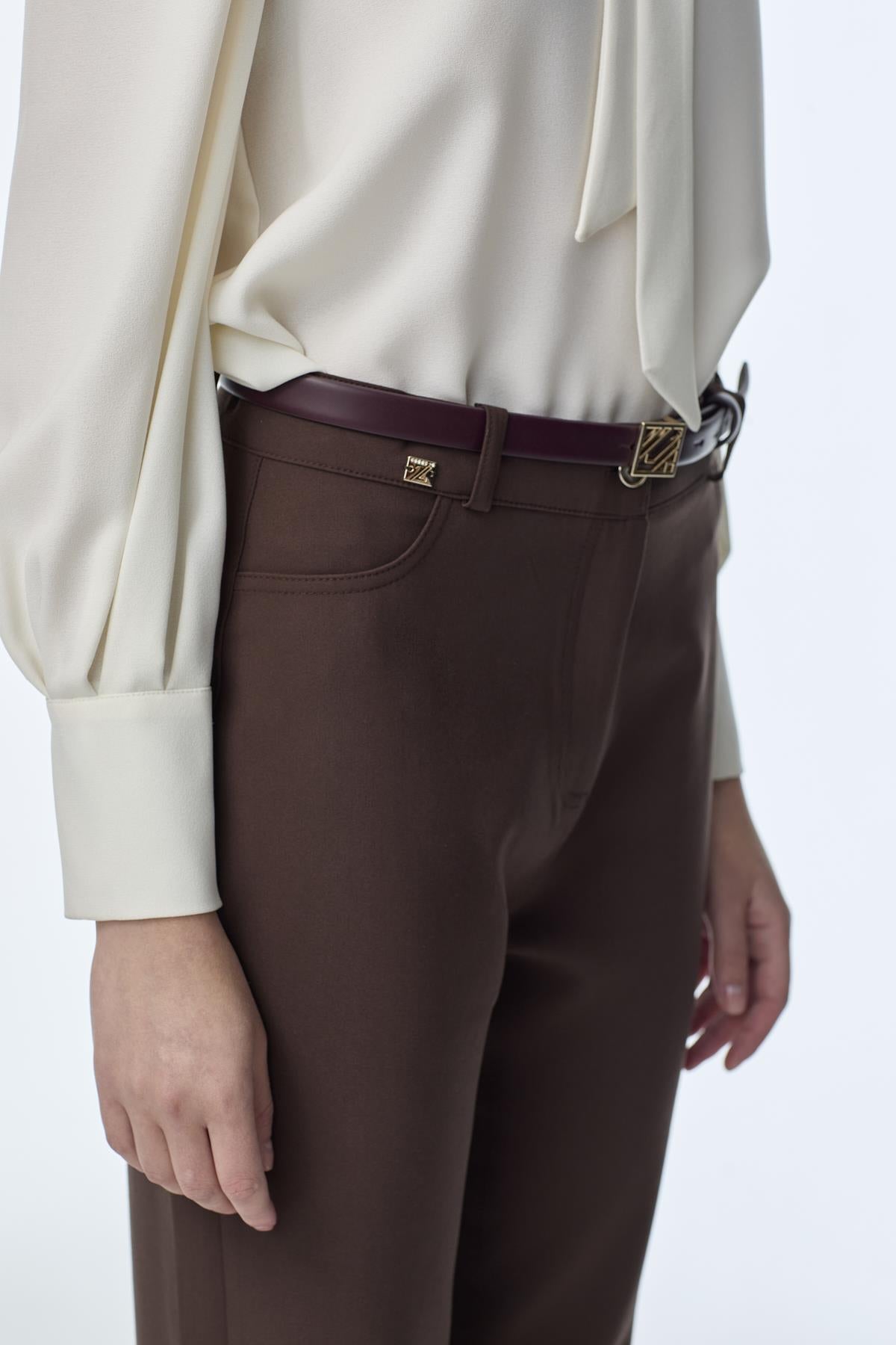 Featuring a modern and simple design, our high-waisted straight-leg trousers in a camel tone offer style and elegance. Suitable for both everyday and office outfits, these trousers create a comfortable yet elegant silhouette thanks to their high waist and straight cut.