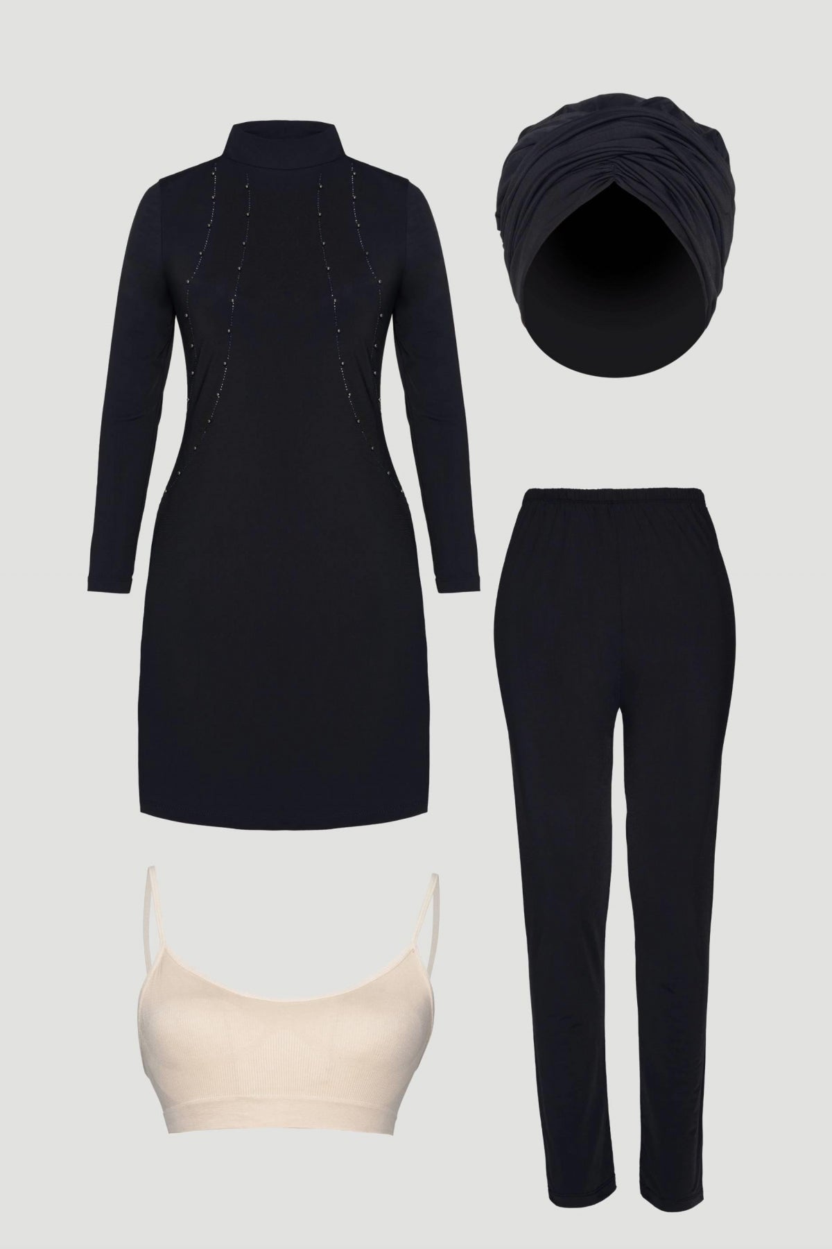 • Package Contents: The set consists of 4 pieces: top, leggings, bonnet, and bustier.