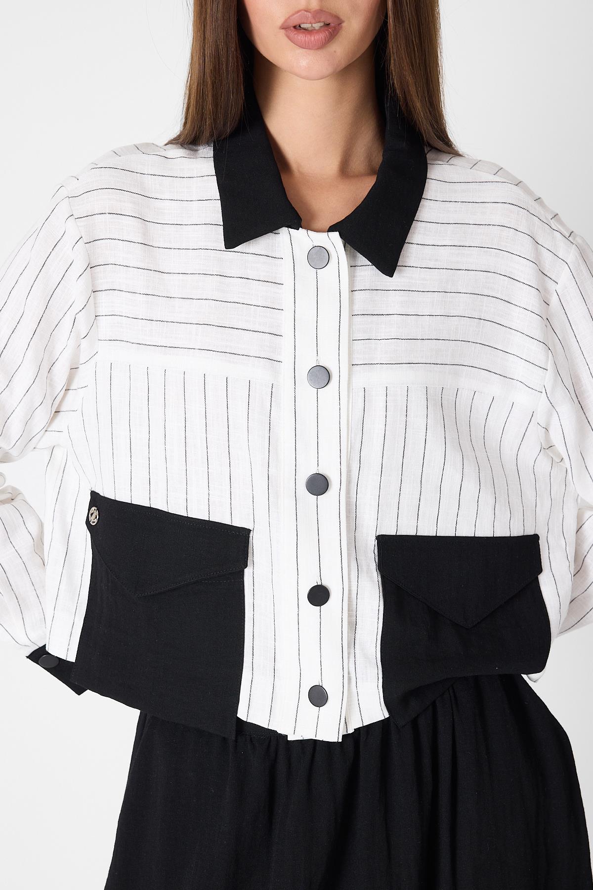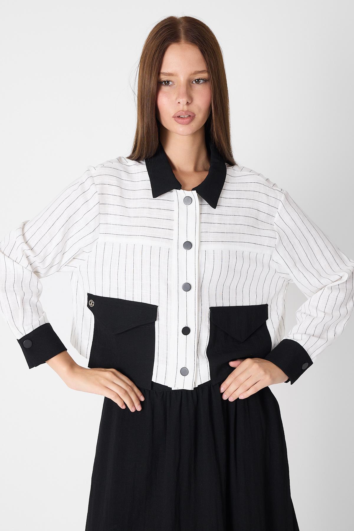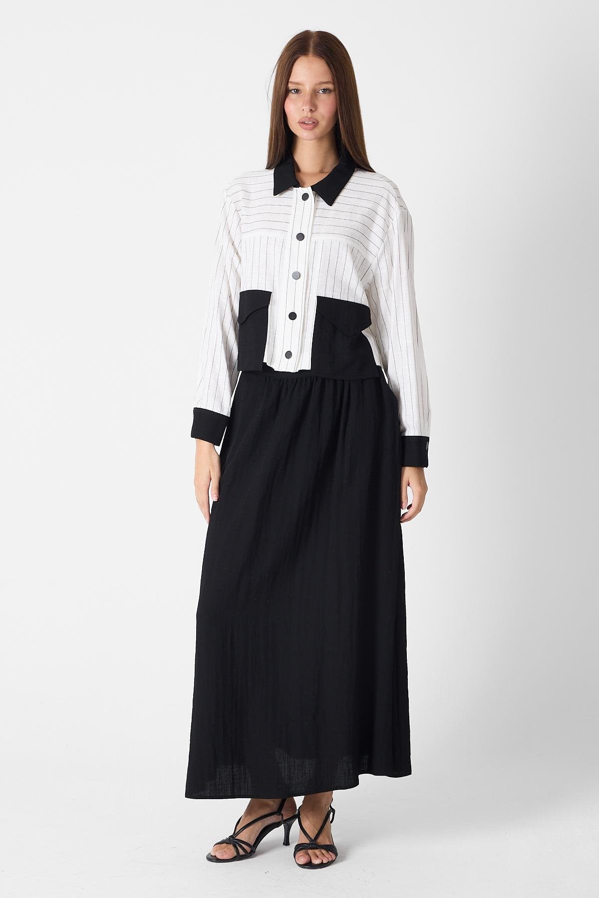 Reflecting the harmony of black and white, this set stands out with its modern lines and embellished design. Its striped texture, large-pocketed top, and balloon-shaped skirt offer a unique and original look. It can be easily worn for both everyday outfits and special occasions.