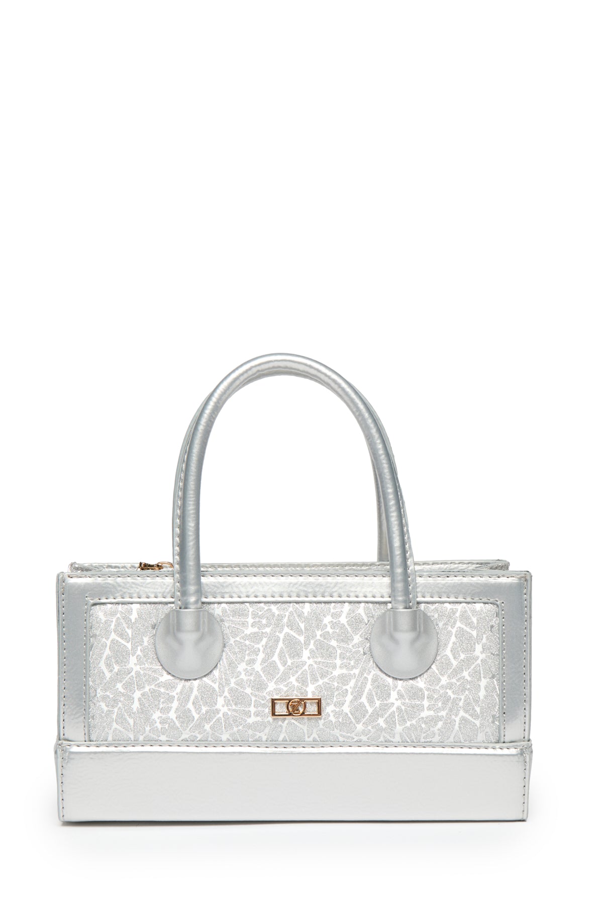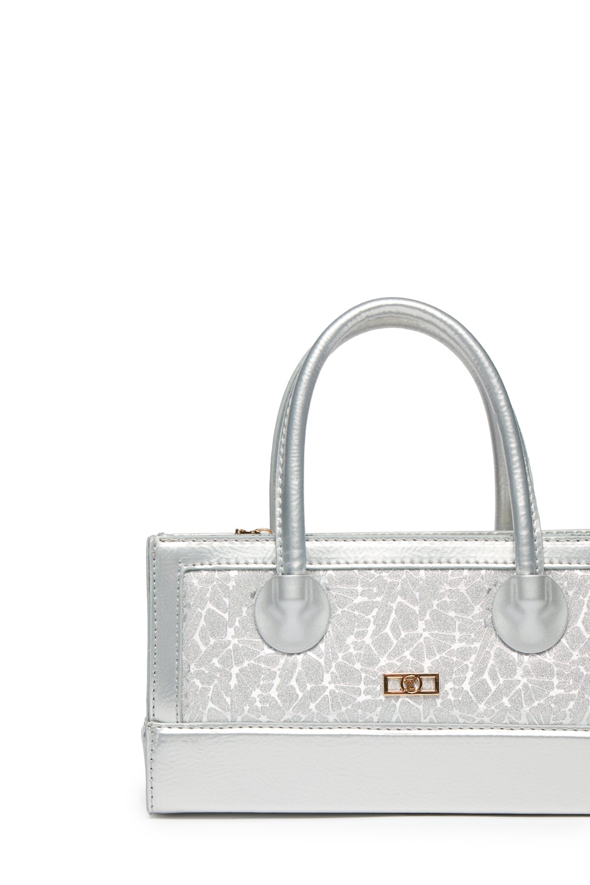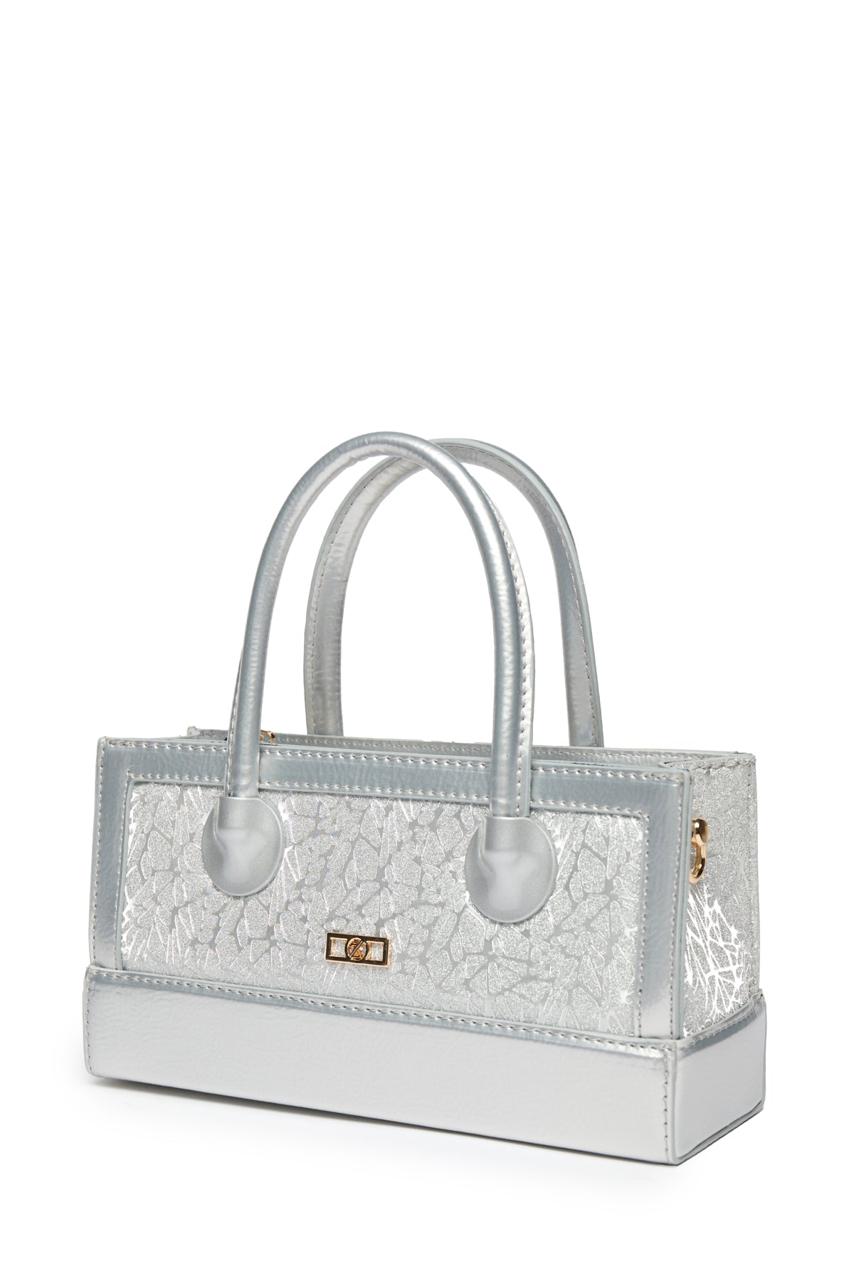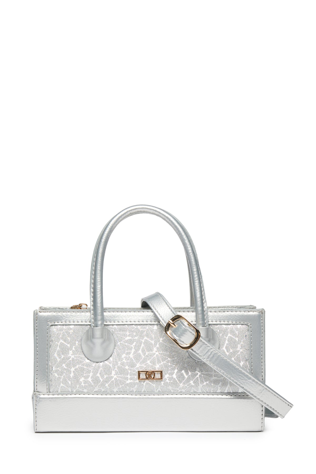 Distinguished by its glossy texture and eye-catching glittery front, this bag model offers a modern and bold style thanks to its box shape and metallic gray tone. Designed for both hand and shoulder carrying, it features a zipper and adjustable strap.