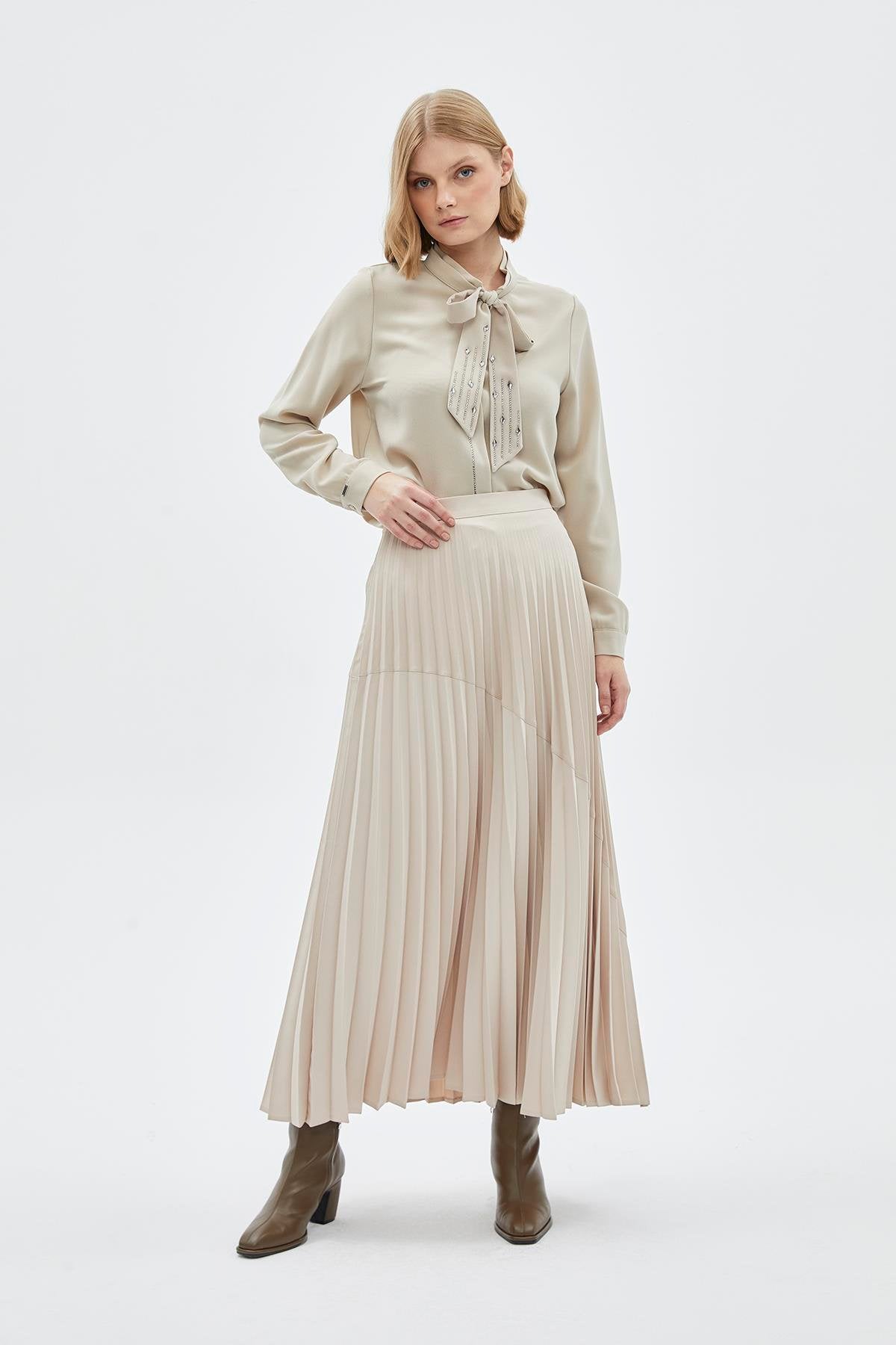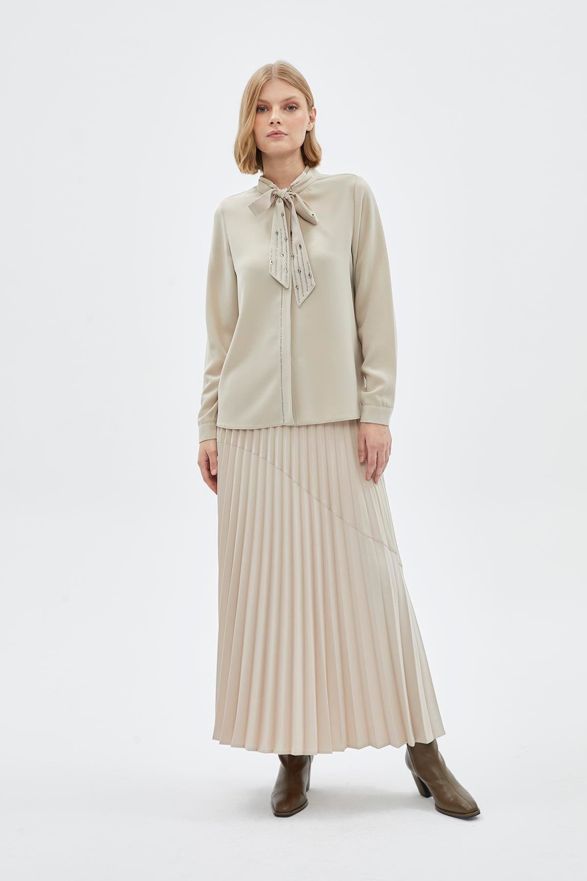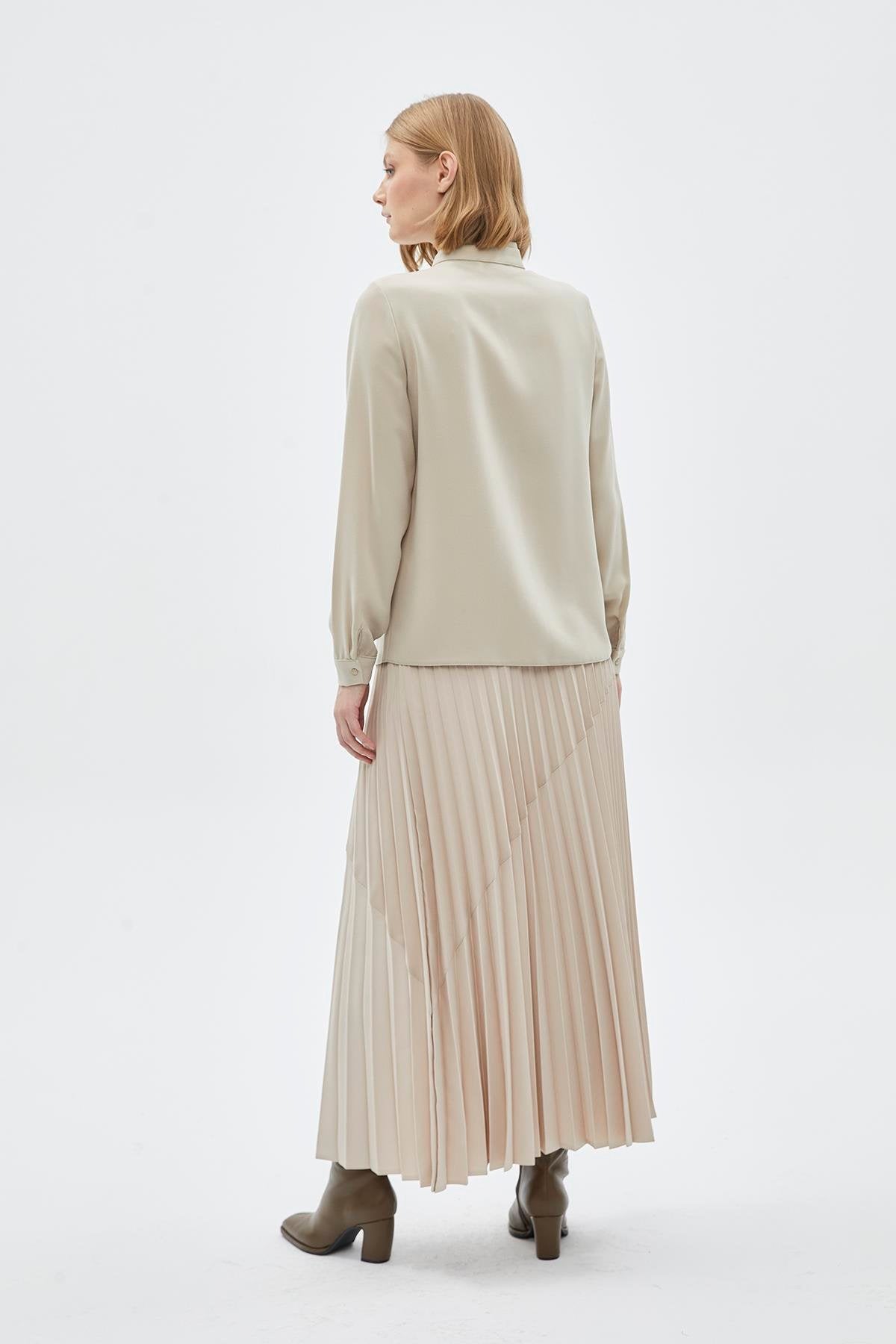 Fiyonk Yaka Uzun Kollu Gömlek Bej Gömlek 0088