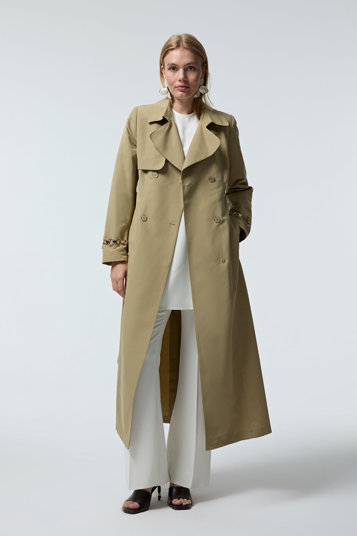 Ürün Detayları: Kruvaze yaka, Önden düğmeli, Belden kemerli, Manşet aksesuar detaylı, Uzun kollu, Düz kesim, Uzun model