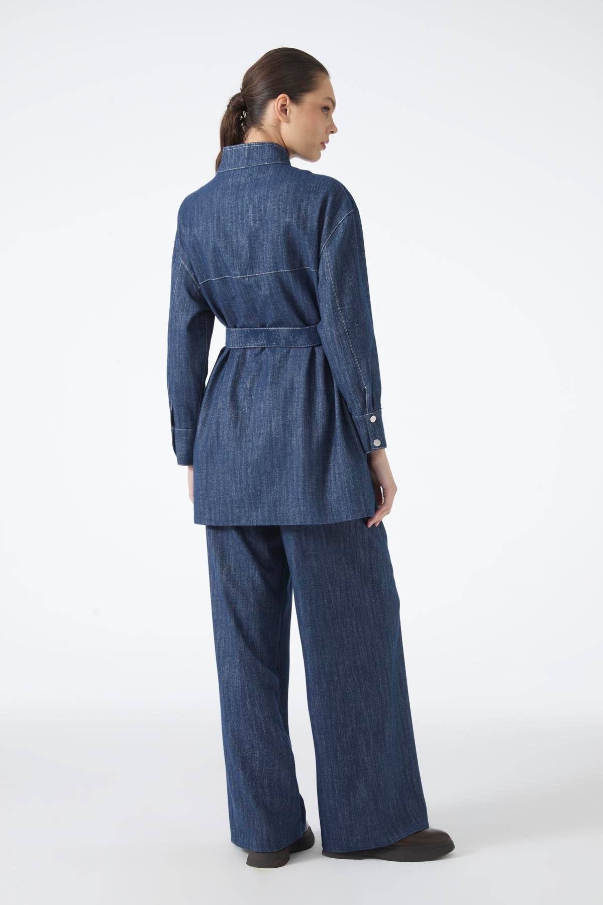 Kuşaklı Ceket Pantolon Ikili Lacivert Takım 1718