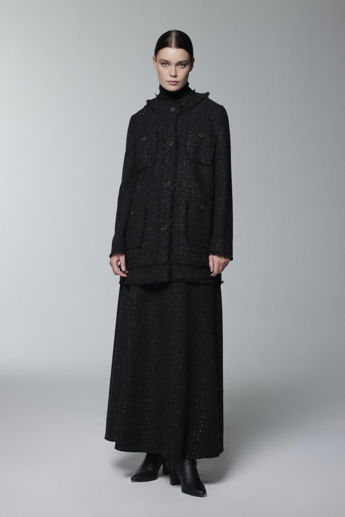 Tweed dokulu kumaş, Düğmeli kapanış, Dört adet cep, Rahat kesim